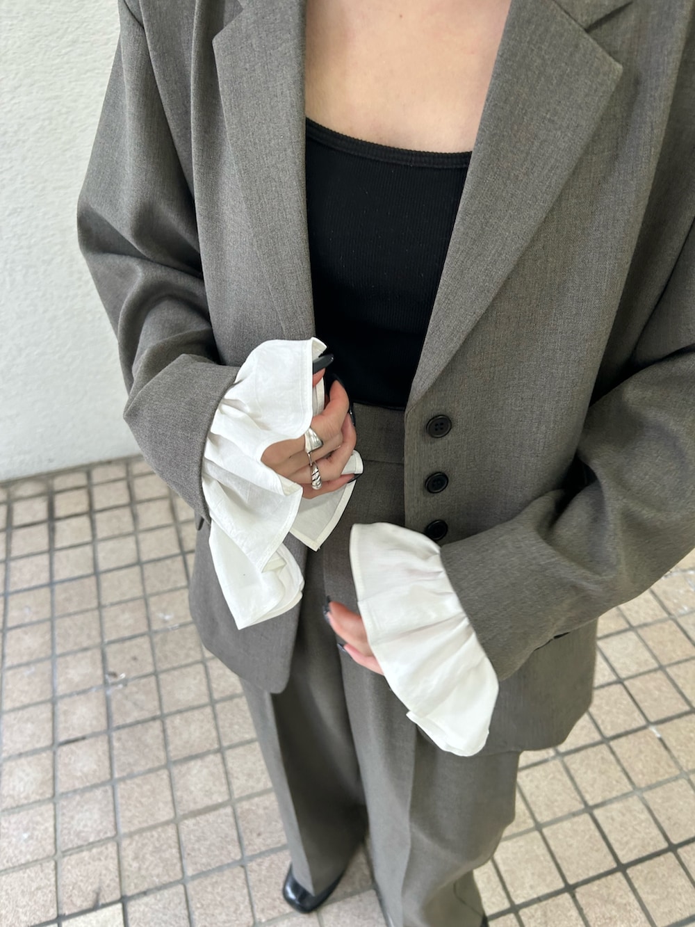 袖口のフリルがアクセントになるジャケット