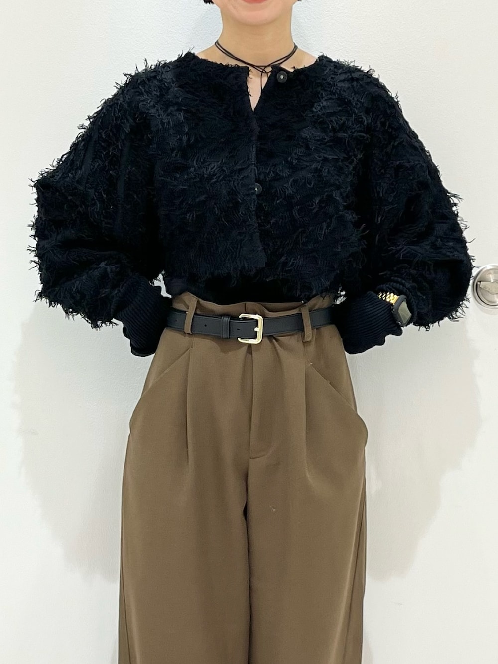 フリンジが華やかなコーデにしてくれるカーディガンです。丈が短めなので低身長の方もスタイルアップのバランスです!
