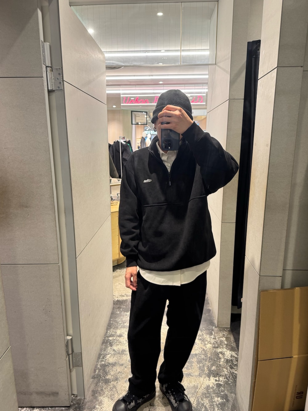 ラフになりすぎないように、中にはシャツを着ています👍トップスのハーフジップはドローコードも付いているのでお好みの丈感で着用することができます!