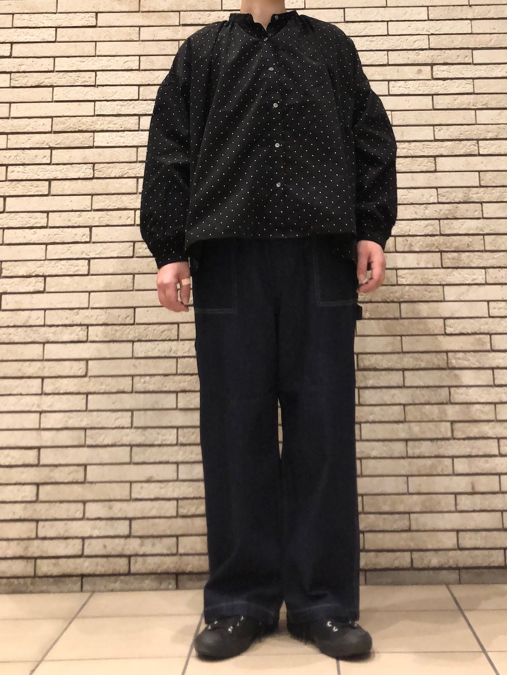 ドット柄のブラウスにデニムを合わせた大人カジュアルな装いです。