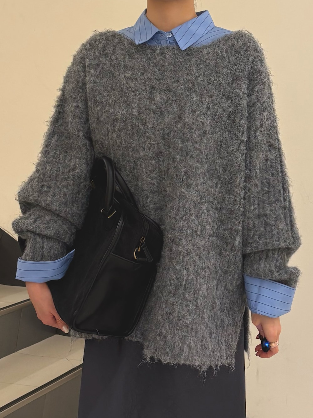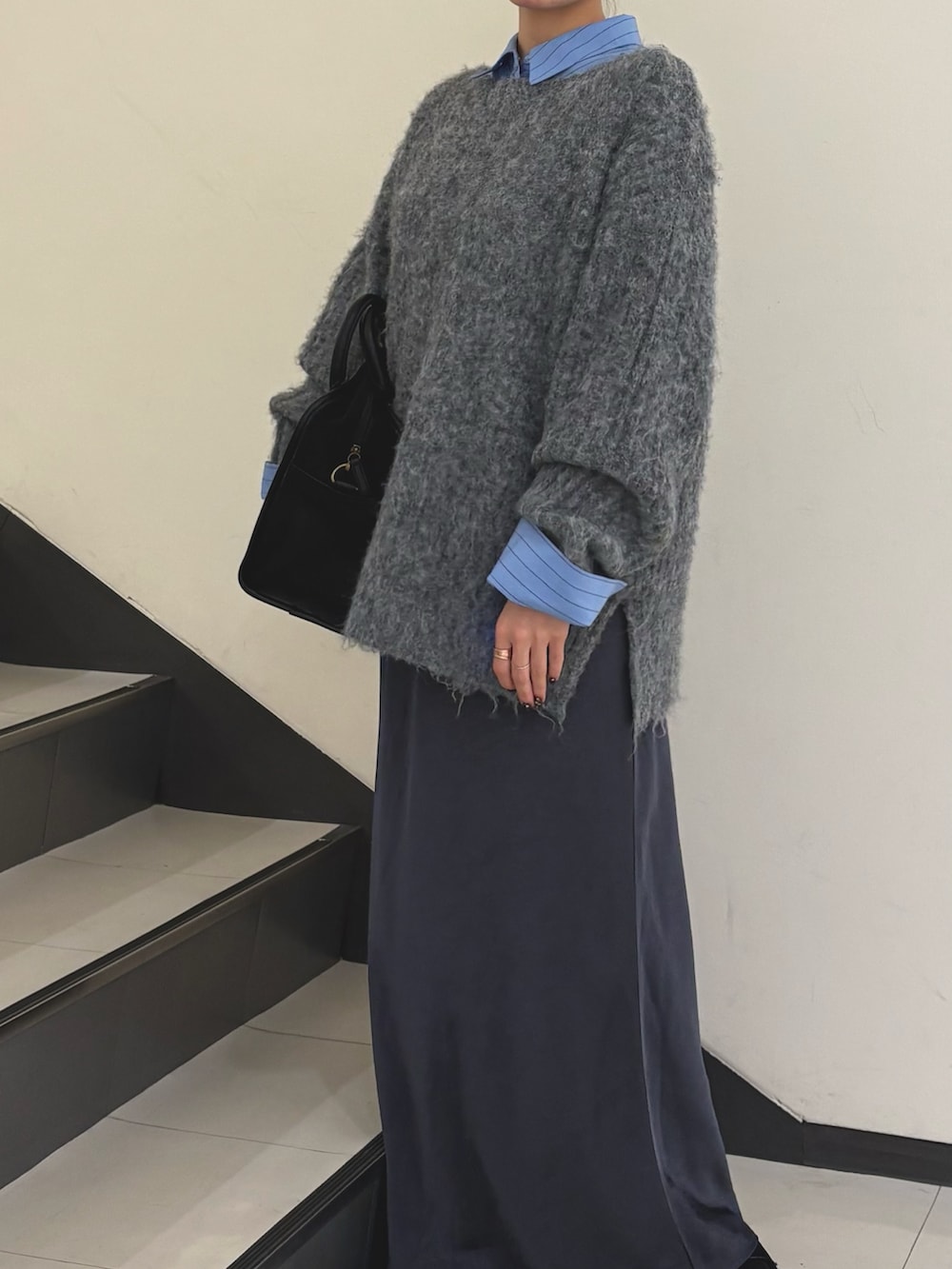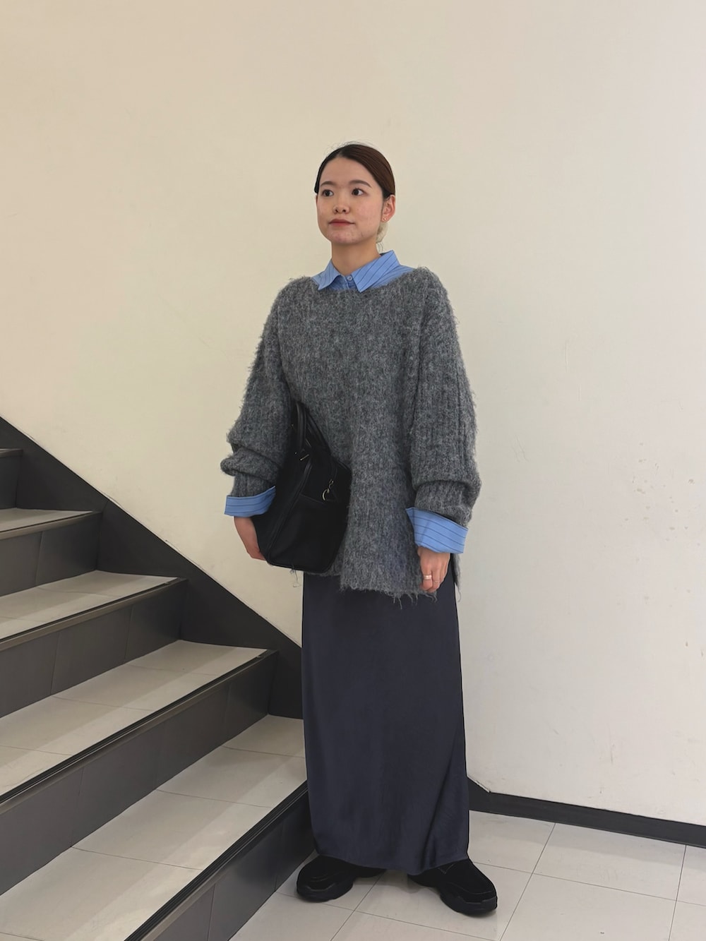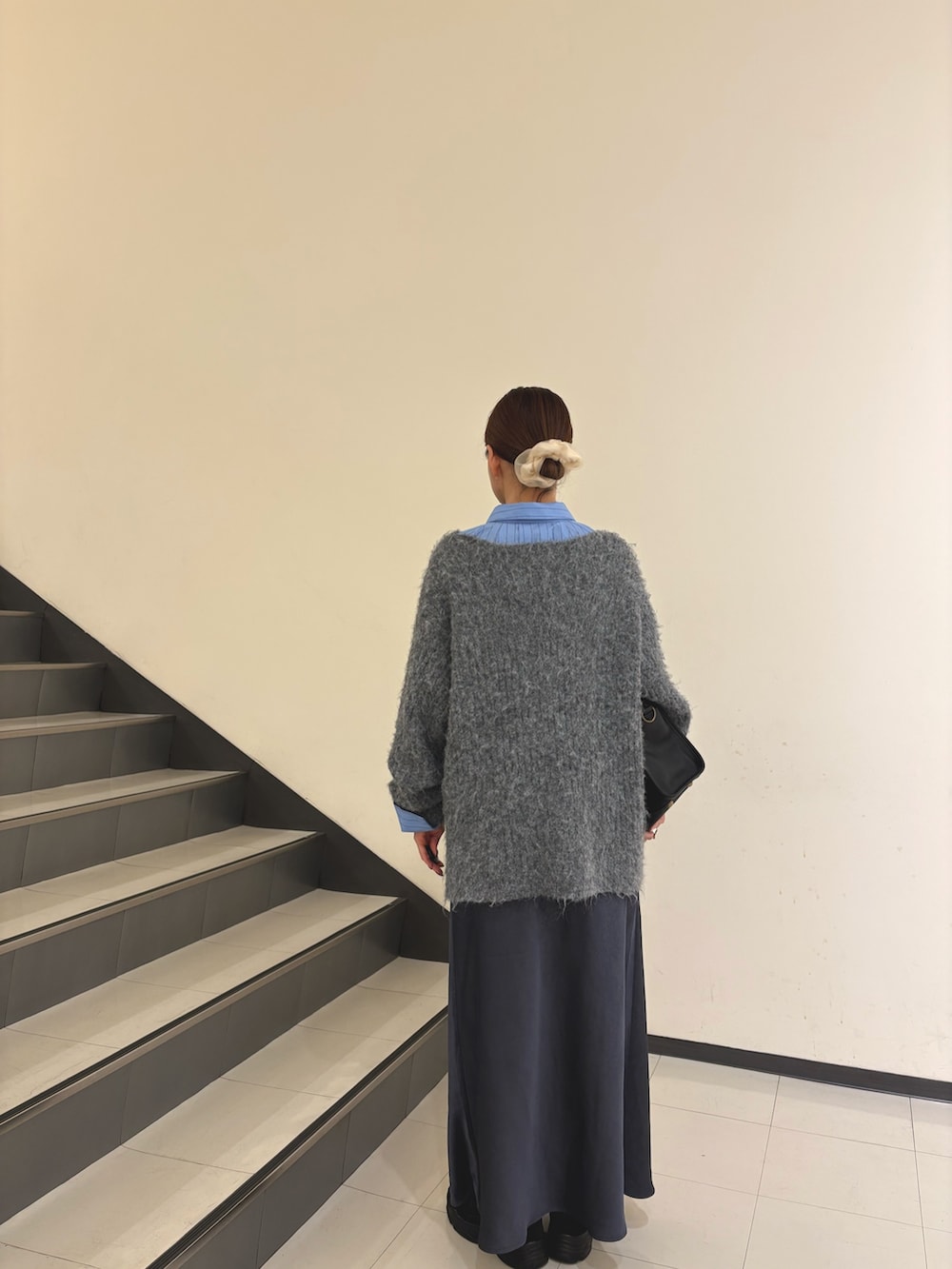 全体的にゆるっとしたシルエットなので髪はアップスタイルでお袖も少しまくって抜け感を出すのがポイントです♫