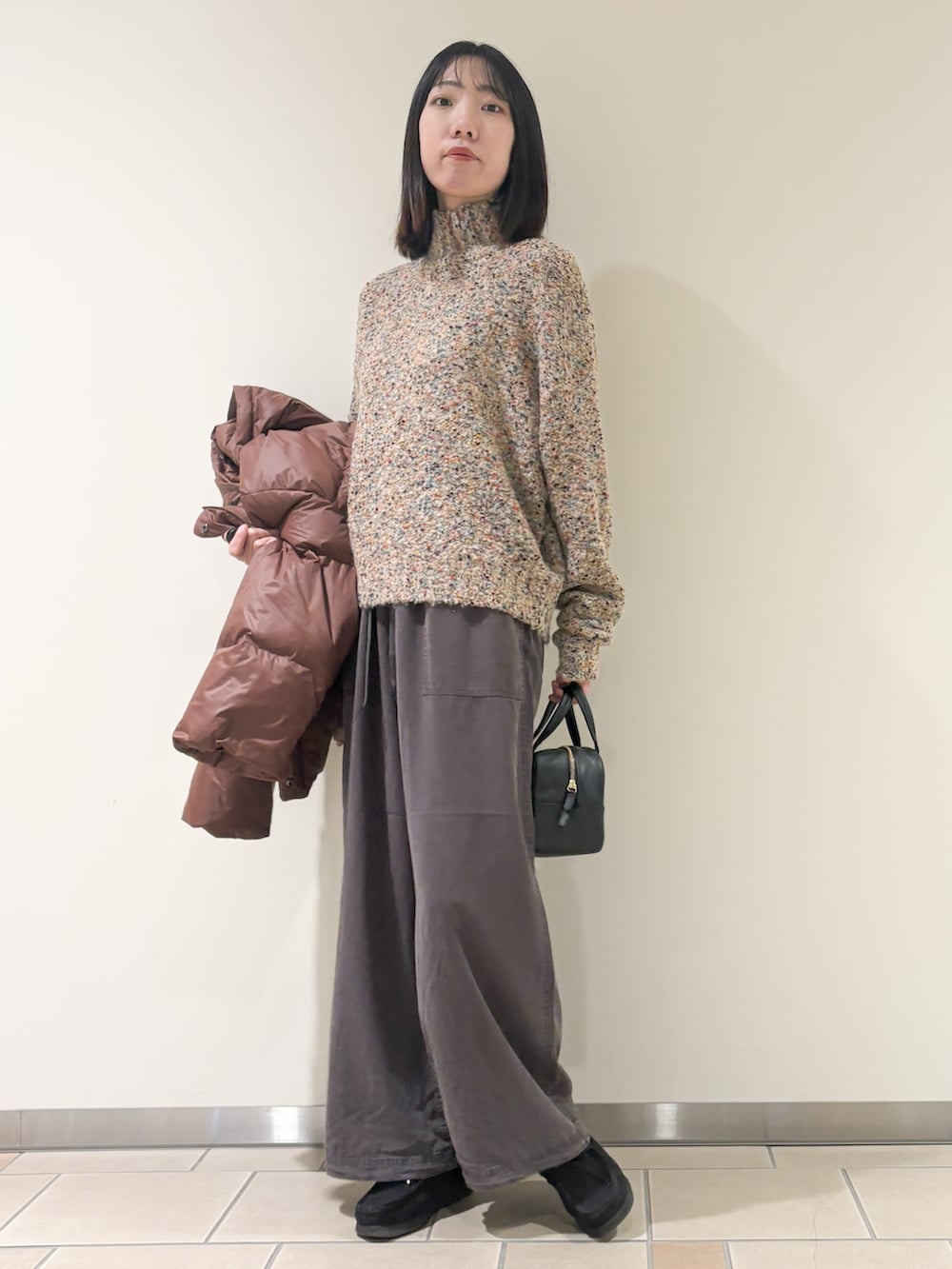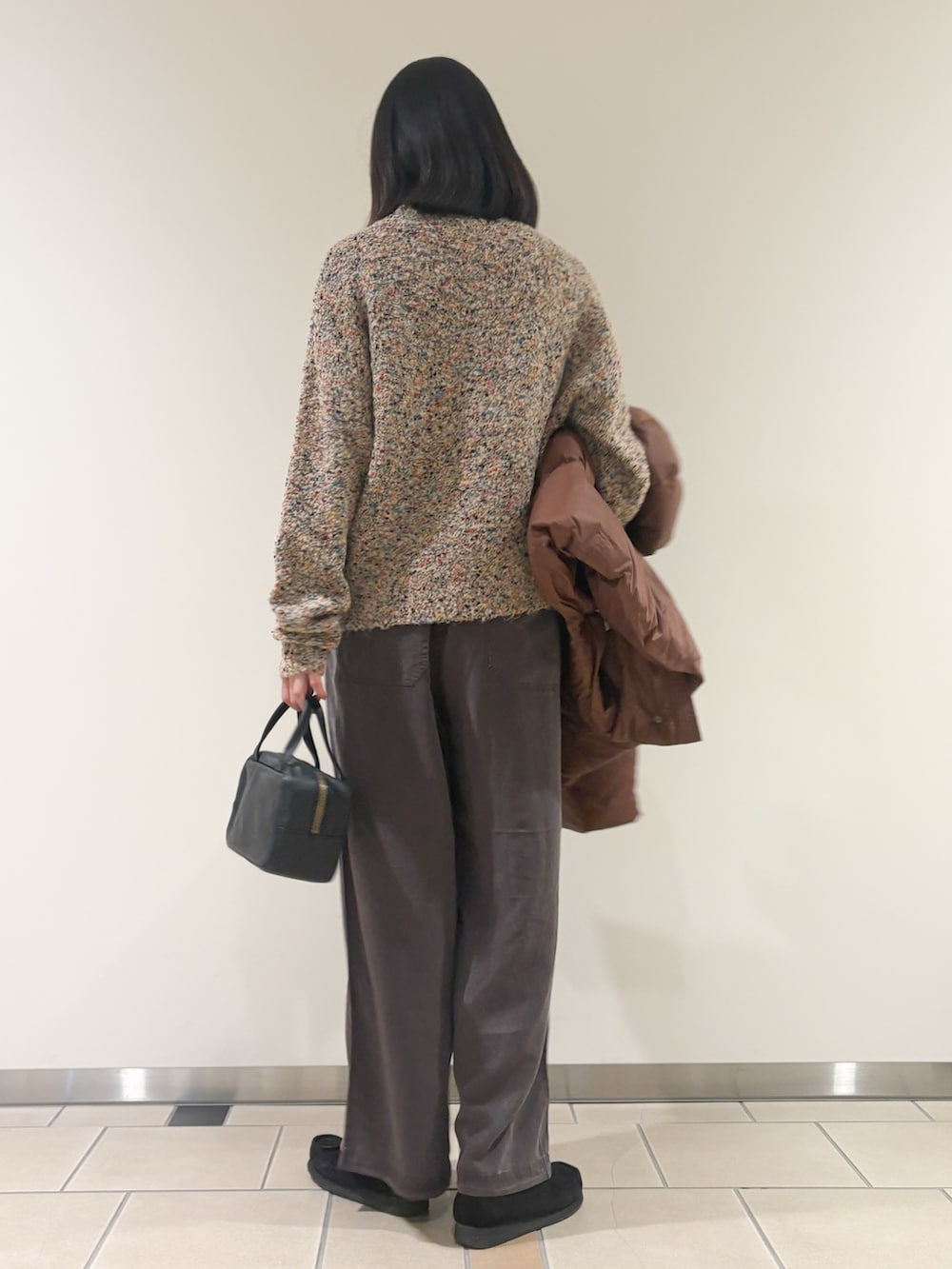 中にはネップデザインが1枚で映えるニットを合わせました!柔らかい着心地で個人的にはちくちく気になりませんでした!そこまで肉厚ではないのてパンツにインしてスッキリ合わせました♩