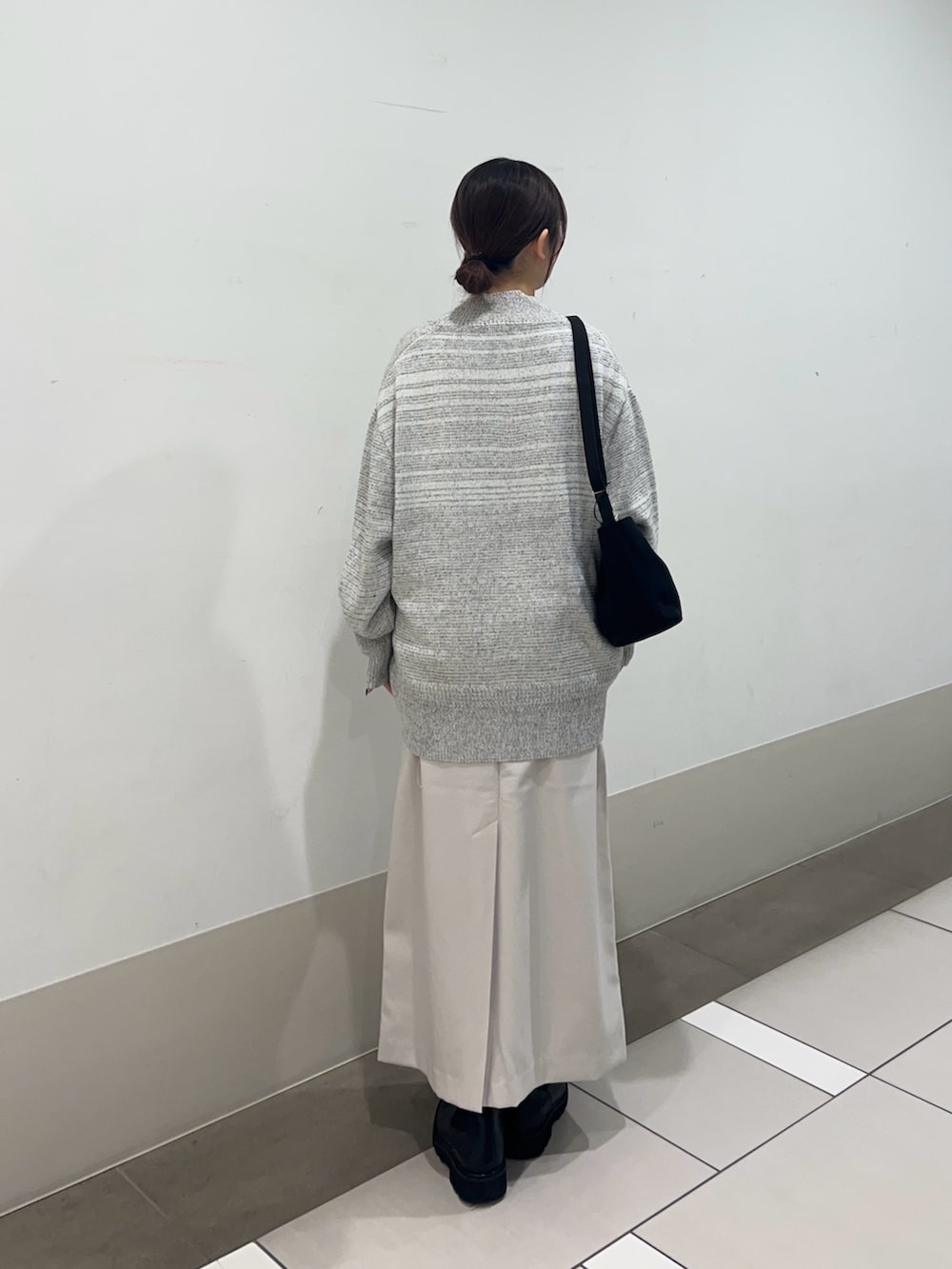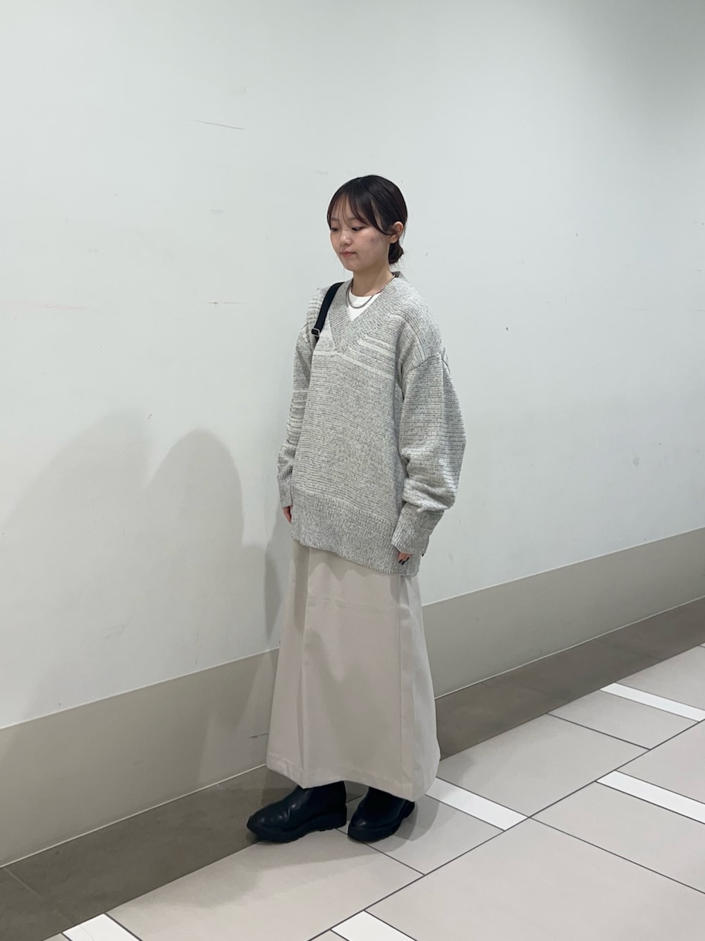 Vネックで肩の落ちたデザインなので、ストレートスカートを合わせて、より女性らしいコーデにしました◎