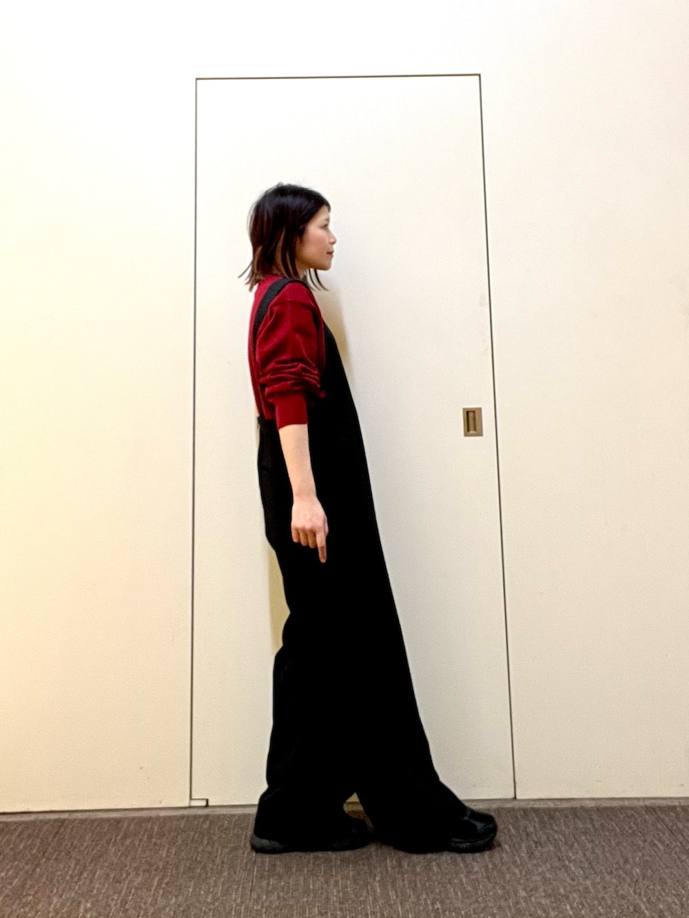 サロペットは落ち感のある素材なのでゆったりシルエットですがすっきり見えます◎深めのUネックなのでインナーのデザインで雰囲気を変えて着ていただけます!