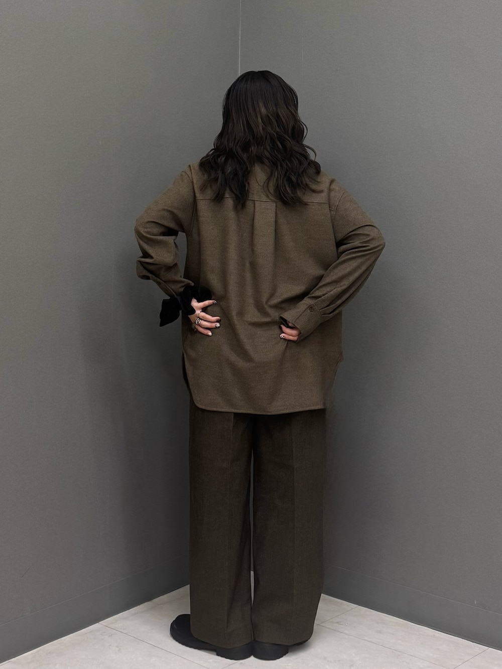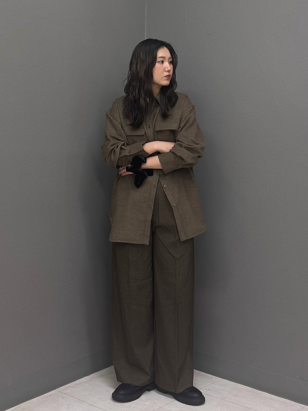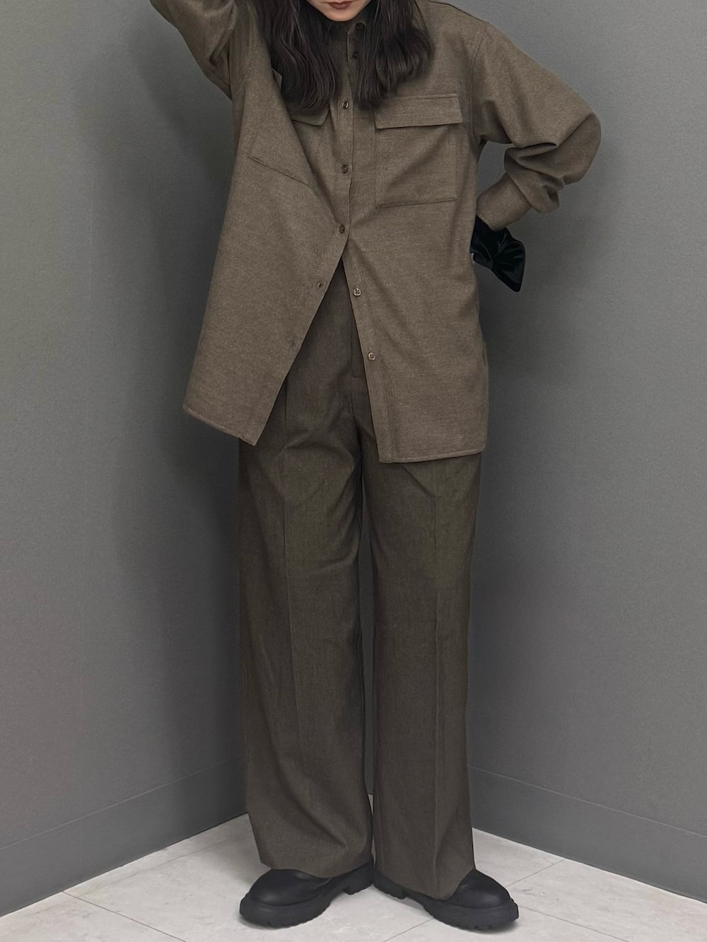 パンツも暖かみのあるウールライク素材を合わせてセットアップ風に