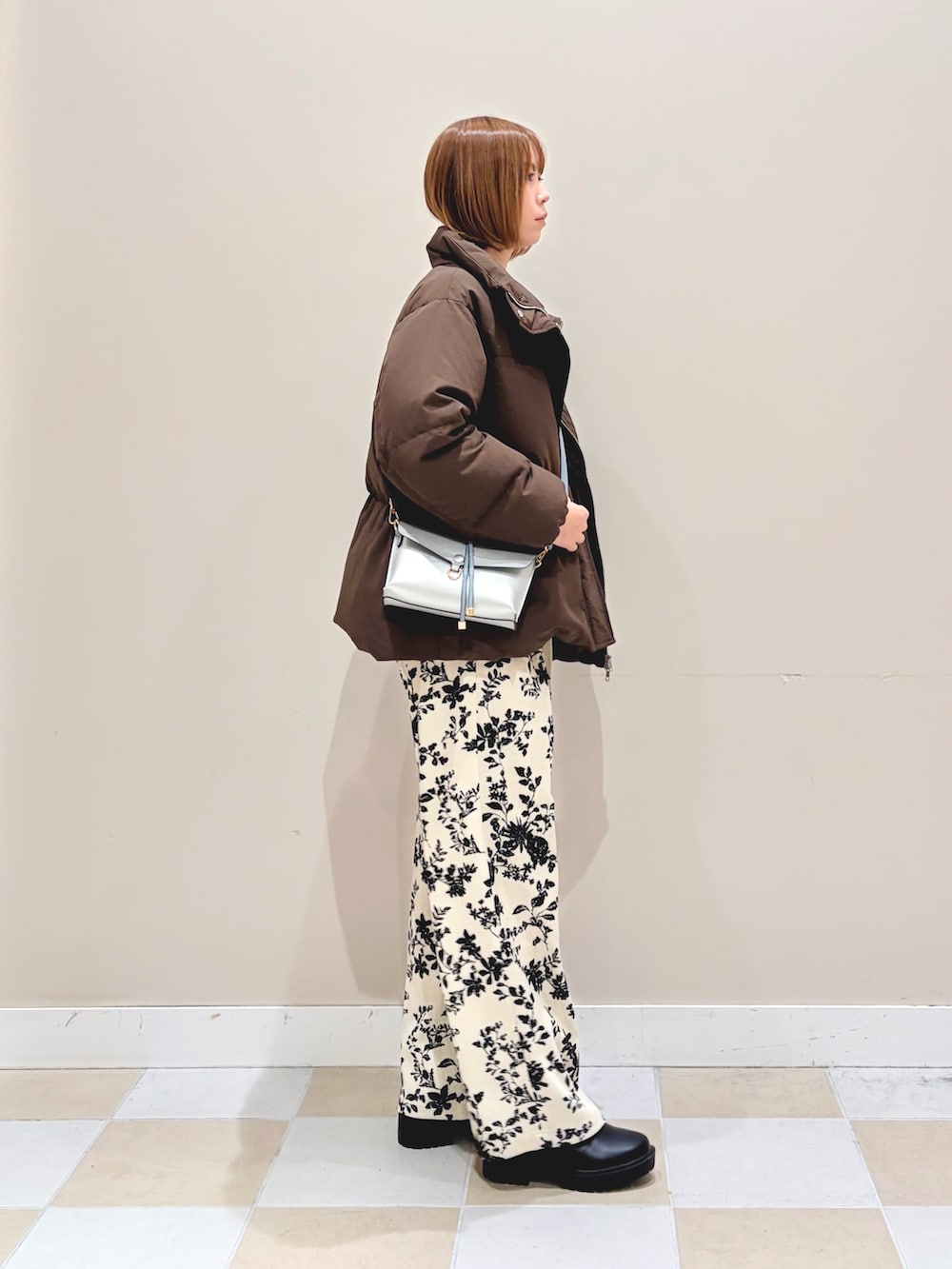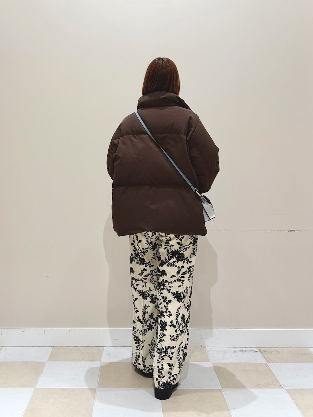 少し長めでゆったり羽織れるスタンドカラーダウンジャケットに柄コーデュロイパンツでラフなパンツスタイルにしました。