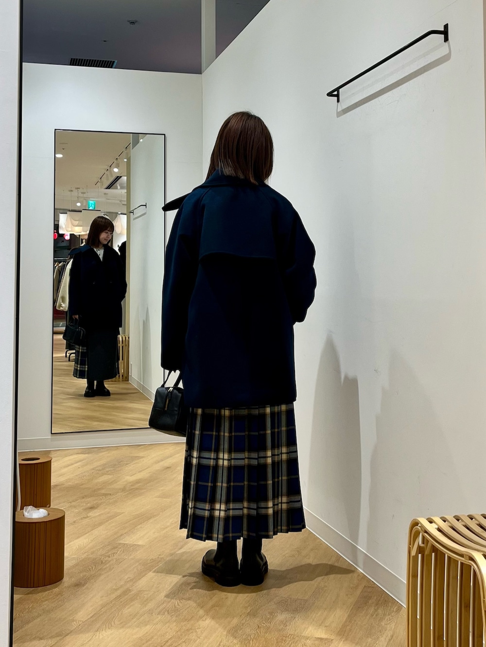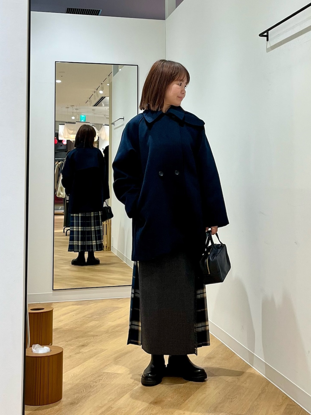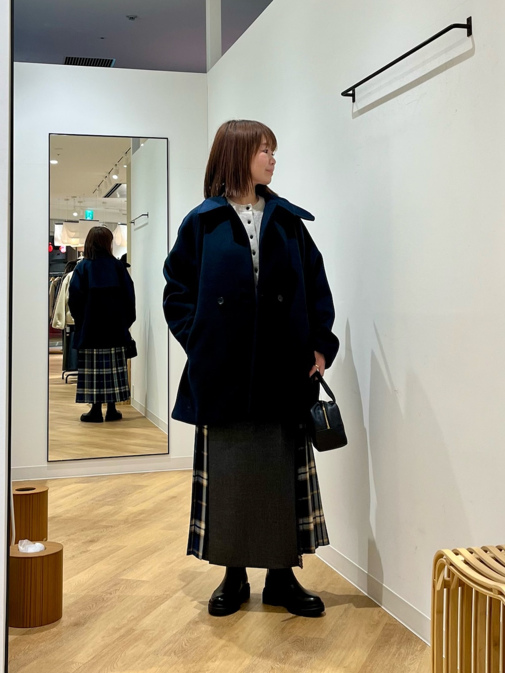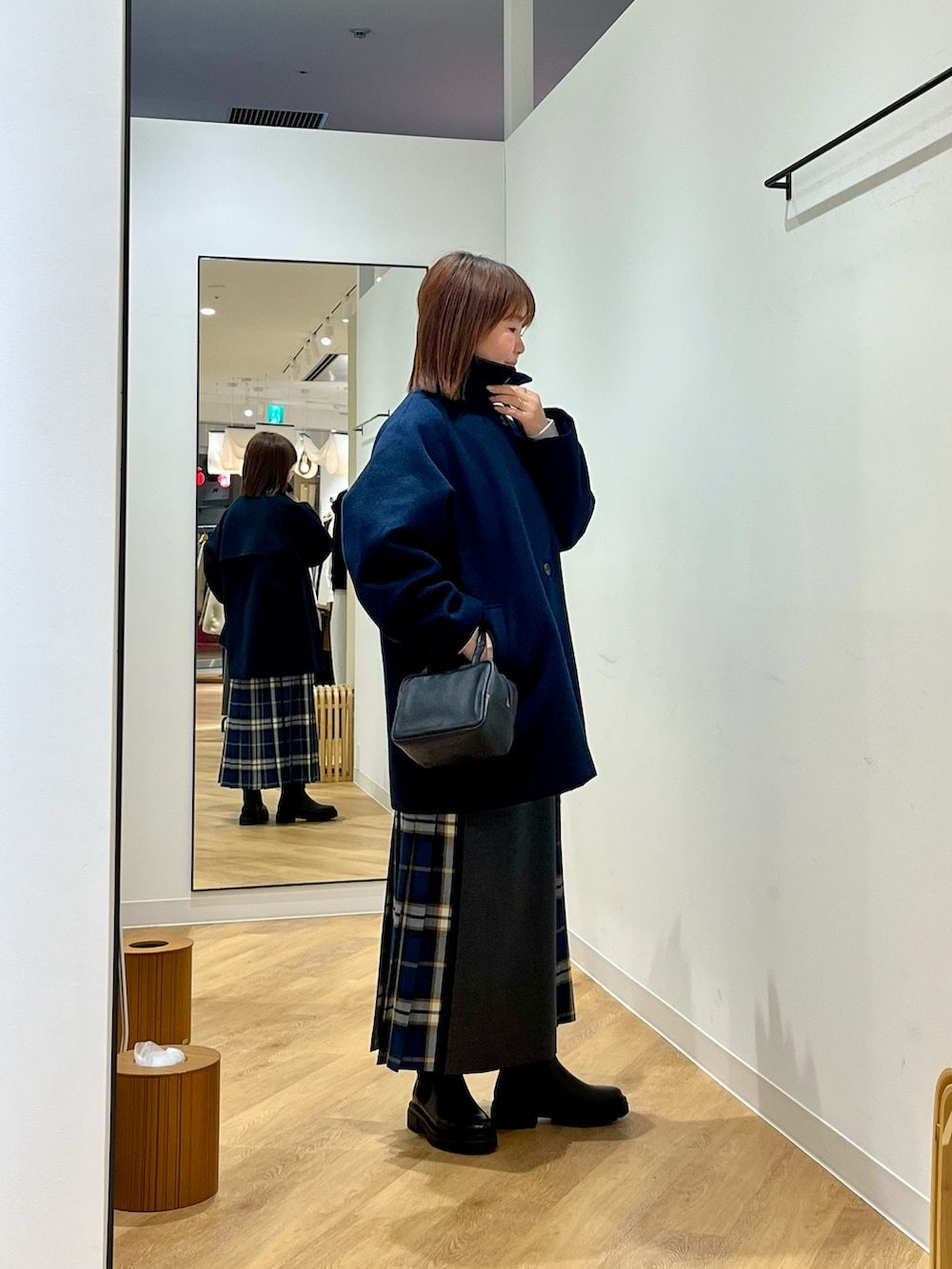 プレーンカラー×チェックのコンビ仕様で、大人らしい落ち着いた印象。