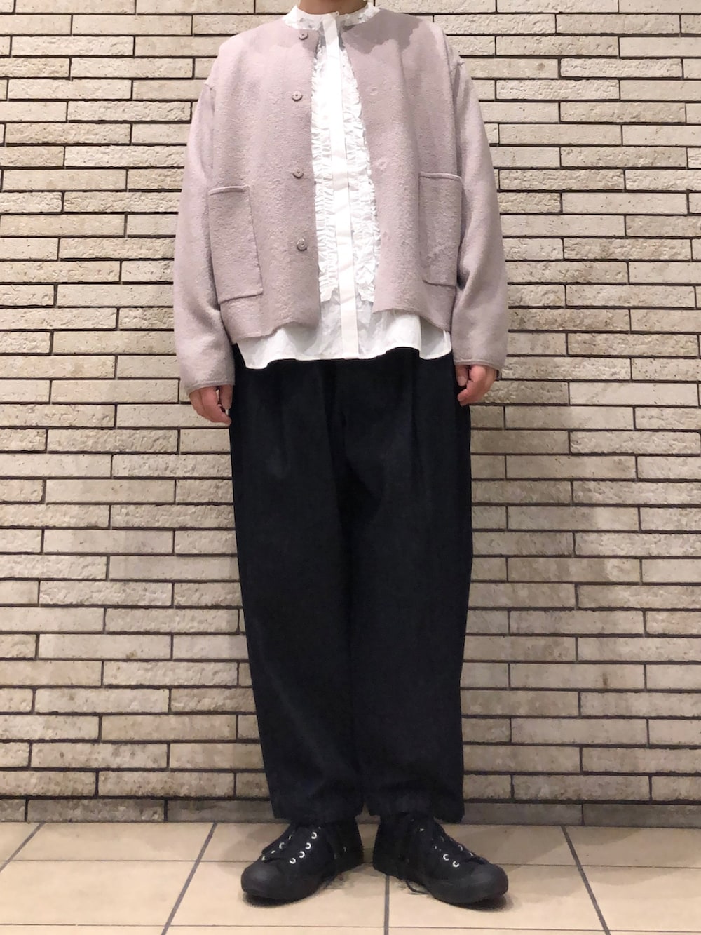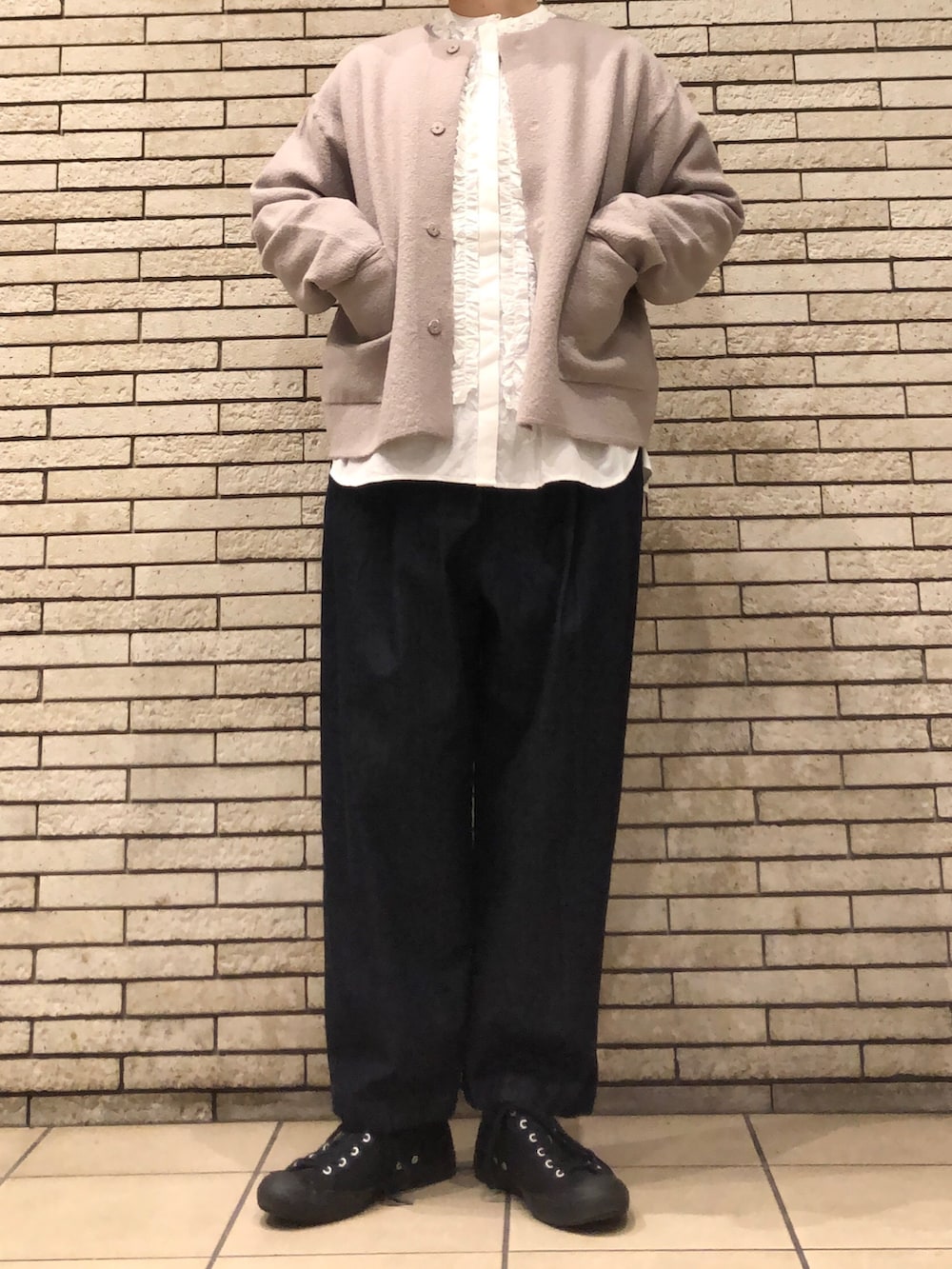 今回はフリルシャツとデニムを合わせて大人カジュアルに。デニムは9分丈が使いやすいかぐれ定番の着まわしボトムです。やや丸みがあるコクーンシルエットがポイントです。