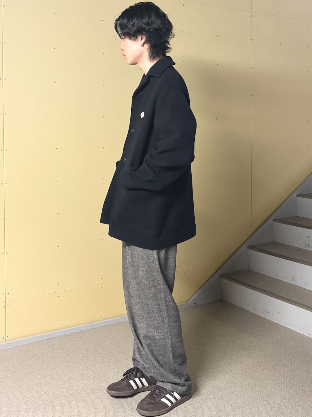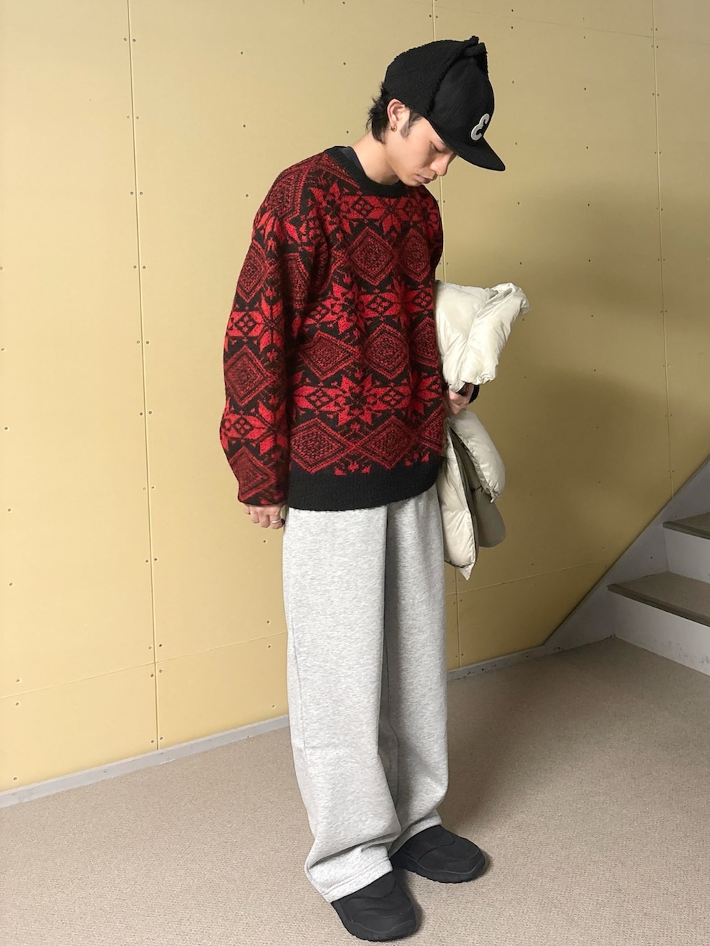下のスウェットパンツもストレートで形が綺麗なので部屋着っぽさを軽減できます!