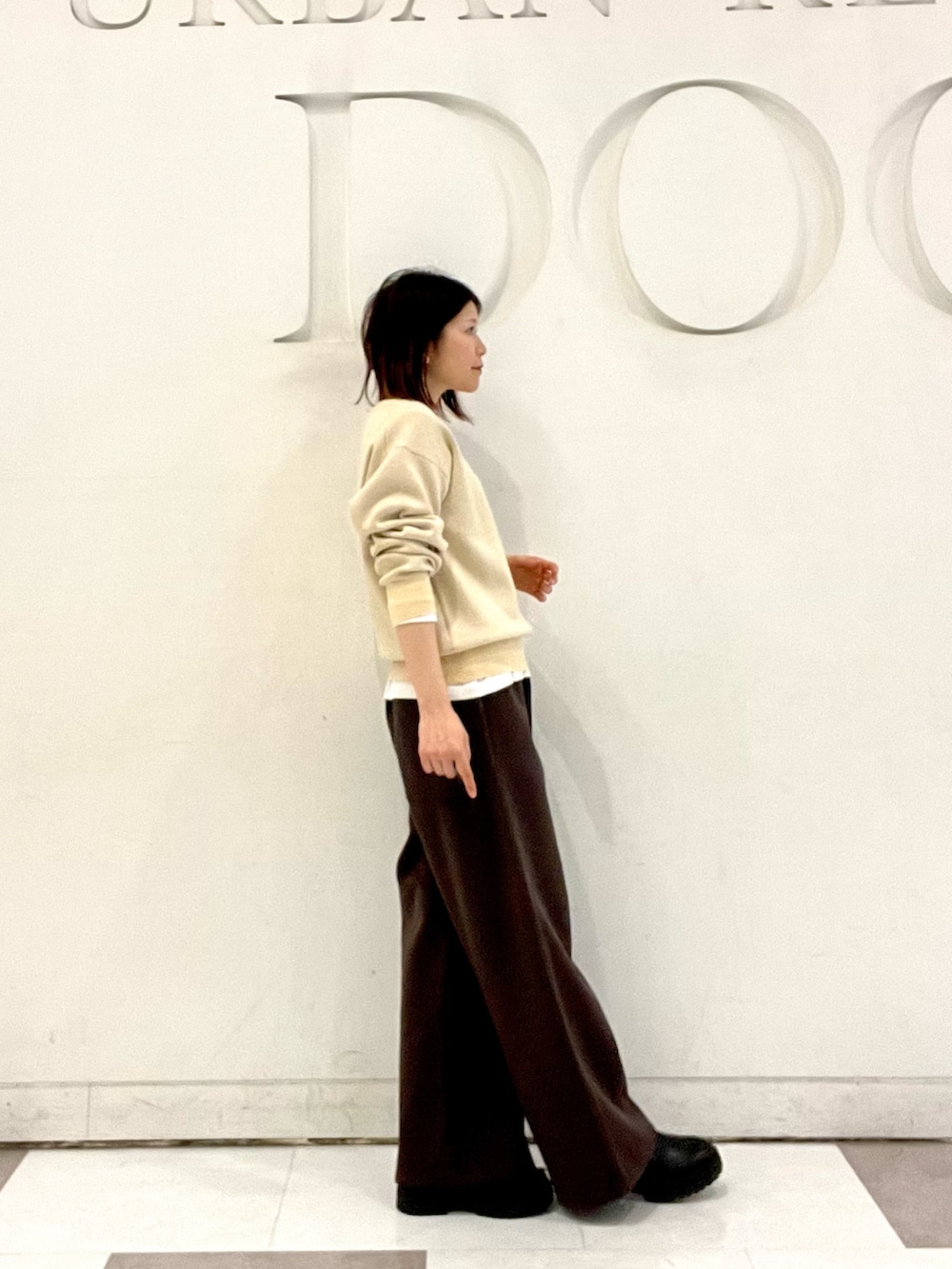 ニットはロゴが控えめなのでカジュアルになりすぎず着ていただけます◎柔らかい肌触りで着やすいです🧶EKALのパンツは暖かくこれからの寒い時期にオススメです!
