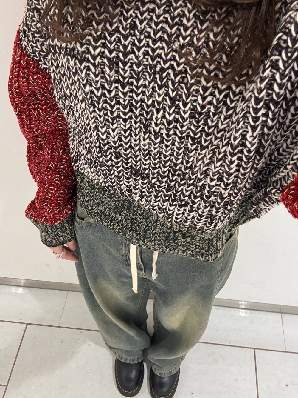 デザインが特徴的なニットと色味が可愛いデニムを合わせたカジュアルコーデです!