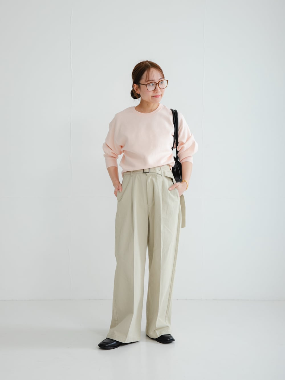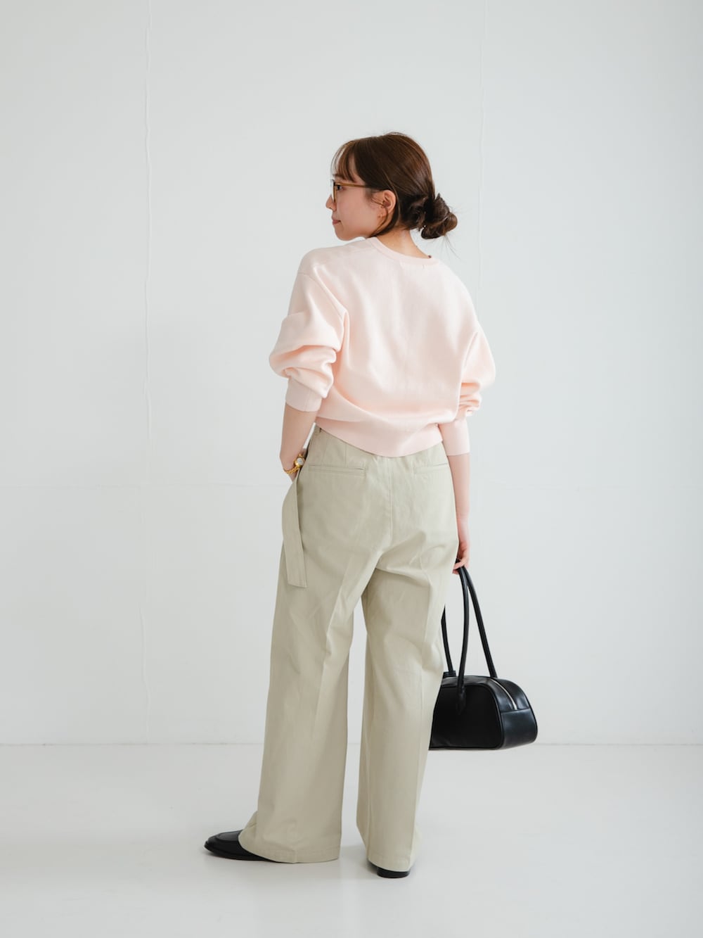 裾にリブが付いているので、ボトムにインしなくても腰で止まります。スタイリングしやすく着回しも良いです。淡いカラーなので挑戦しやすいピンクです。