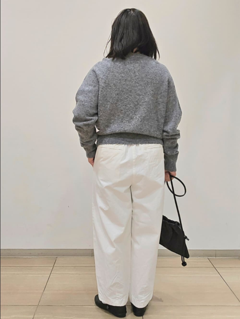 丸首のベーシックなグレーのニットに、白いズボンを合わせてみました。