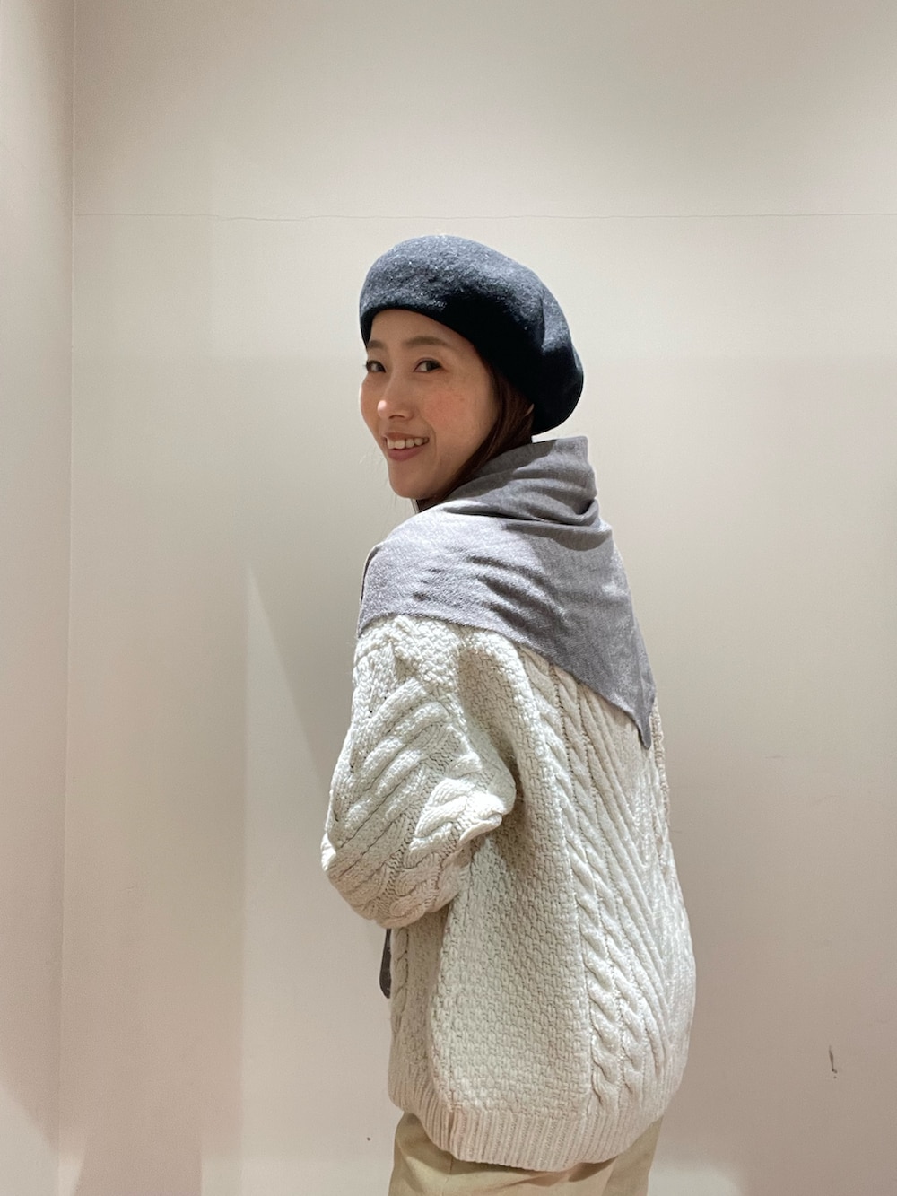 肌触りの良い薄手のニット素材でアウターやニットの上から肩に巻くと今期らしいスタイルになります‼︎