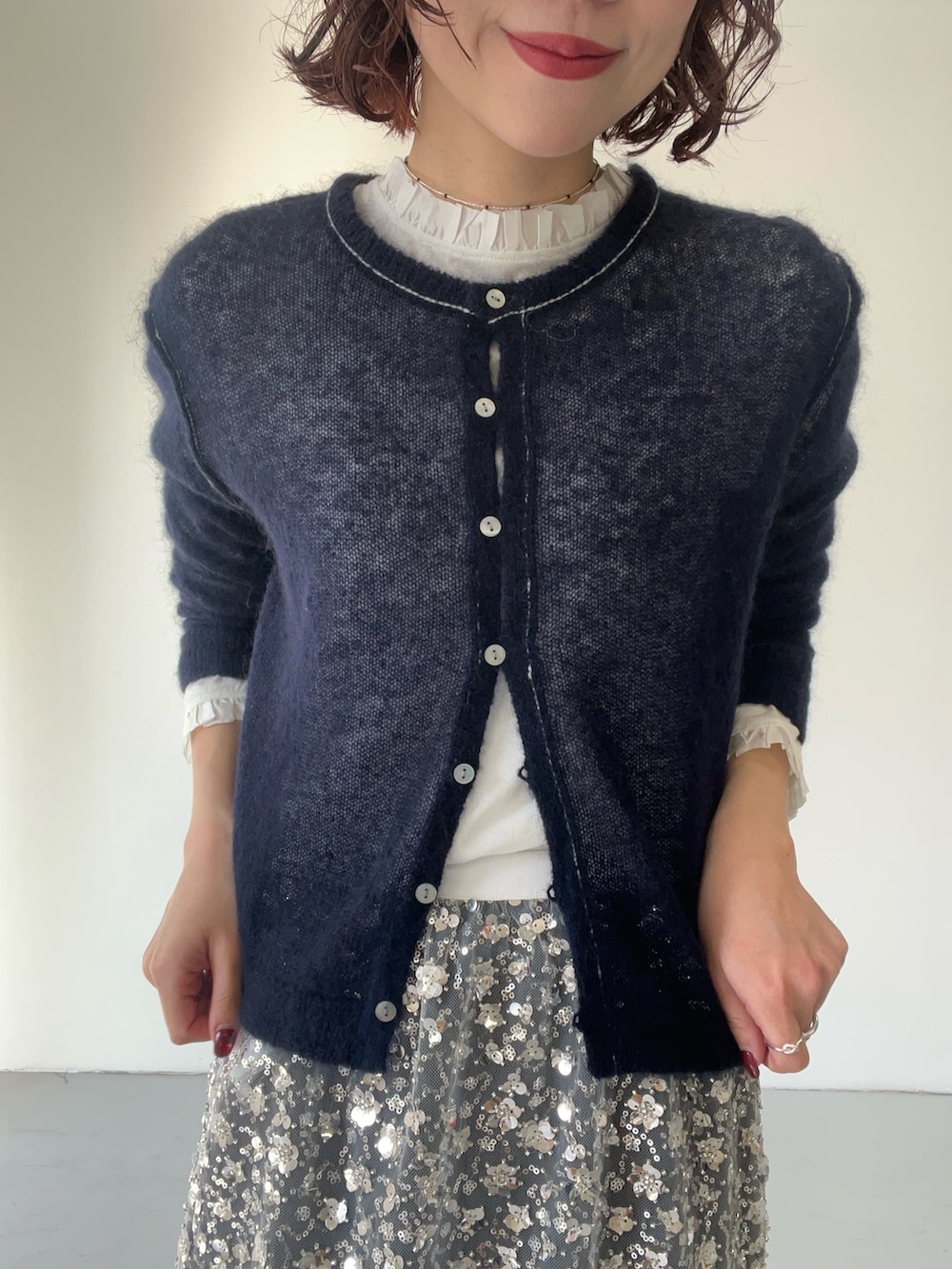 ふんわりとしたシアーモヘヤ素材のカーディガン。少し透け感があるので、今の季節はカットソーやタートルなだと重ね、春先はキャミソールの上に上に着て透け感を活かしたスタイルがおすすめです♩