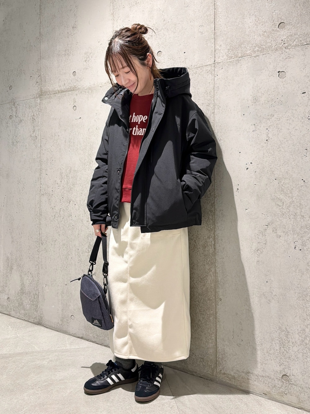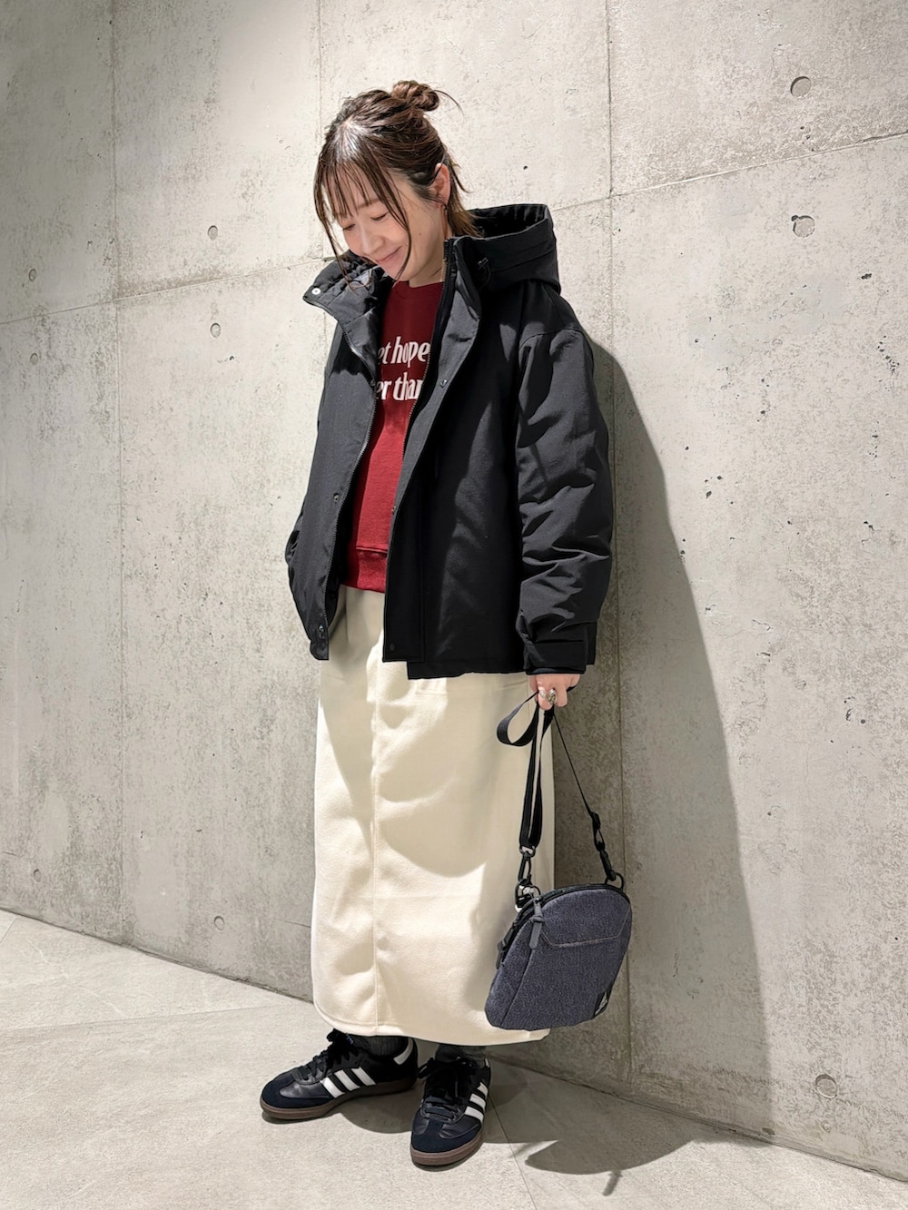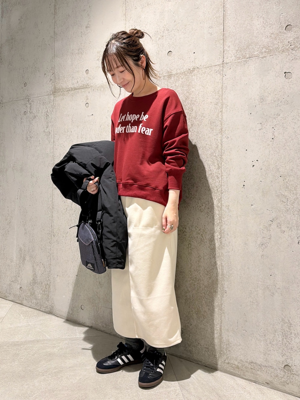 今回は、ロゴ入りスウェットをアクセントにした、カジュアルコーディネートです。