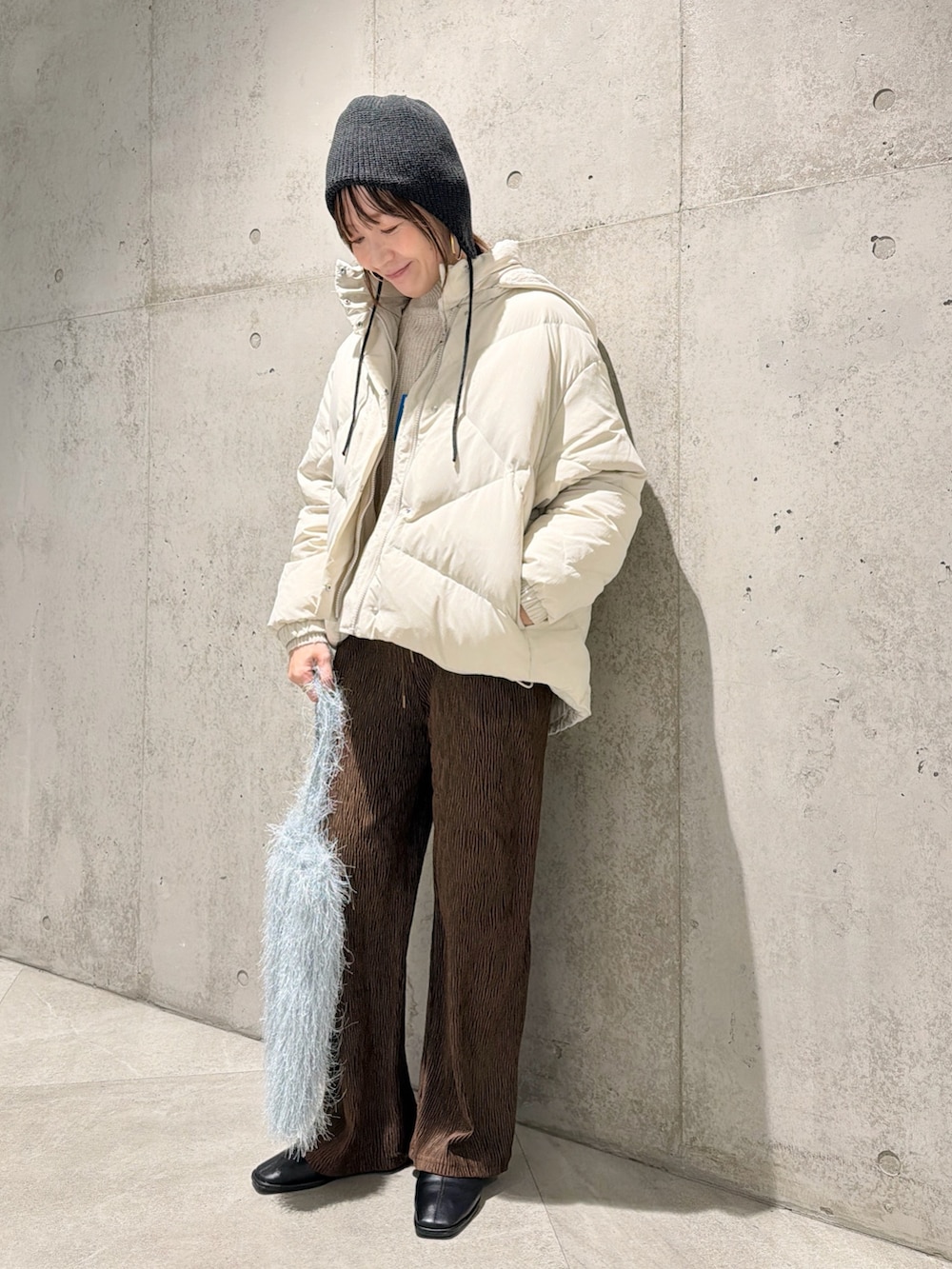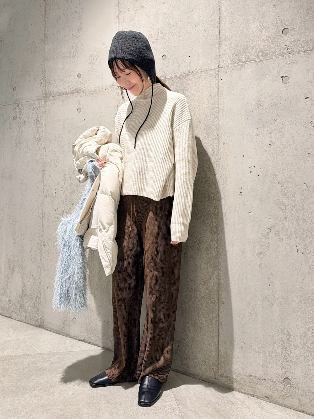 今回は、ベロアにプリーツ素材が特徴的なイージーパンツと合わせた大人カジュアルコーディネートです。