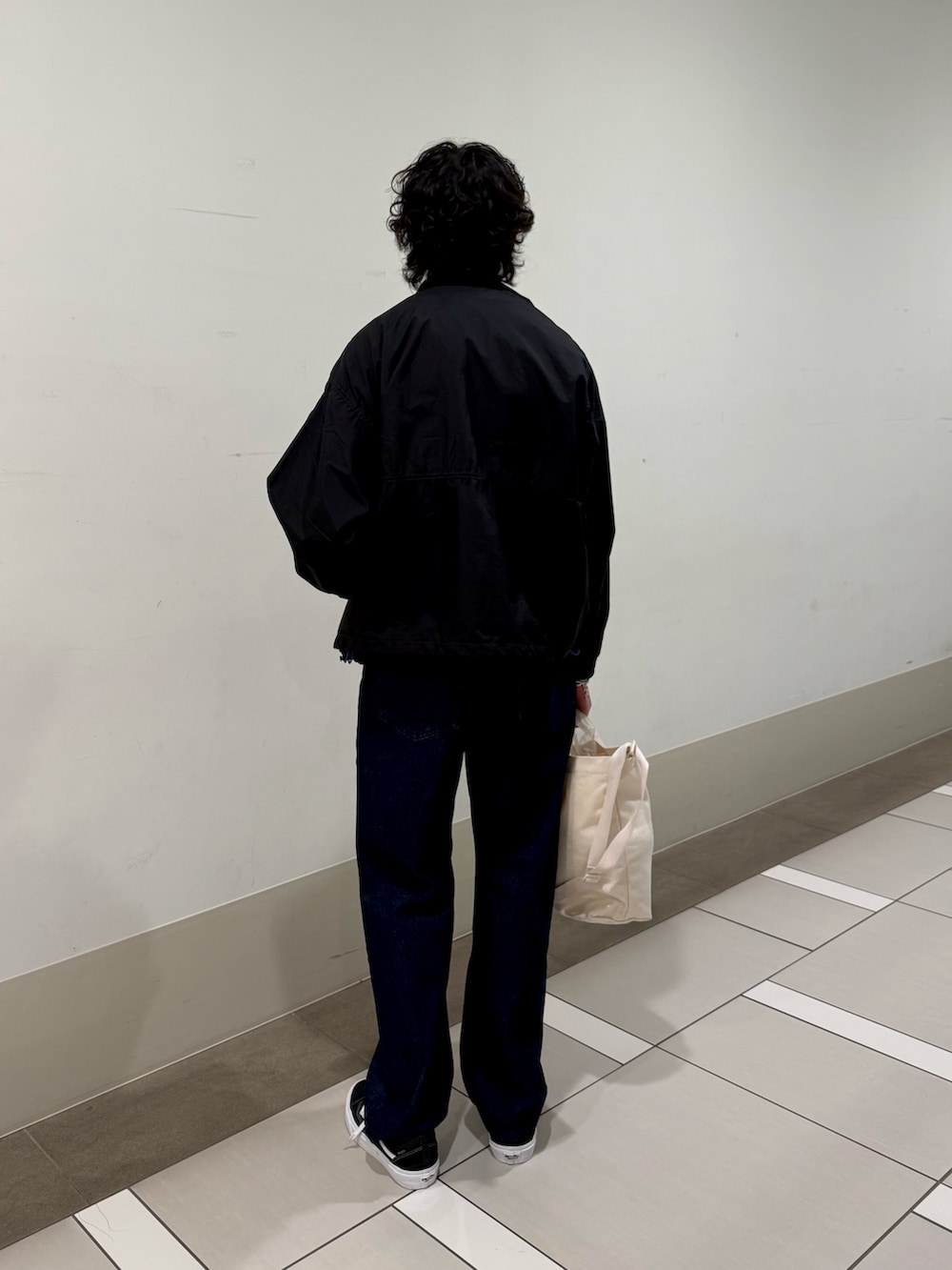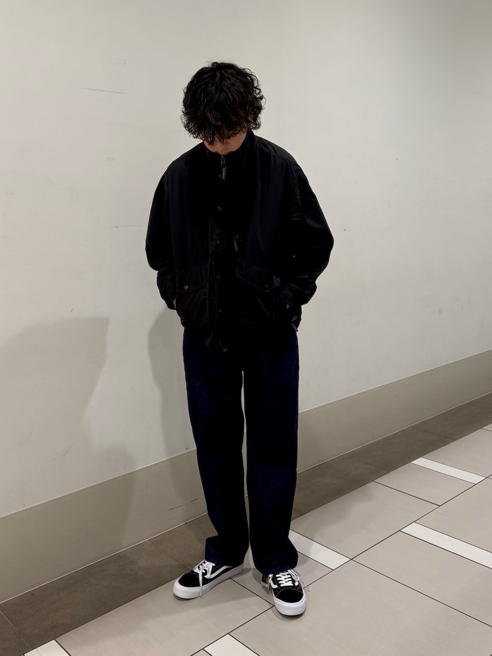 アウターのナイロン系素材、インナーのウール調の質感、そしてボトムスの深みのあるリジッドのデニムで合わせ、ワントーンに近い配色でものっぺりせず、奥行きのある着こなしにしてみました。