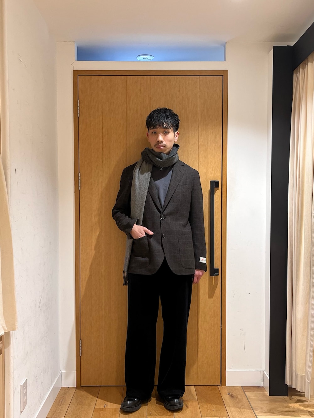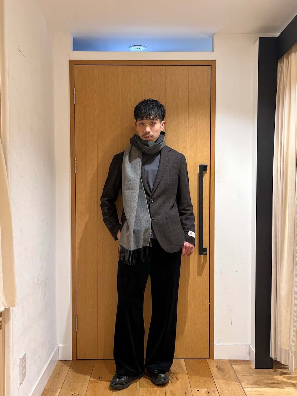 あえてワイドストレートのベロアパンツを採用することで固くなりすぎないほど良い抜け感に落としてます。