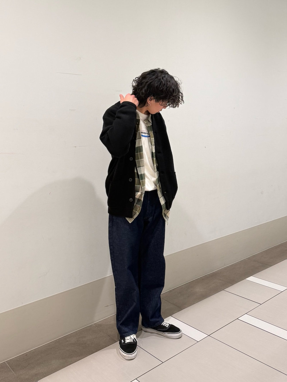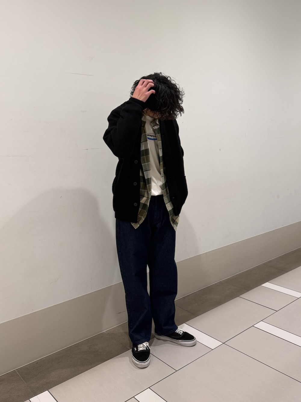 いつもご覧いただきありがとうございます。カーディガンとパンツ、スニーカーをダークトーンで統一することによって中に着たグリーンのチェックシャツを主役にしてみました!