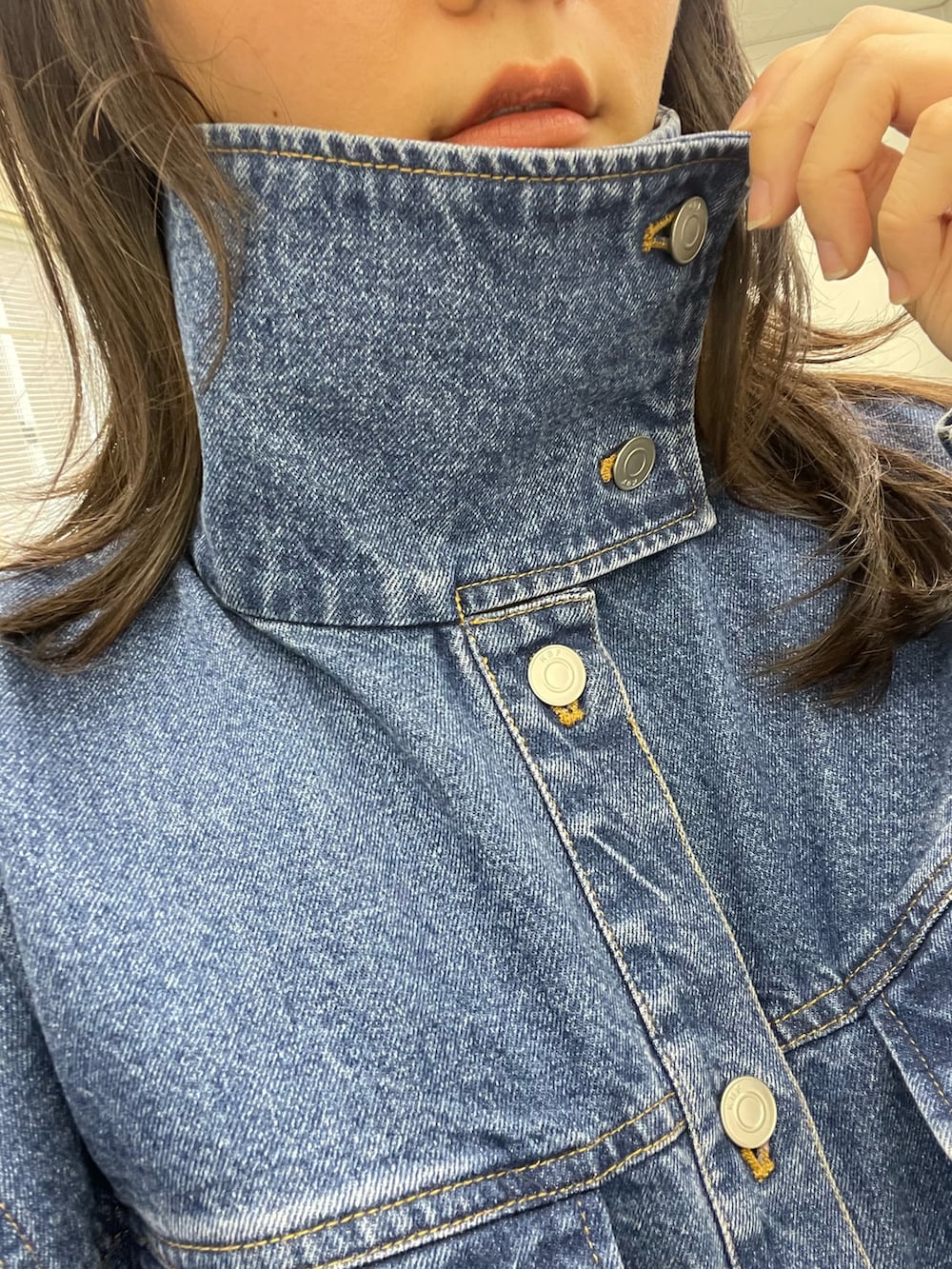 デニムジャケットはハイネックになっておりハイネックで着用しても折って着用してもどんなスタイルにも合わせやすいです!オーバーサイズになっているので中に着込むこともできます◎