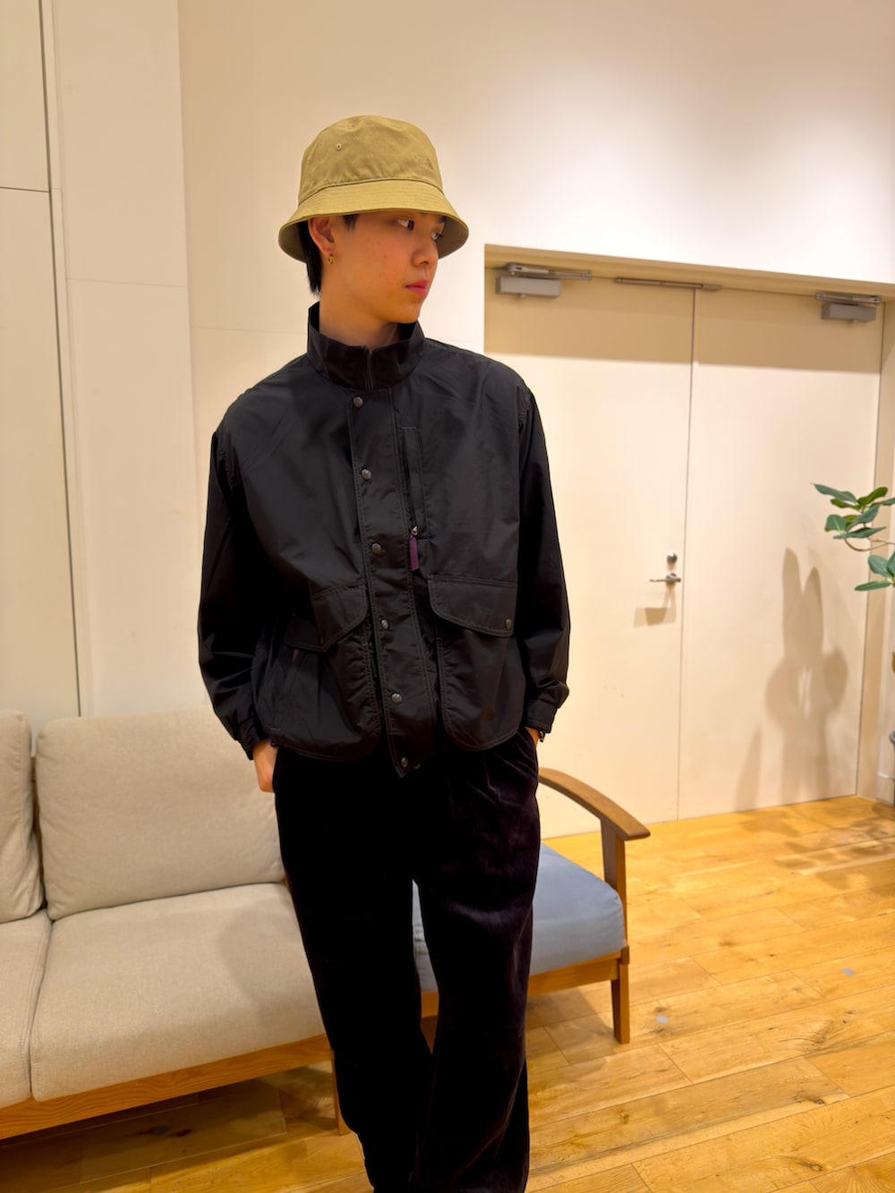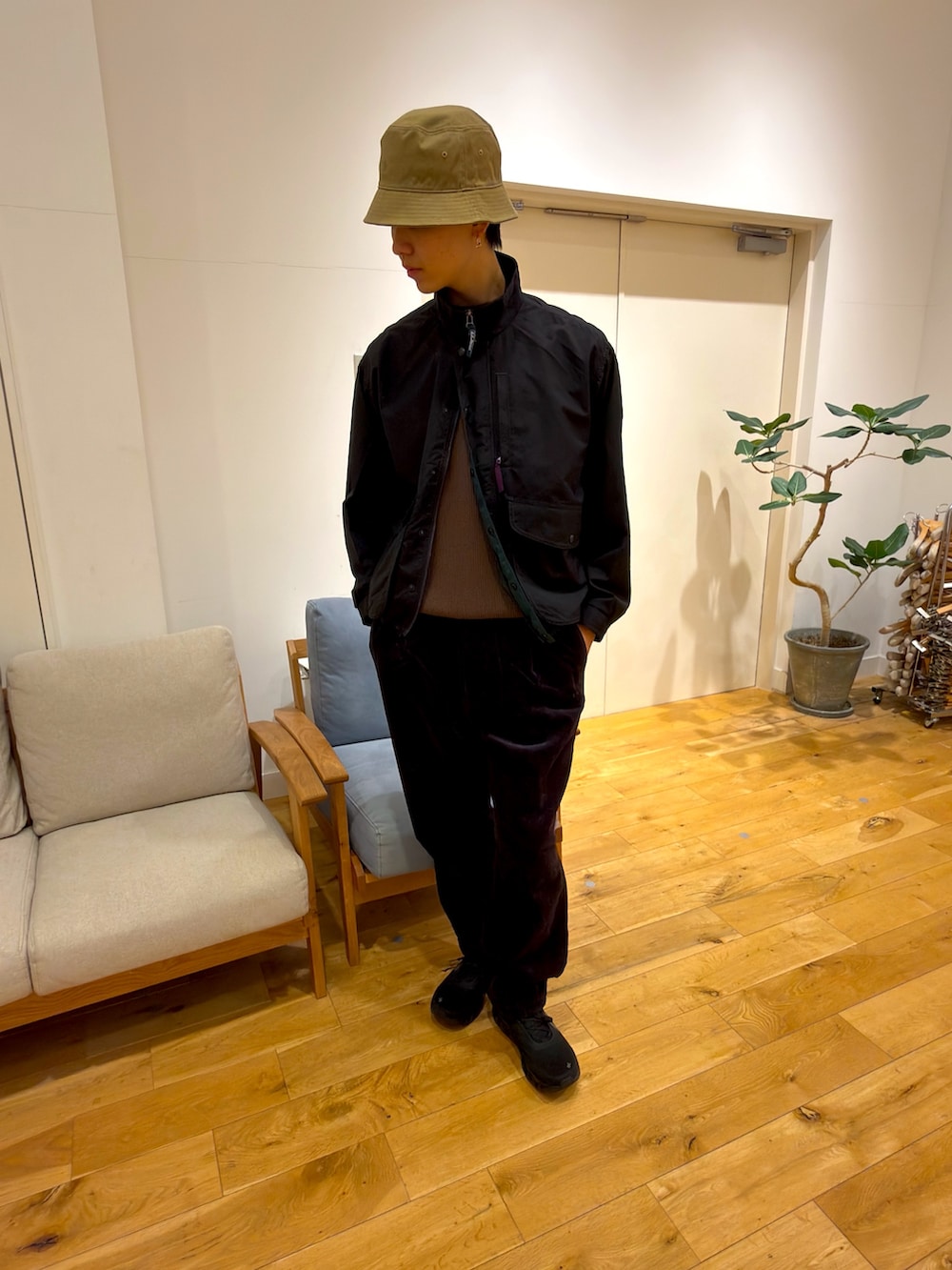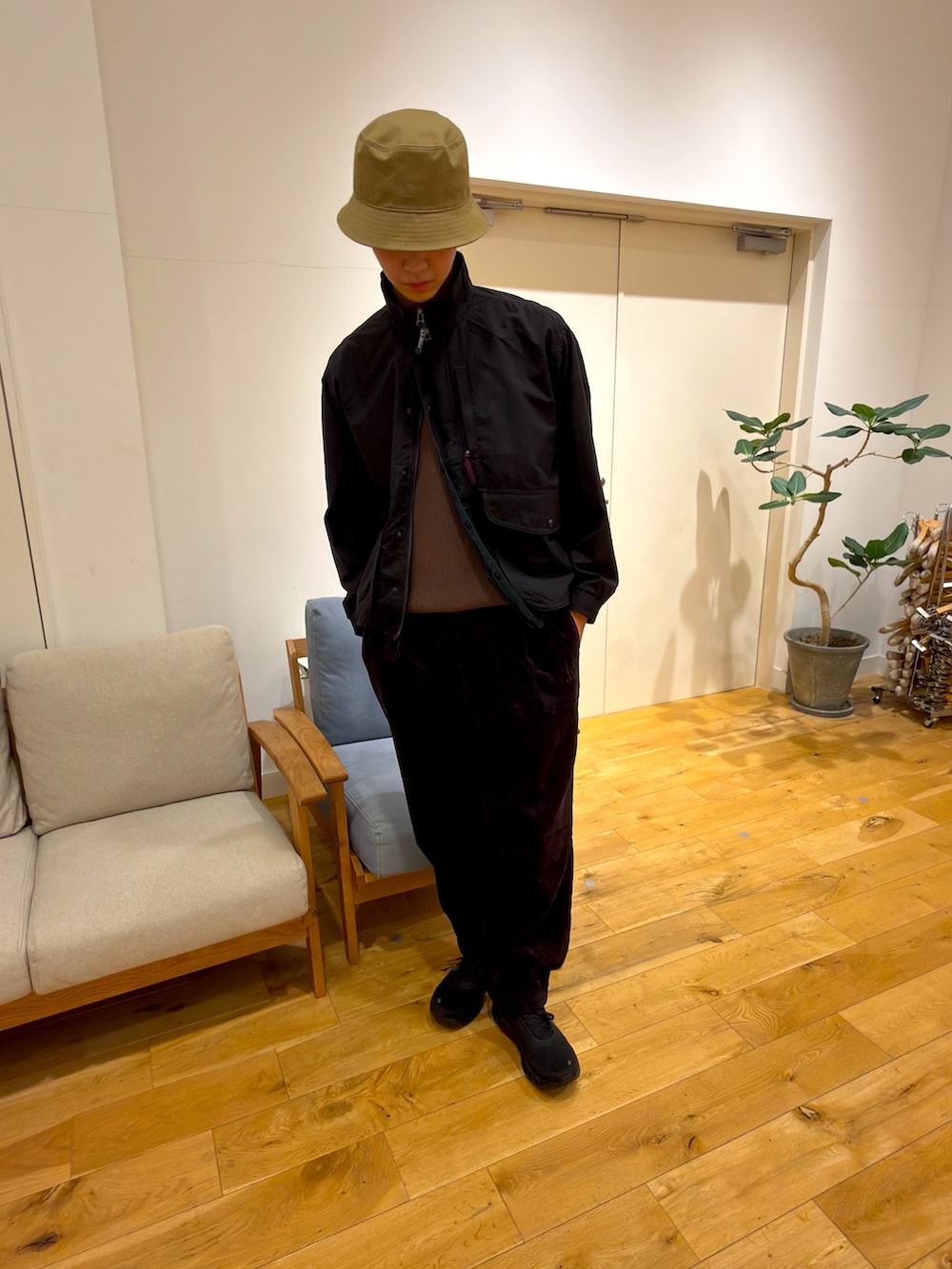 しかし、全身アウトドアになるとちょっと今っぽくないので、ハットとコーデュロイパンツでカジュアルアイテムも取り入れております!