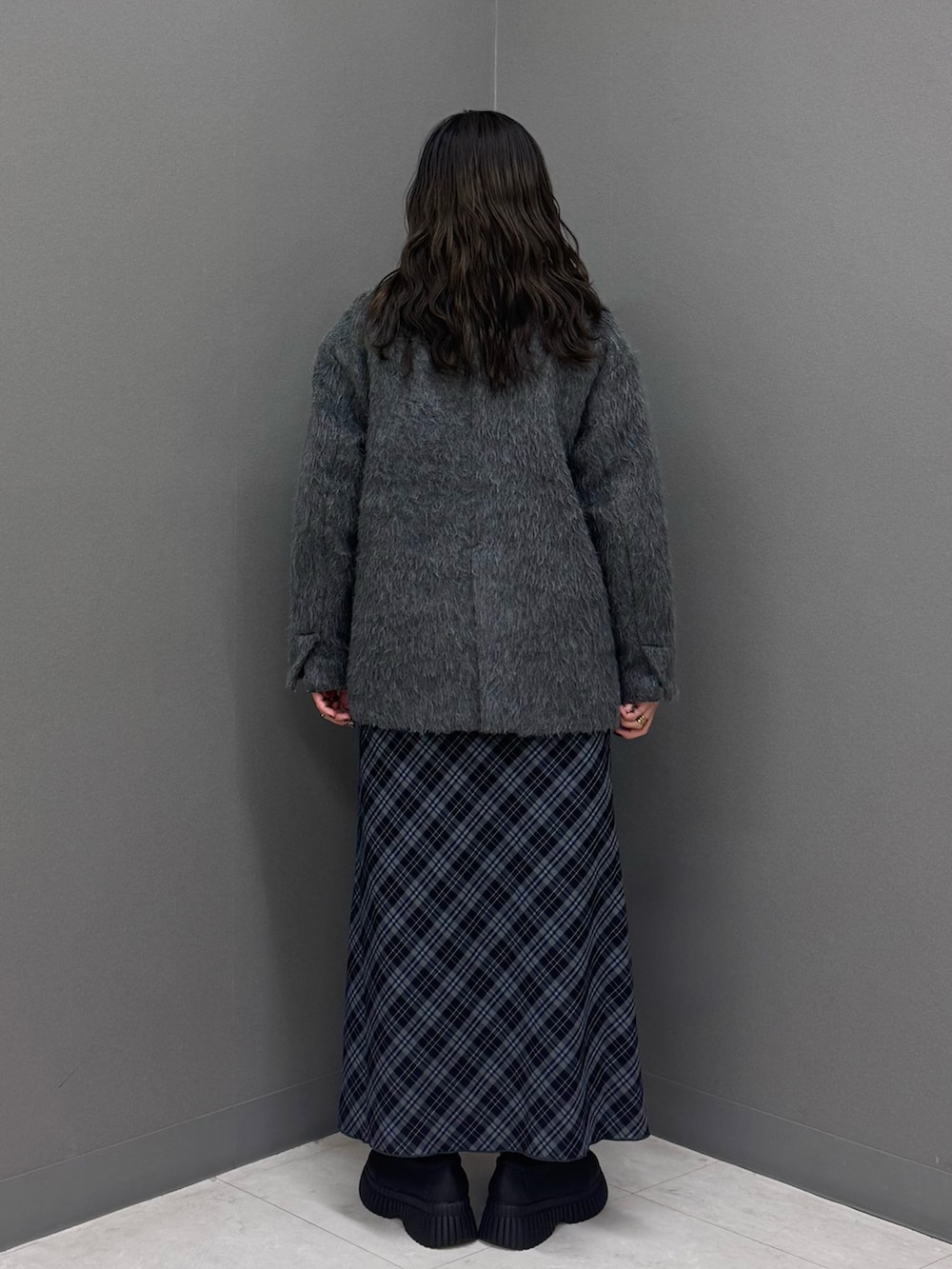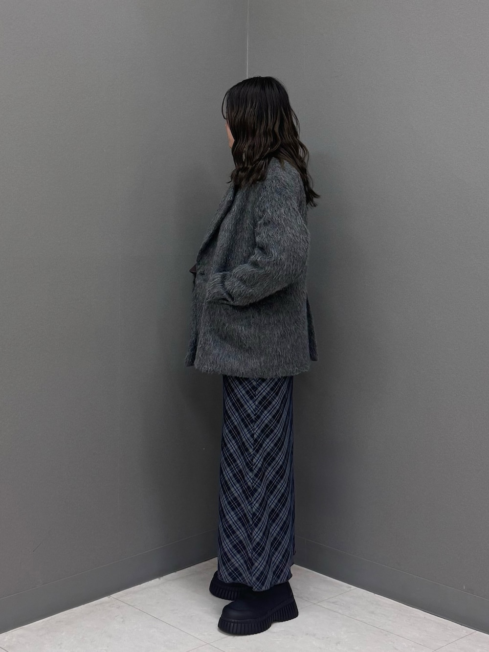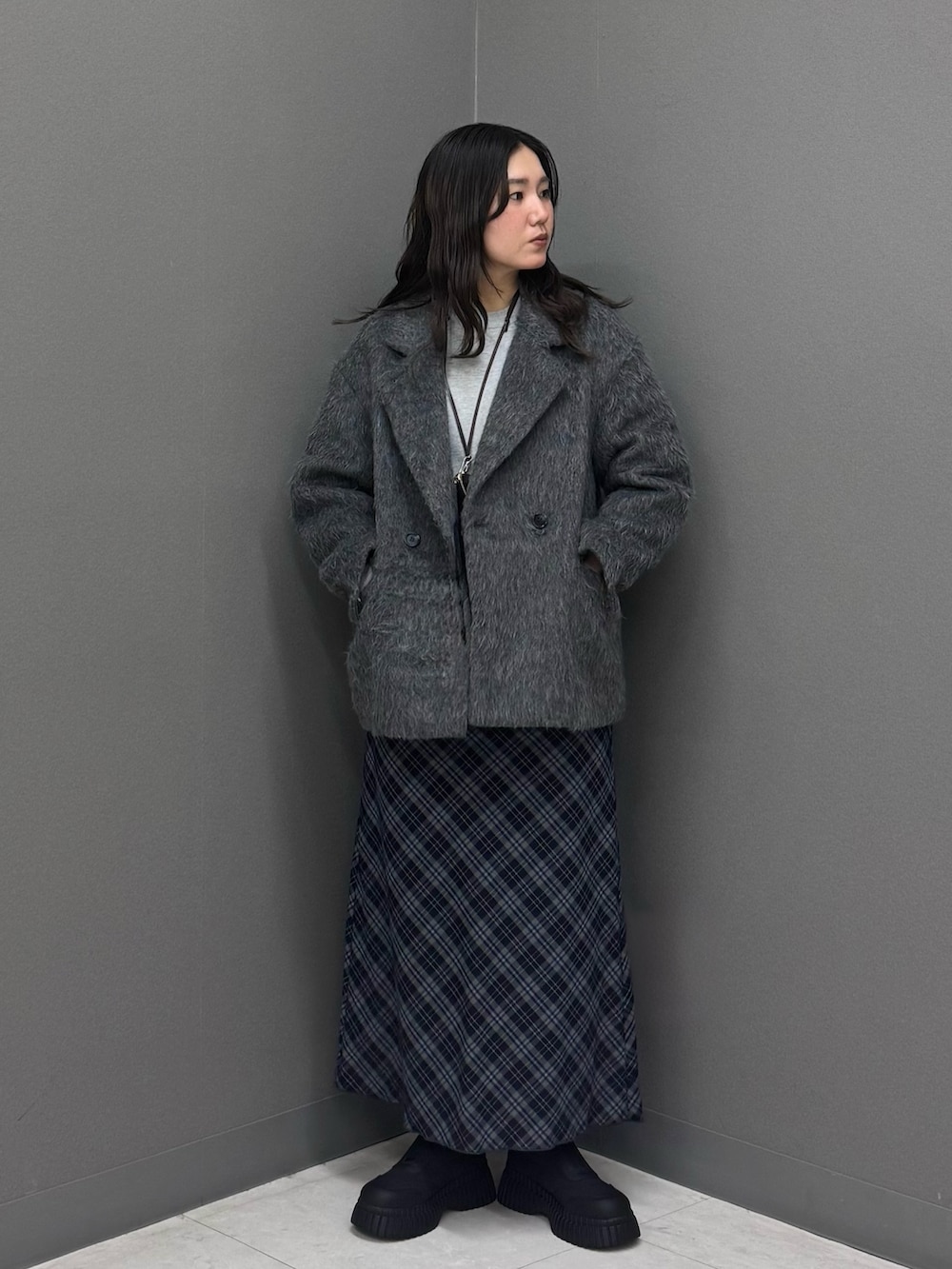 チェックスカートと合わせてきれいめカジュアルスタイルに