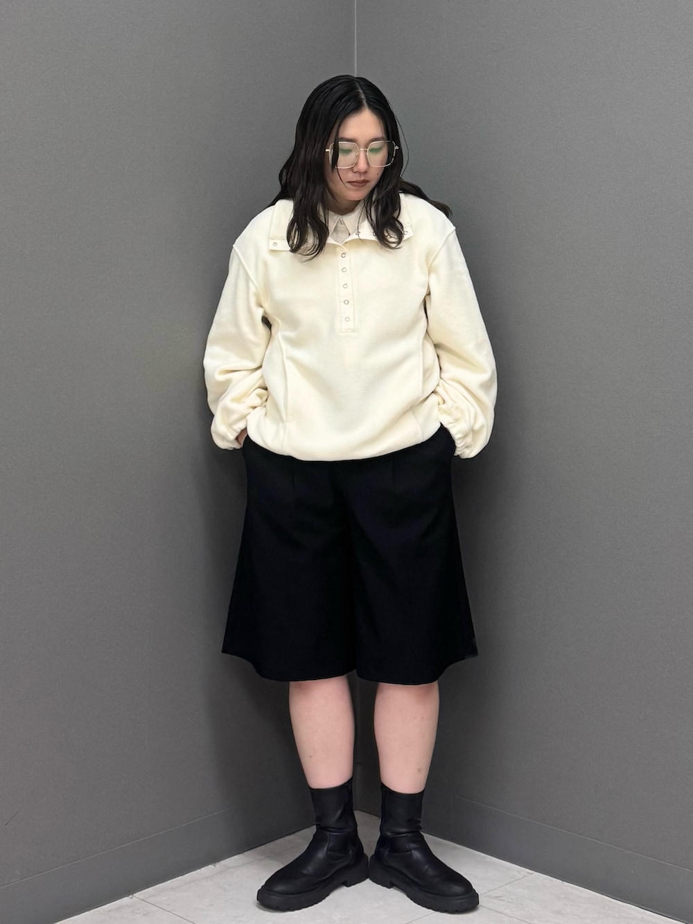 薄手のウール混素材を使用したルーズシャツをinしてレイヤードスタイルに