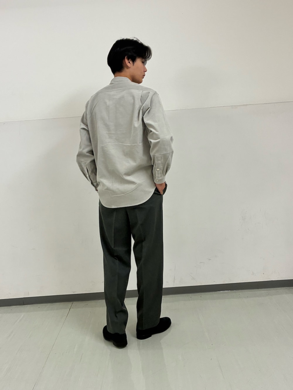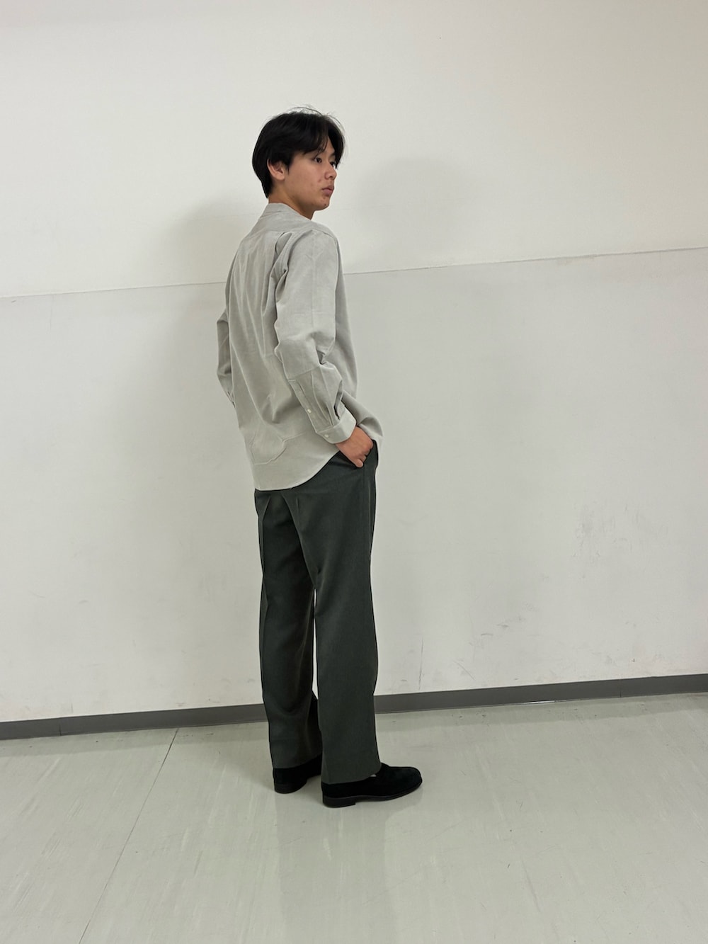シャツの淡いグレーを際立たせるため、ボトムスとシューズはダークトーンで統一。バンドカラーを選ぶことで、首元をすっきりと見せ、品格のある落ち着いた印象に仕上げました。シンプルながらも素材の表情を楽しめる、洗練されたシティボーイスタイルです。