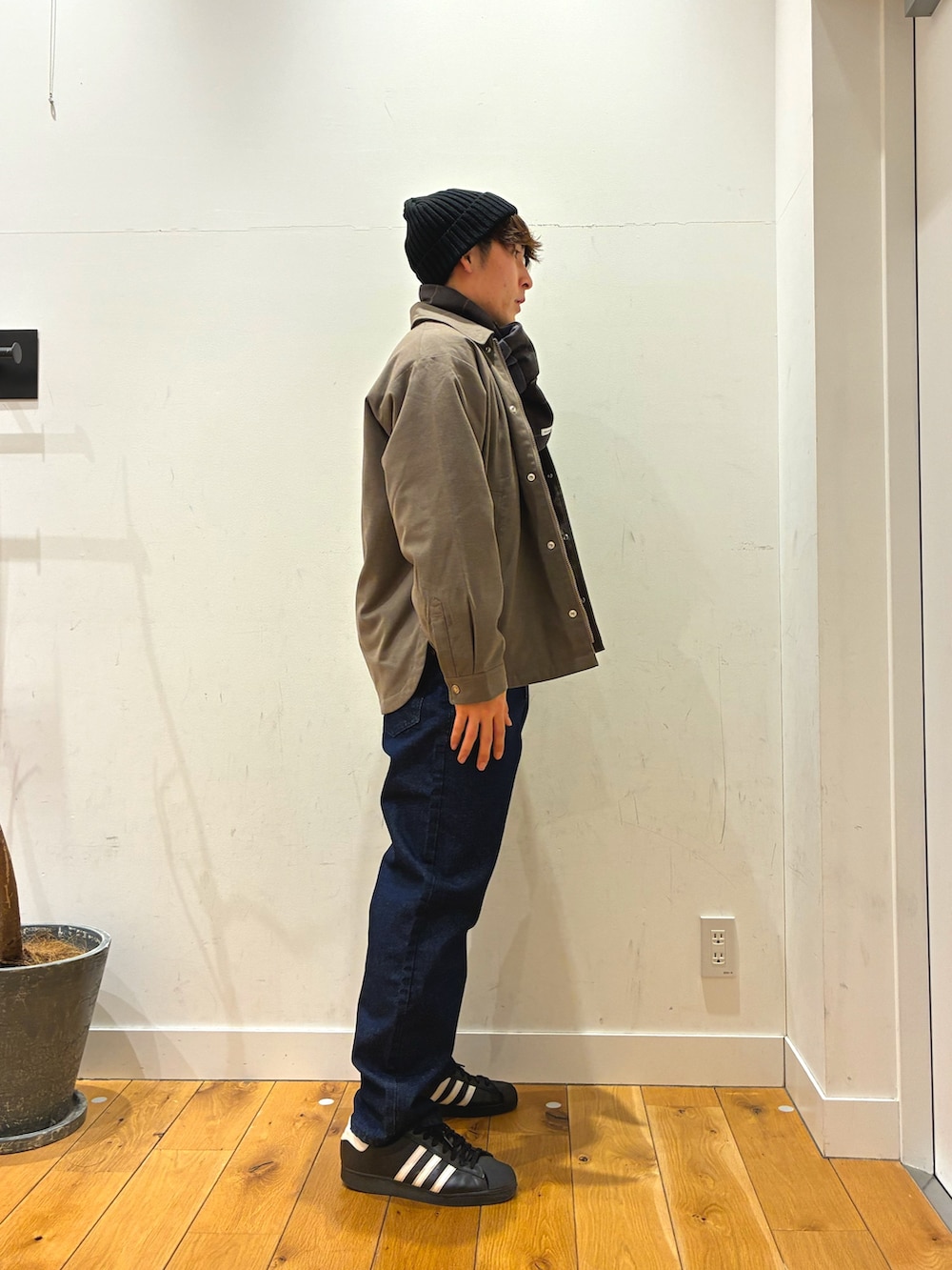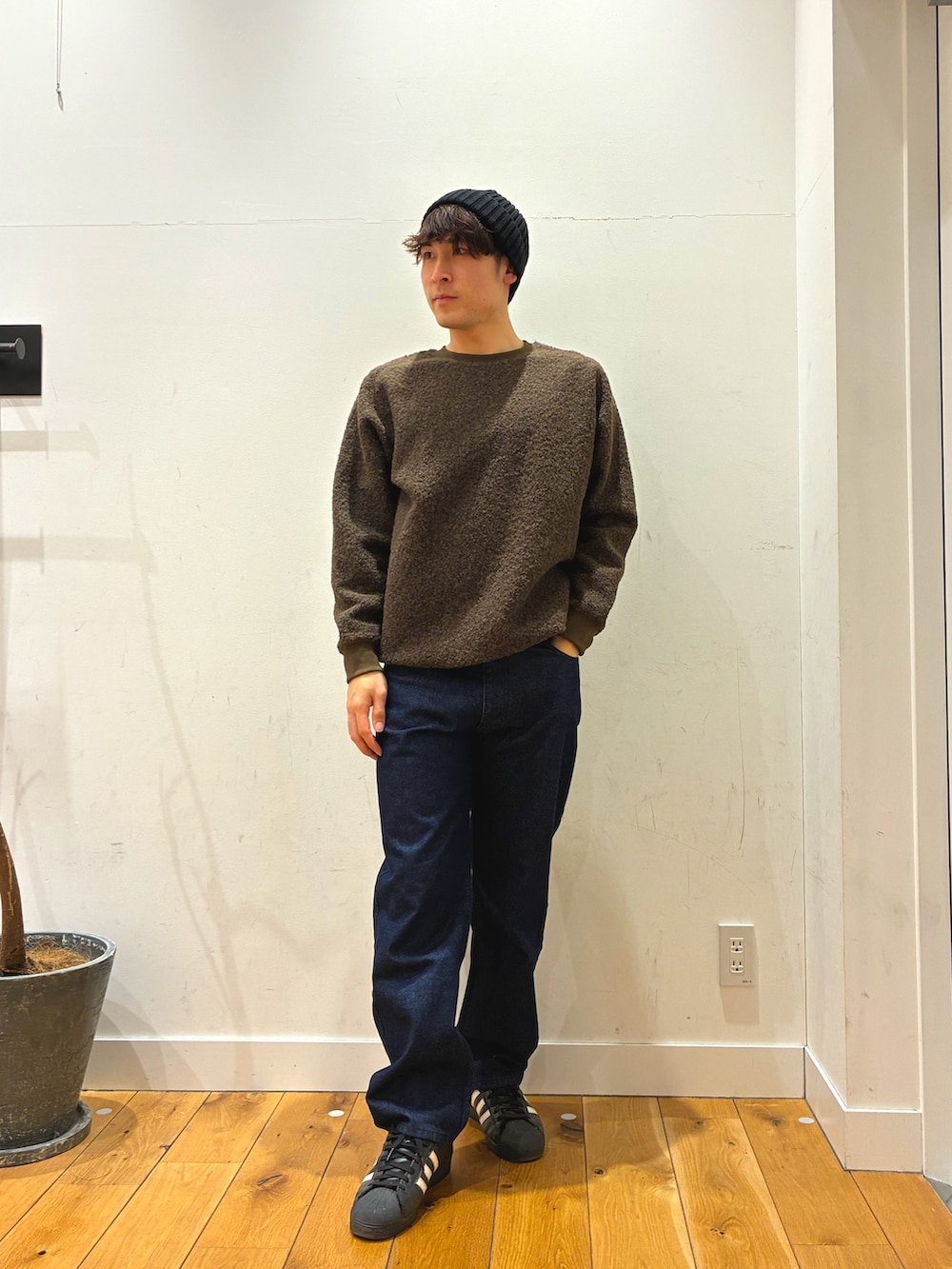 羊みたいな触り心地でとても暖かい物に裏地がつき暖かく簡単に着ることができるダントンのジャケットを着ています!パンツは明るいジーンズになっています!