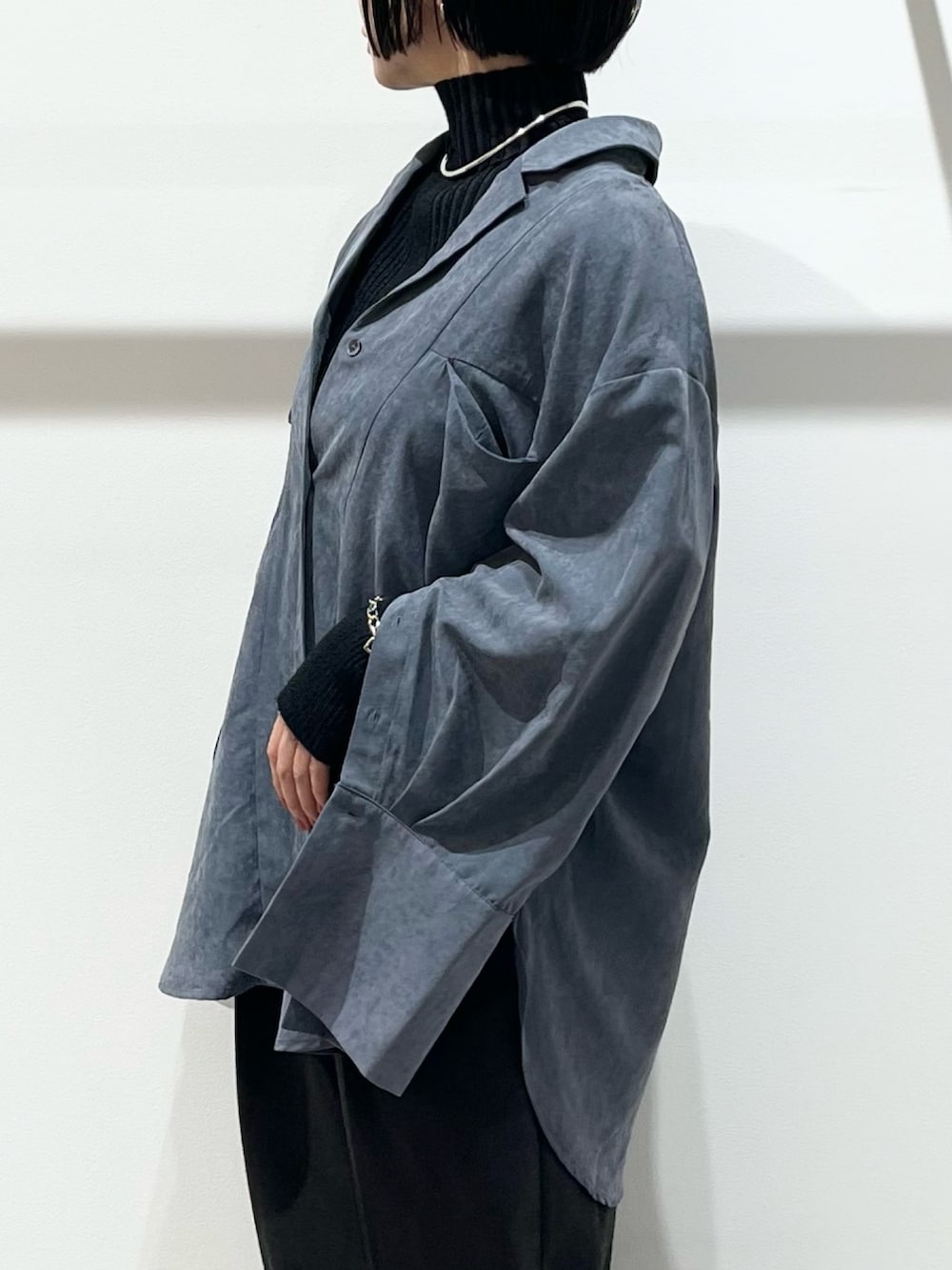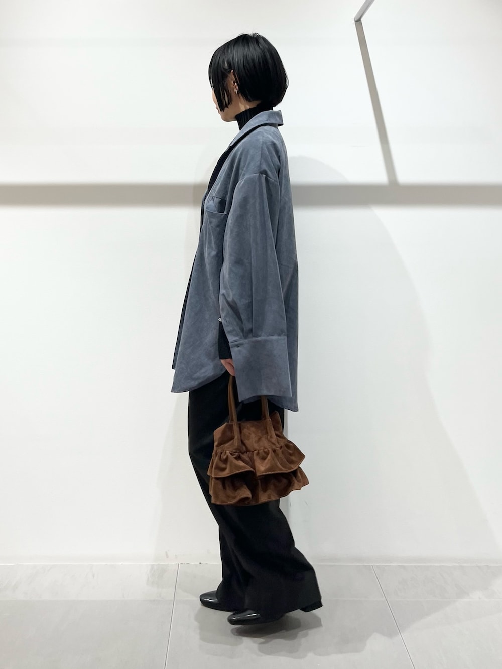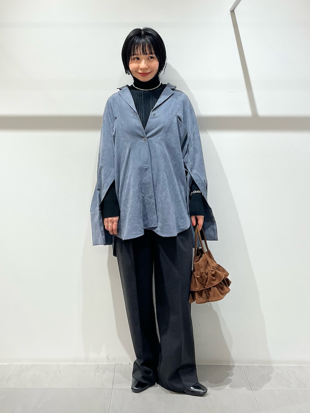 カラーものを取り入れたくなるタイミングに、このグレイッシュなブルーがちょうどいいです!他はチャコールでシックにまとめました。こちらのパンツは保温性があって暖かいです。ウエストが絞れるデザインなので、ベルトいらずです!