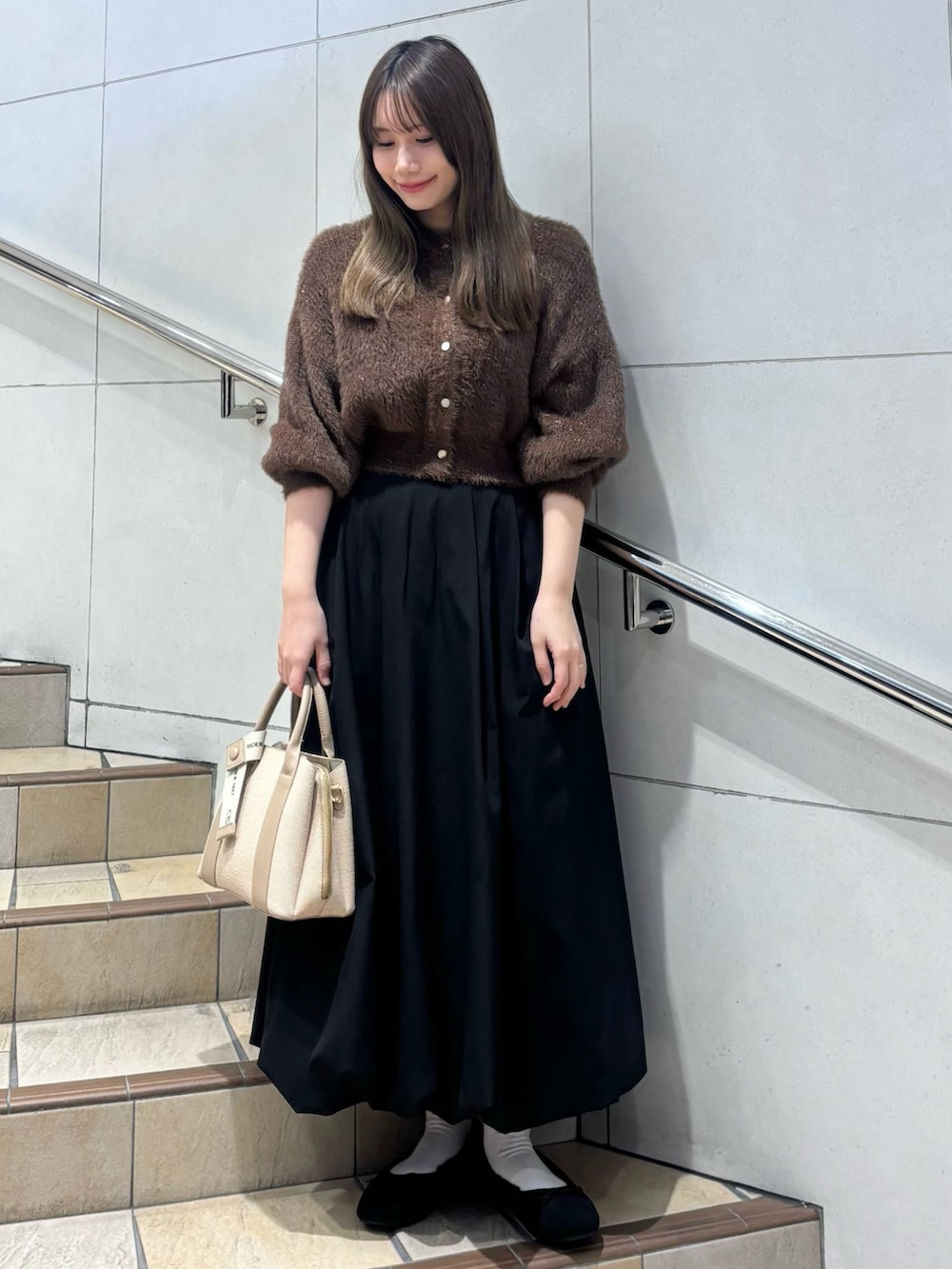 カーディガンは短丈でボリュームあるスカートと相性抜群です!