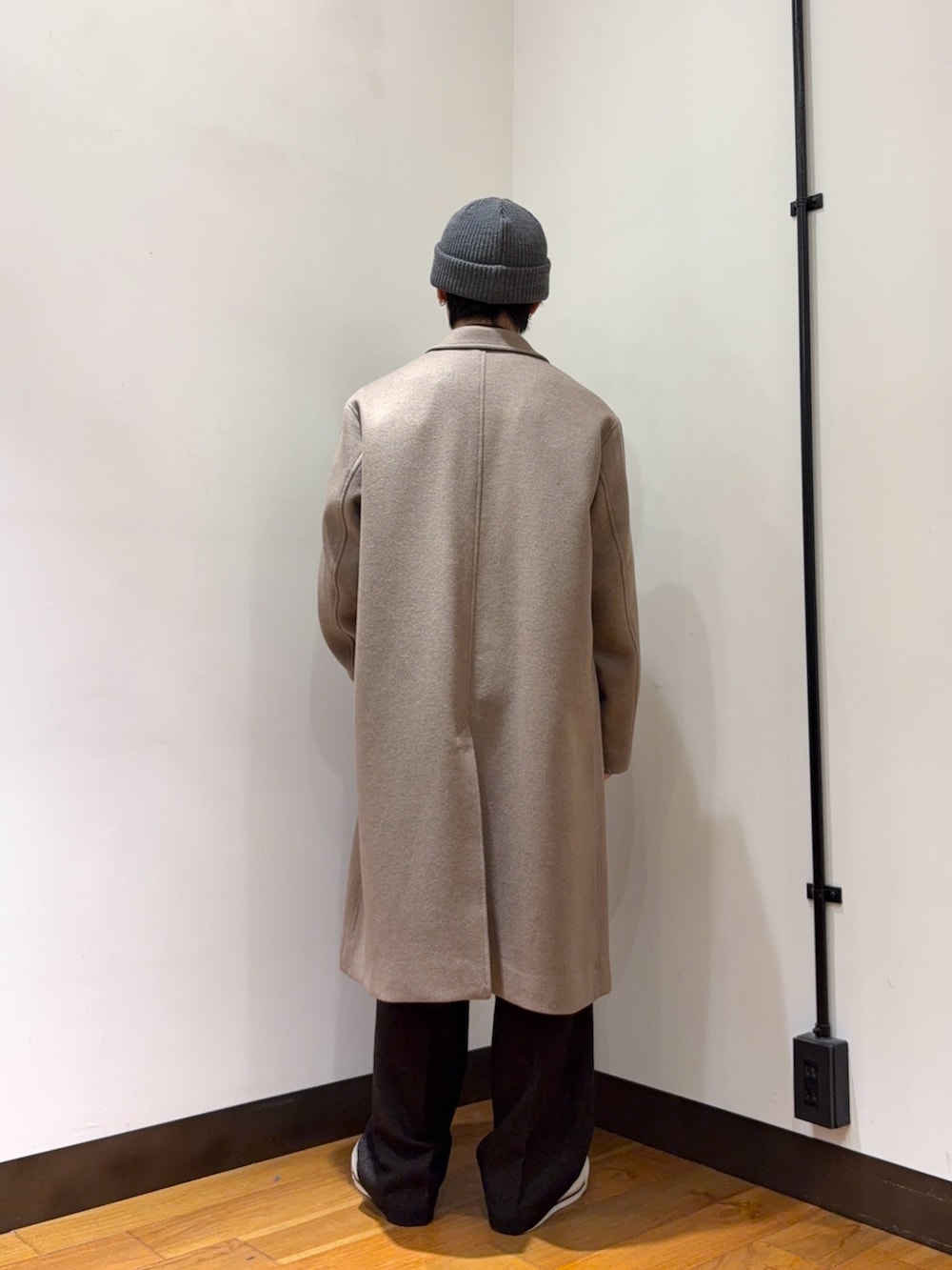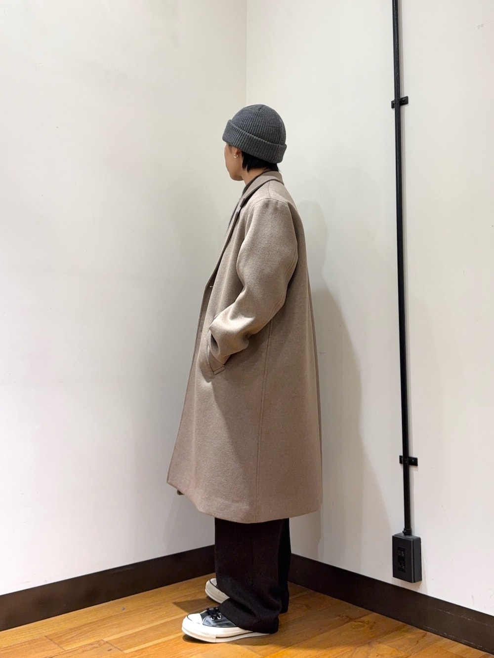 インナーやパンツをブラウンにしてスタイルを引き締めつつ、アウターのチェスターコートをベージュにしてコーデに軽さを与えてみました。