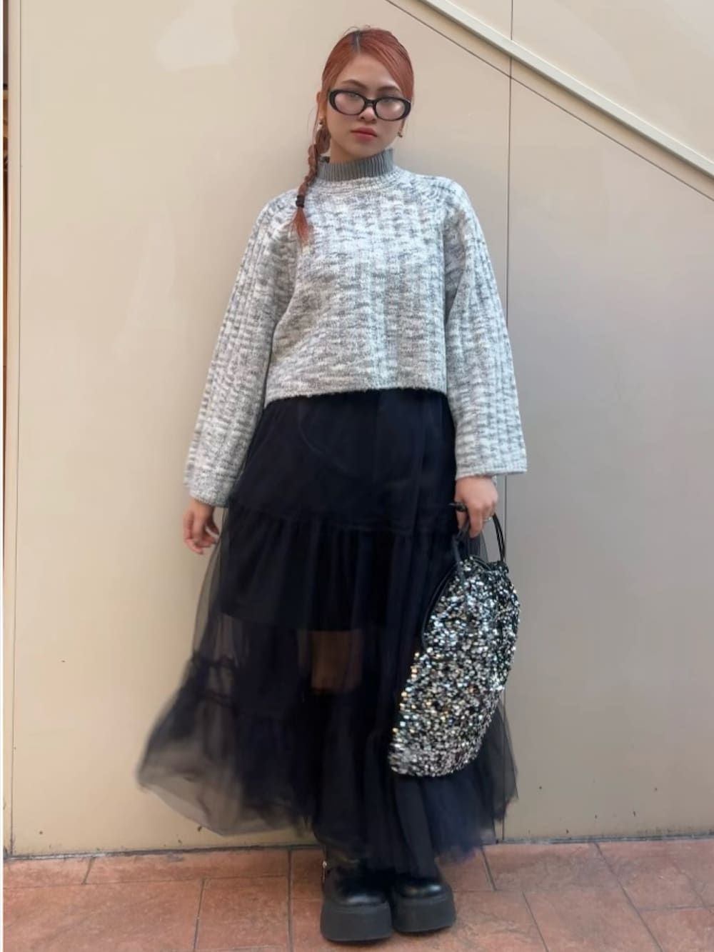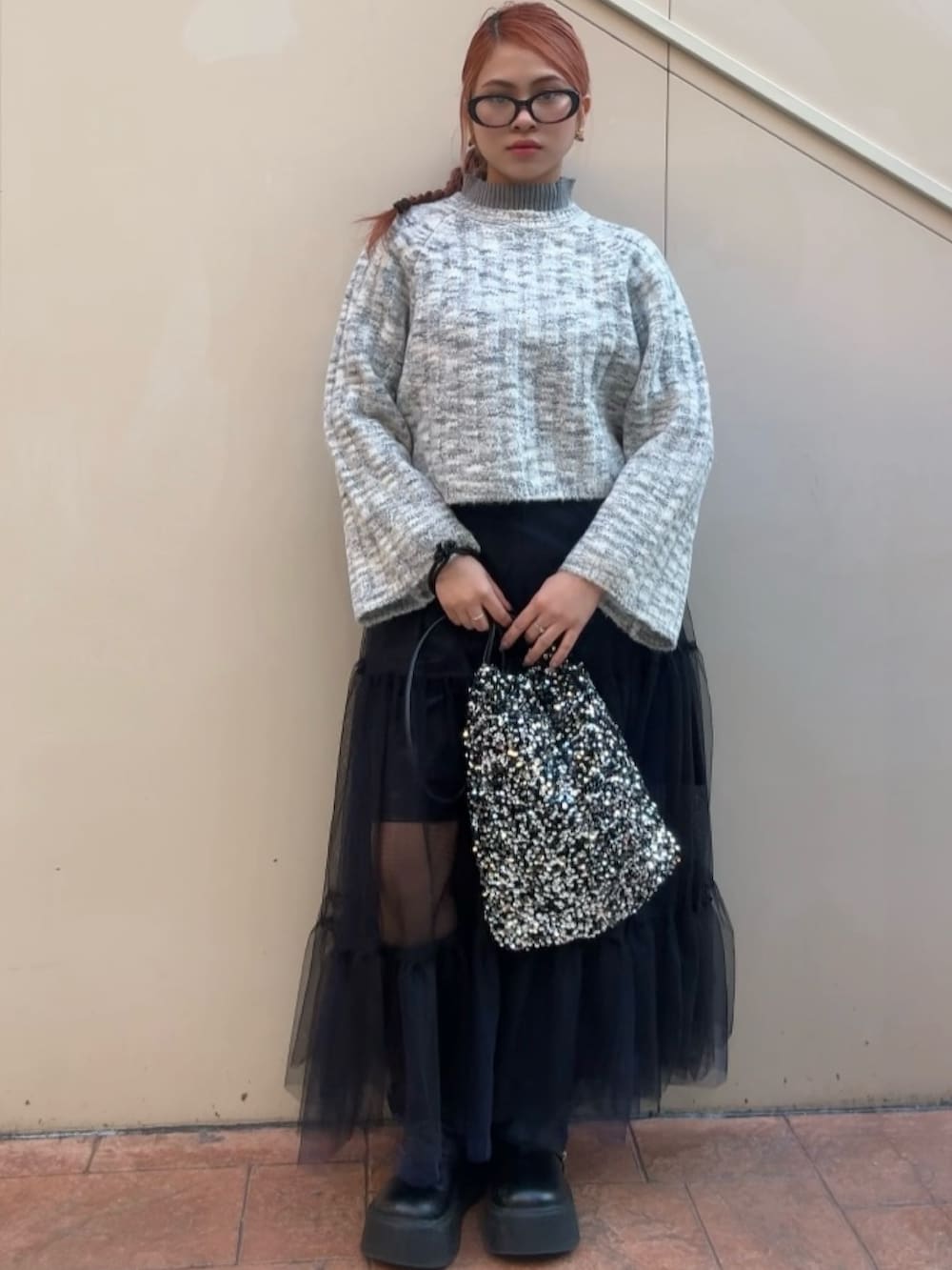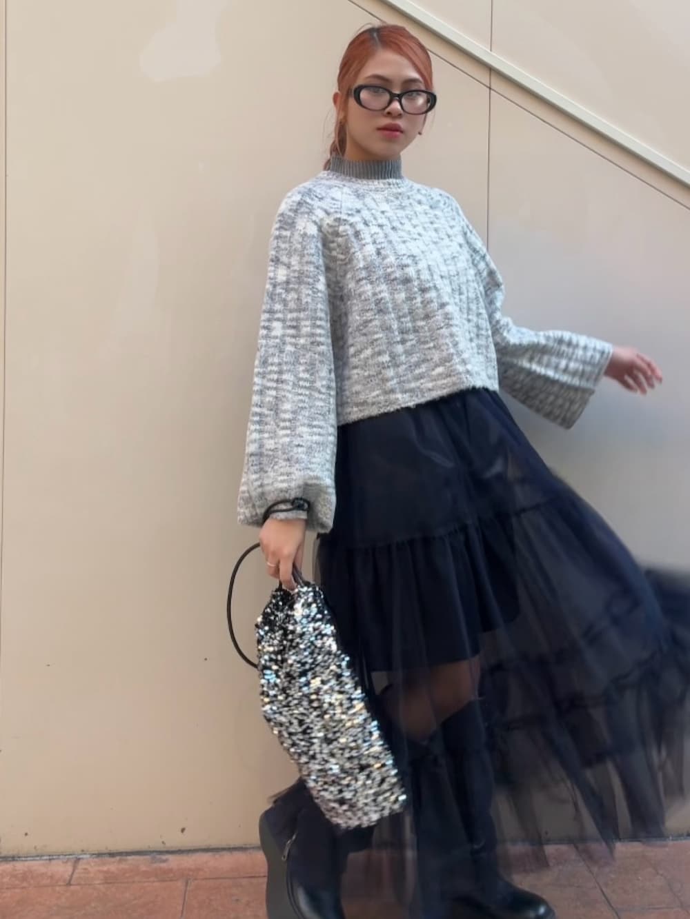 ニットのやわらかな質感と、チュールスカートの軽やかな揺れ感が絶妙なバランスを演出。