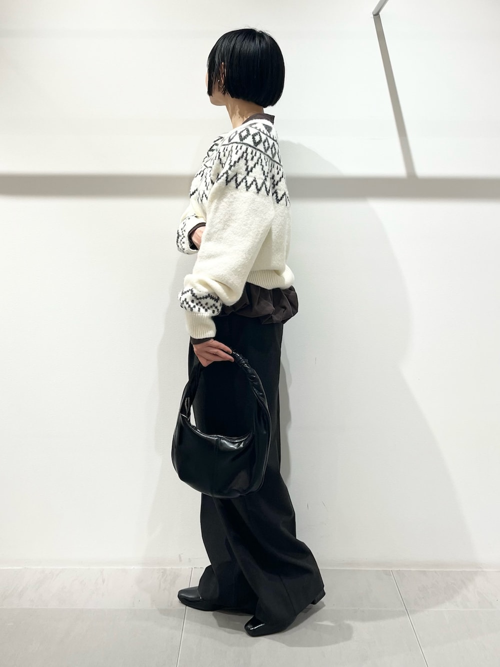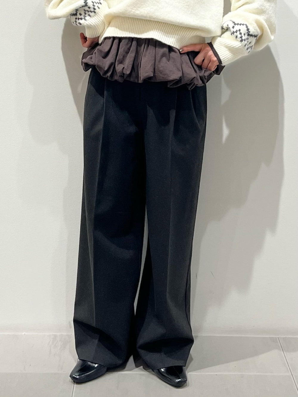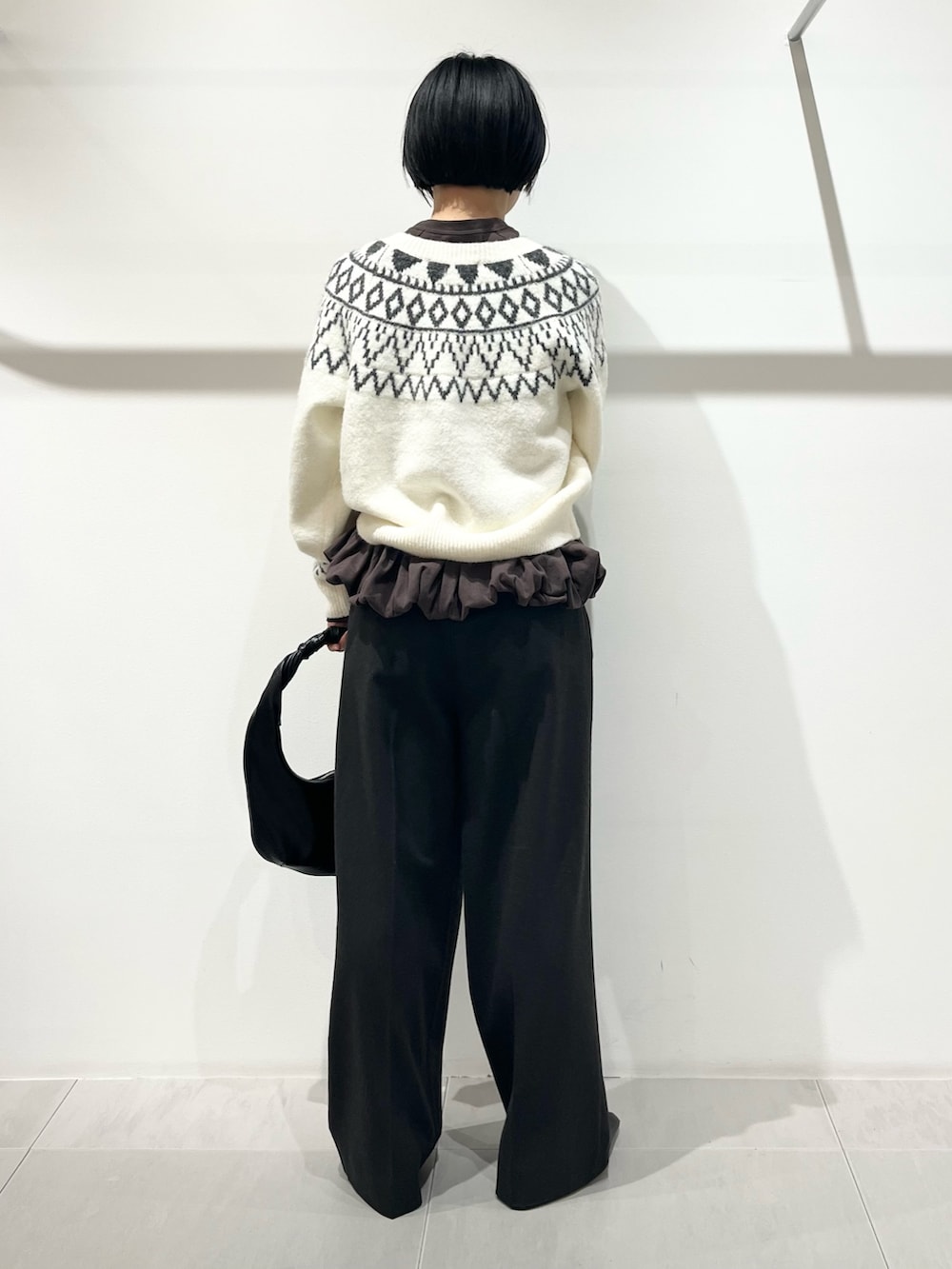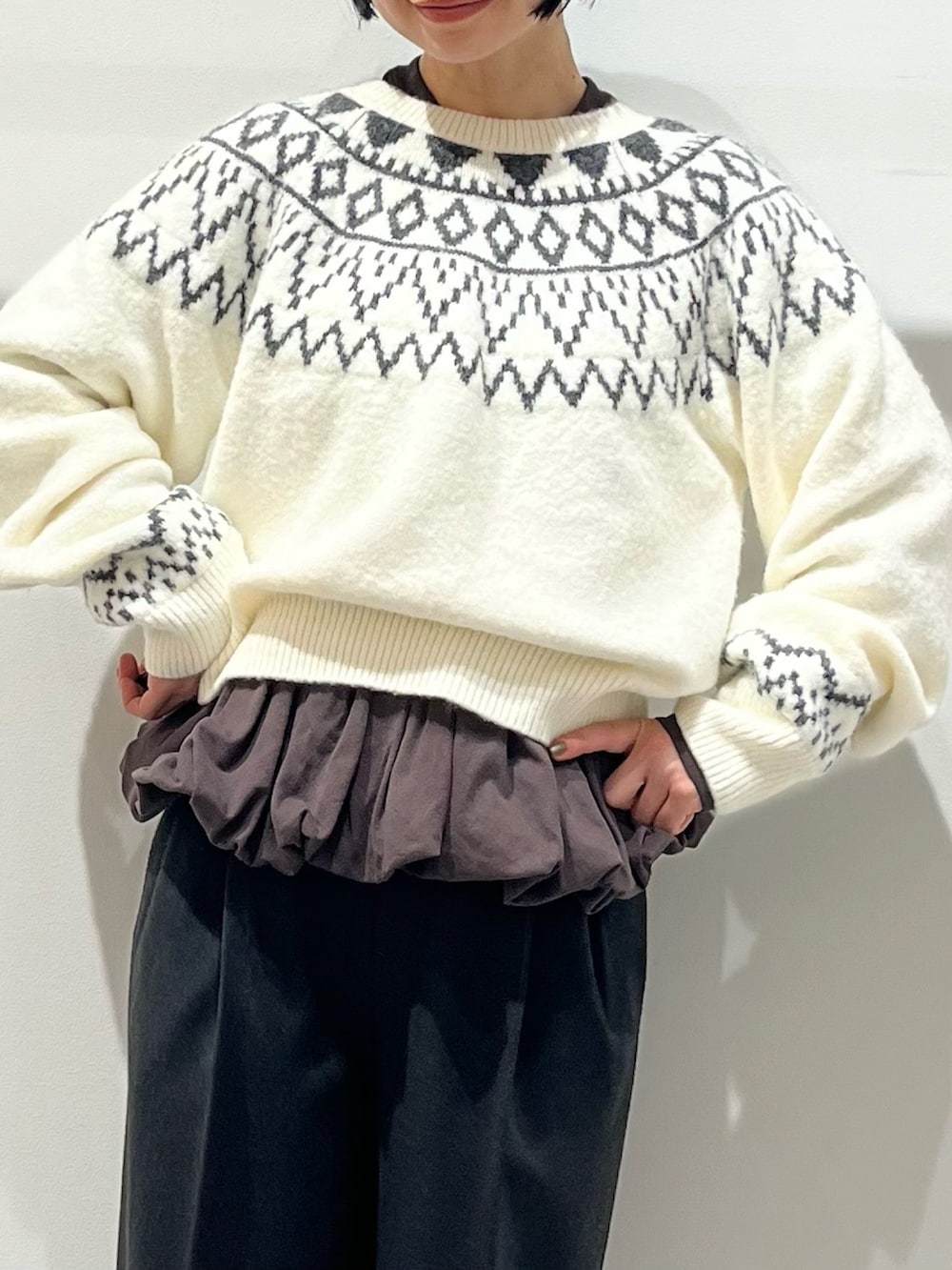ノルディック柄は冬らしくていいですね!レイヤードで今年っぽく合わせました。ノルディックのグレーとパンツの色を揃えて統一感を出しています。