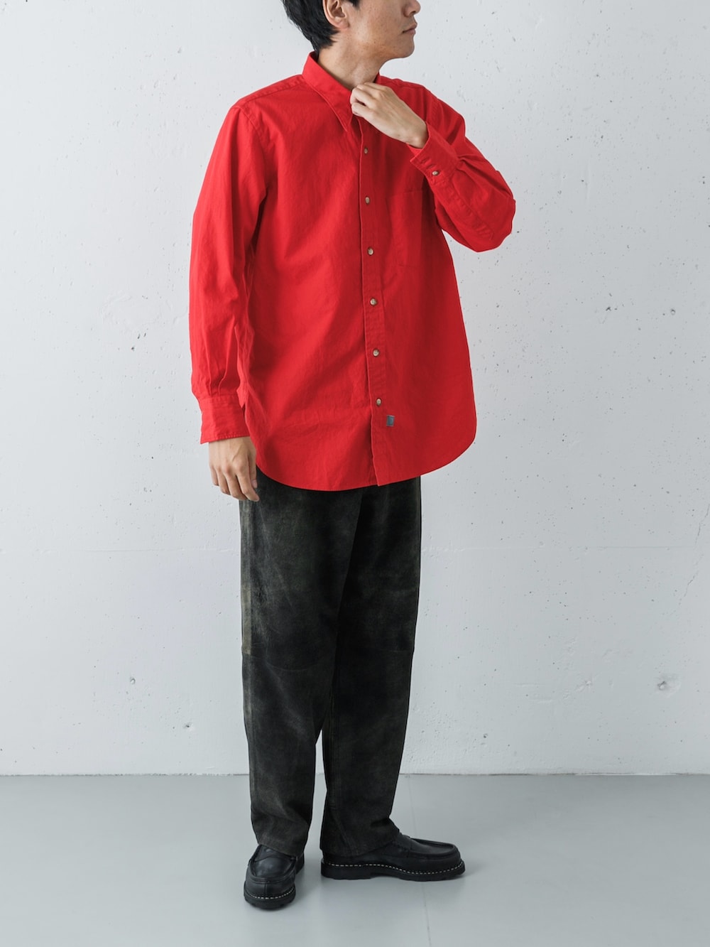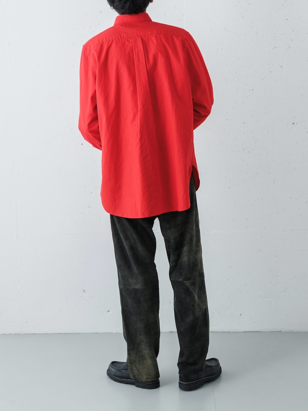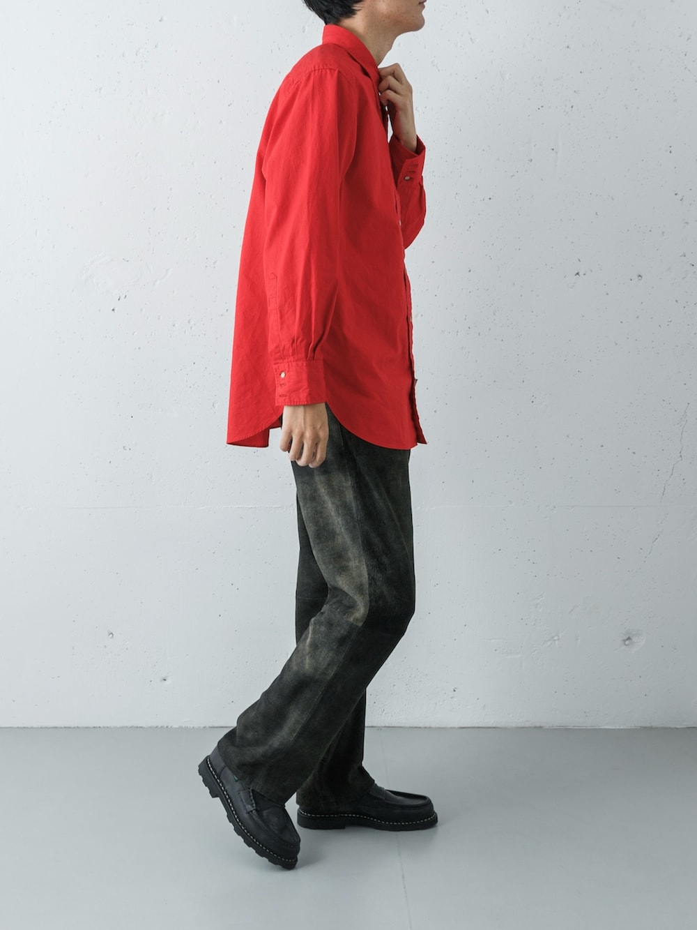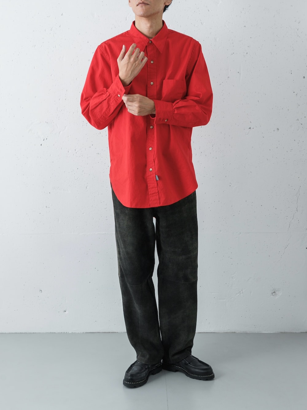 ボトムスには、あえて強い赤に負けない重厚感を持つSEVEN BY SEVEN別注のレザーワイドパンツをセレクト。ネイビーではなくBLACKを選ぶことで、赤×黒のロックでモードな配色を構築し、シャツの個性をラグジュアリーに引き締めています。