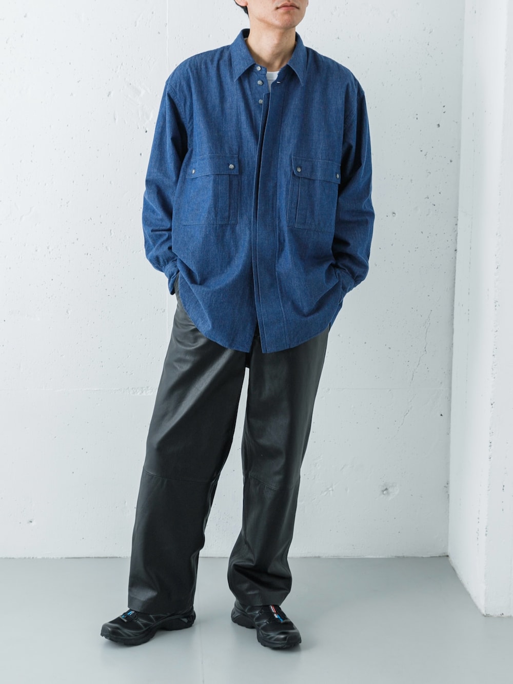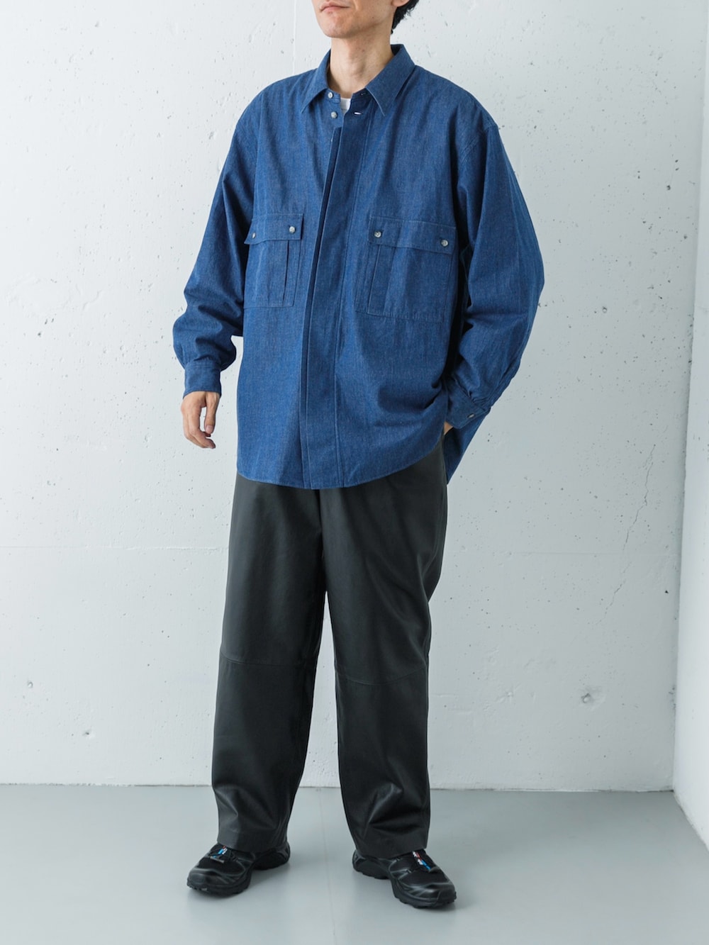 主役は、シャツの枠を超えた存在感を放つMarvine Pontiak Shirt MakersのCPOシャツ。深みのあるINDIGOカラーと、ブランド特有のたっぷりとしたオーバーシルエットが、上半身に独特のドレープと余裕を生み出しています。