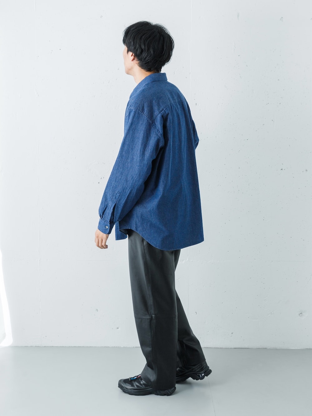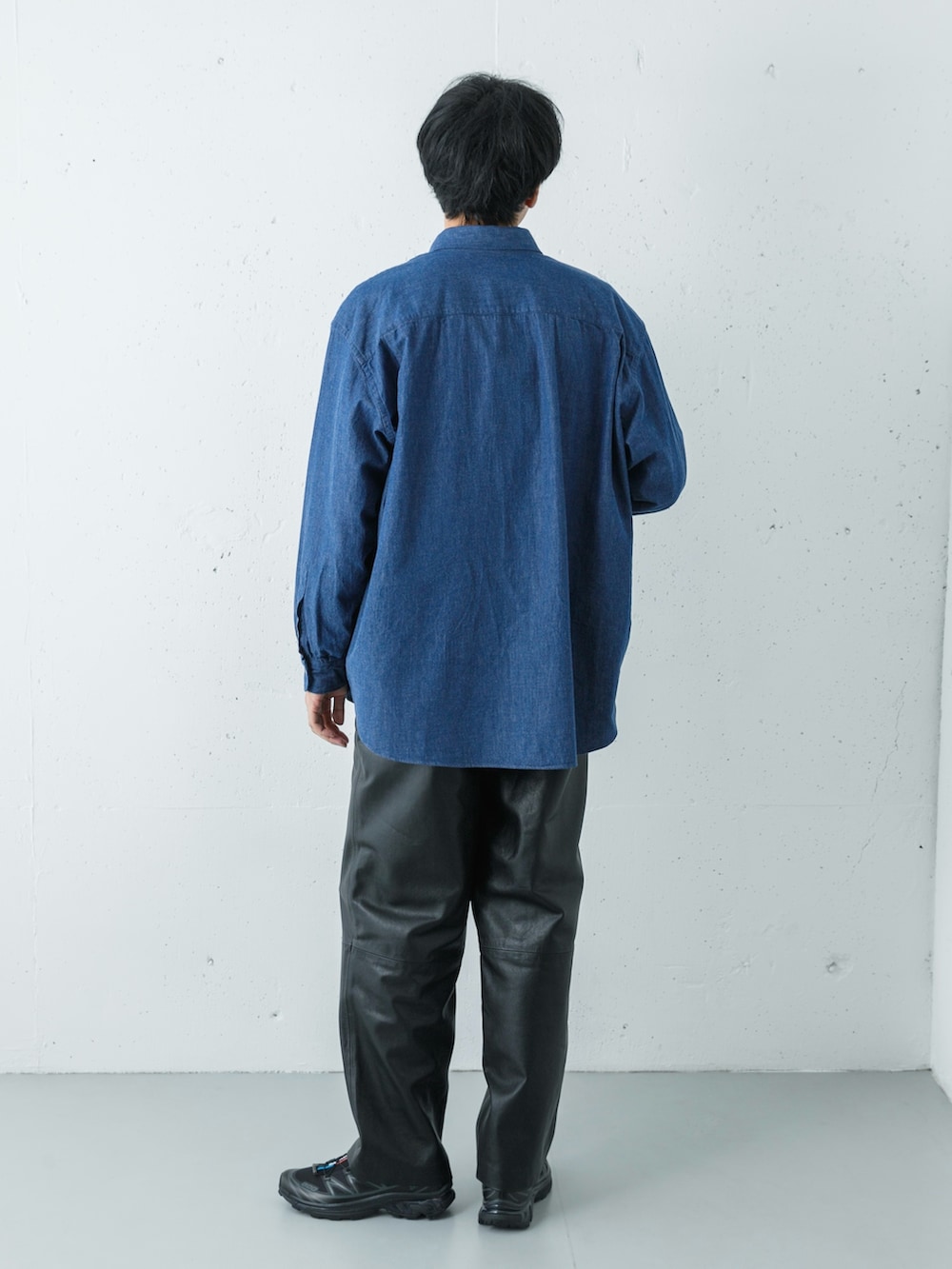 足元には、世界的に支持されるトレイルシューズSALOMON XT-6のブラックを投入。レザーパンツのクラシックな重厚さを、サロモンのテックなデザインと機能美が都会的に「中和」し、モードとアウトドアが交差する洗練された足元に仕上げています。
