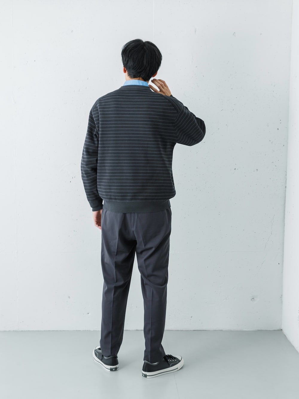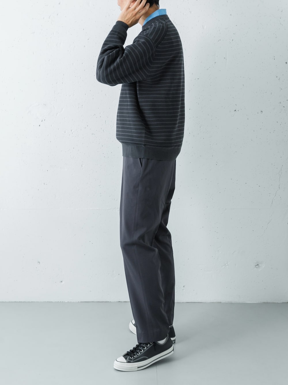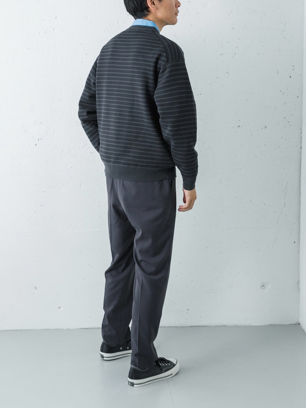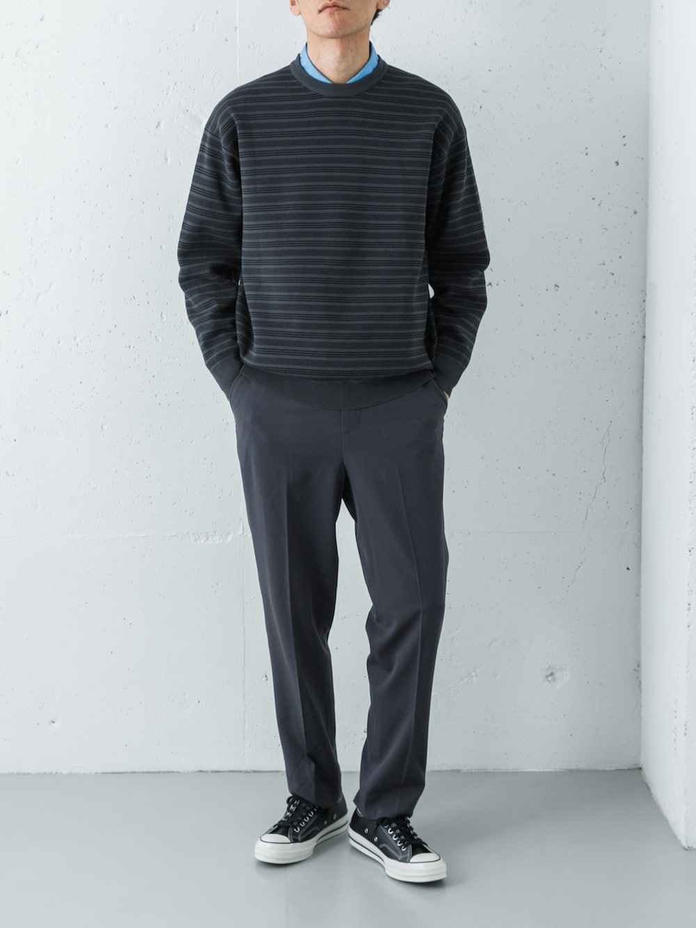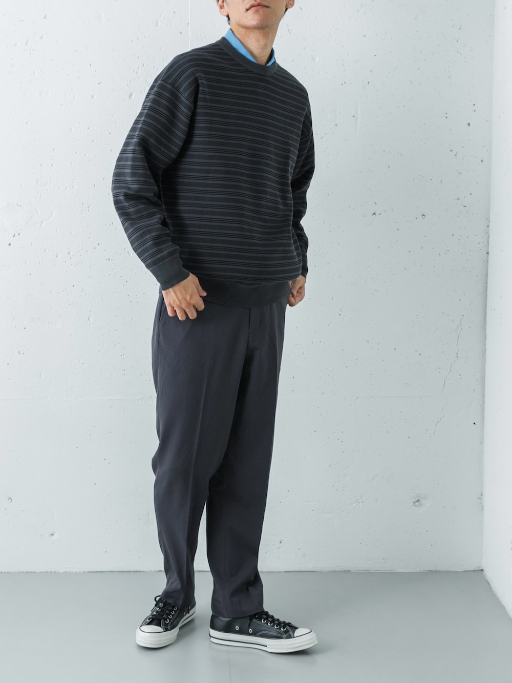 トップスは、サックスブルーのシャツに、チャコール×白のボーダーニットを重ねた、爽やかさと落ち着きを両立させたレイヤード。高密度タイプライターシャツのパリッとした襟元が、柔らかいニットの質感を引き締め、清潔感のある顔周りを作っています。