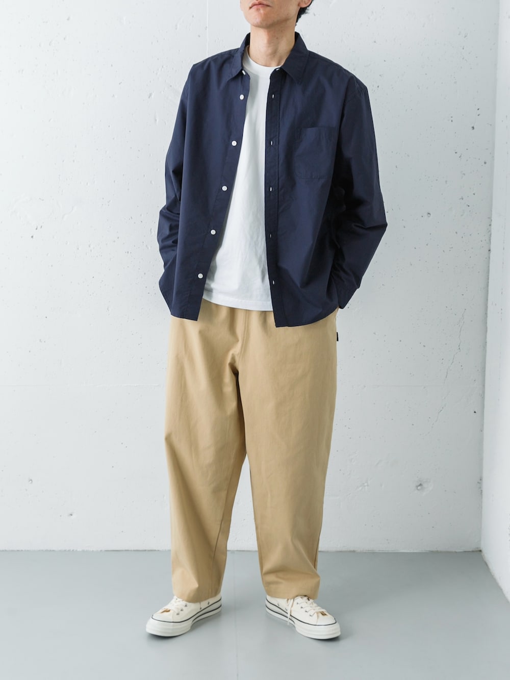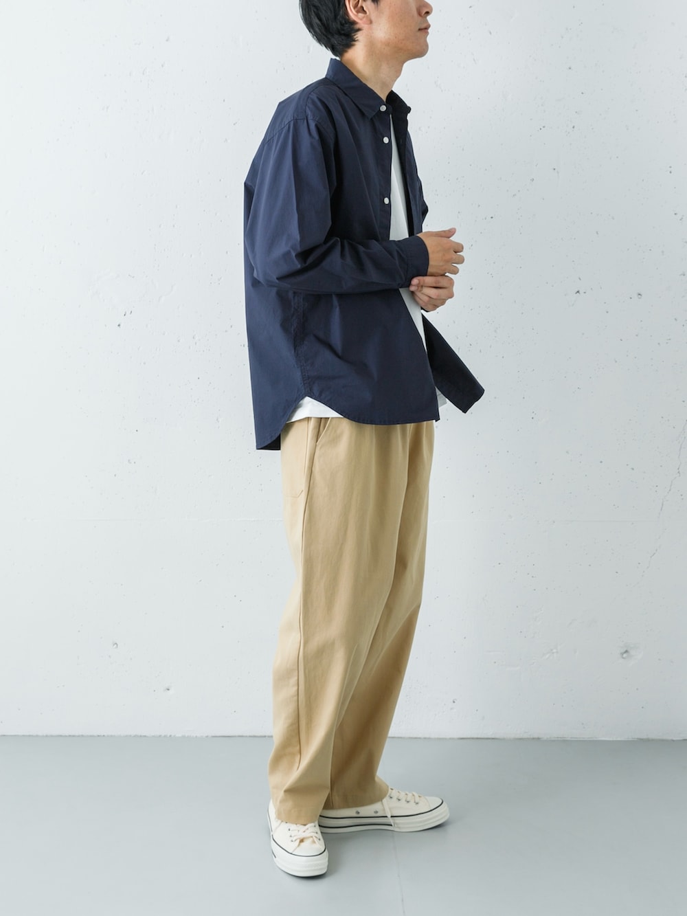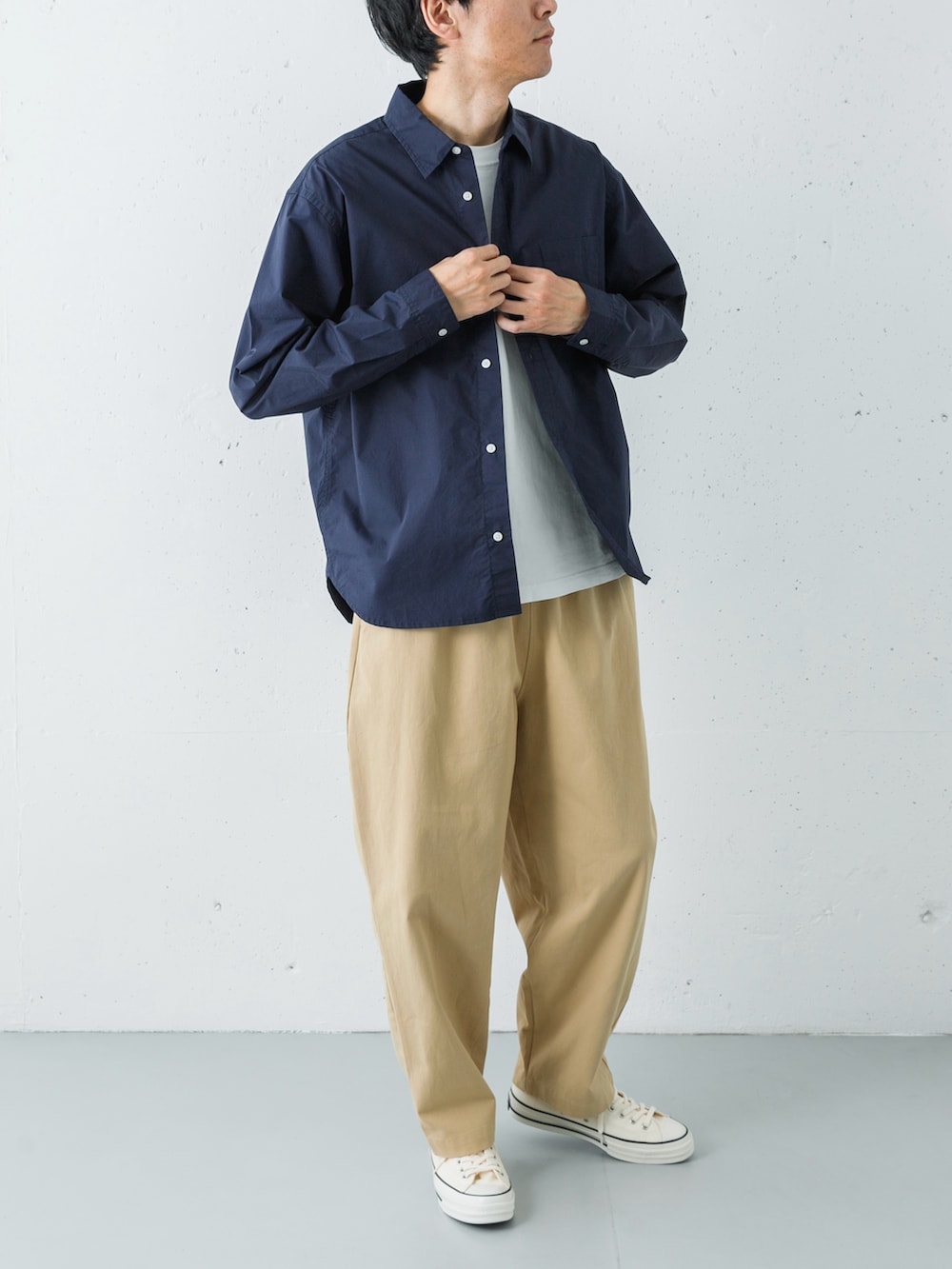 ボトムスには、ネイビーと相性抜群のベージュのワイドイージーチノをセレクト。ワイドなシルエットが、開けたシャツのボリューム感と絶妙にマッチし、リラックスした「大人の休日スタイル」を構築しています。ネイビーの「硬さ」をベージュの「柔らかさ」が中和する、非常にバランスの取れた配色です。
