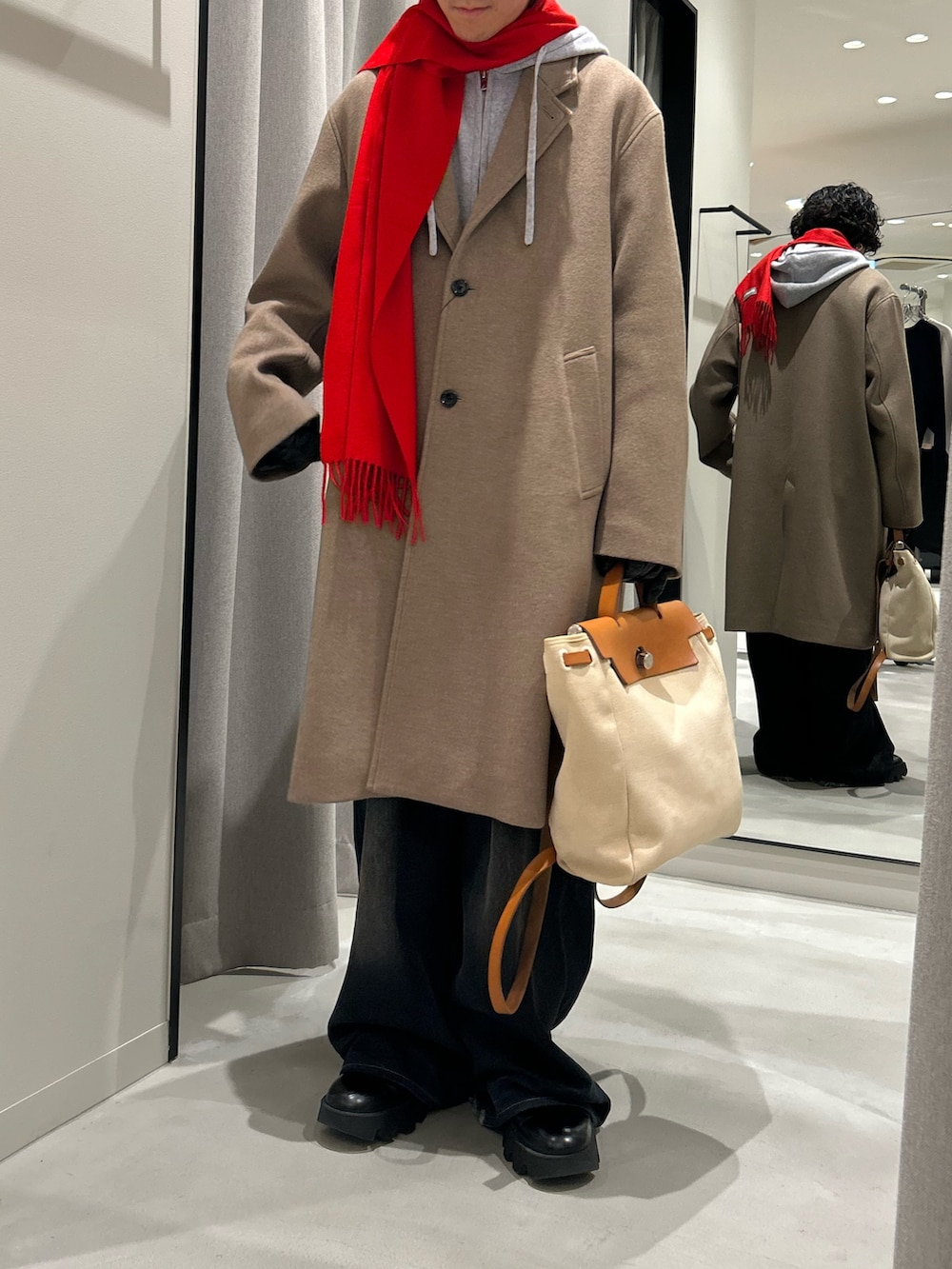 ベージュのリラックスしたシルエットのチェスターコートにカシミヤのグレーフーディをレイヤード。差し色で赤を入れてバッグはvintage hermes 🍊