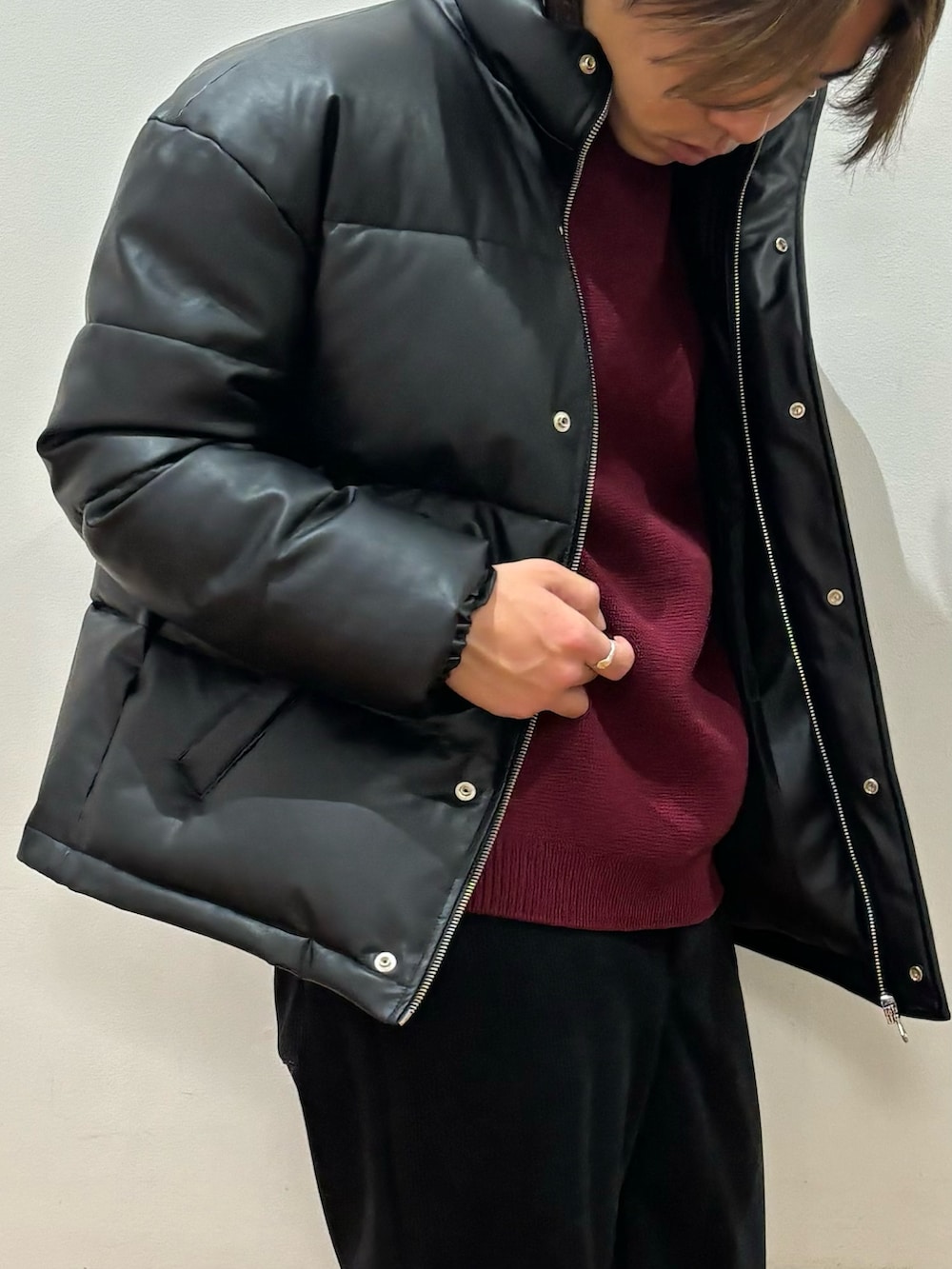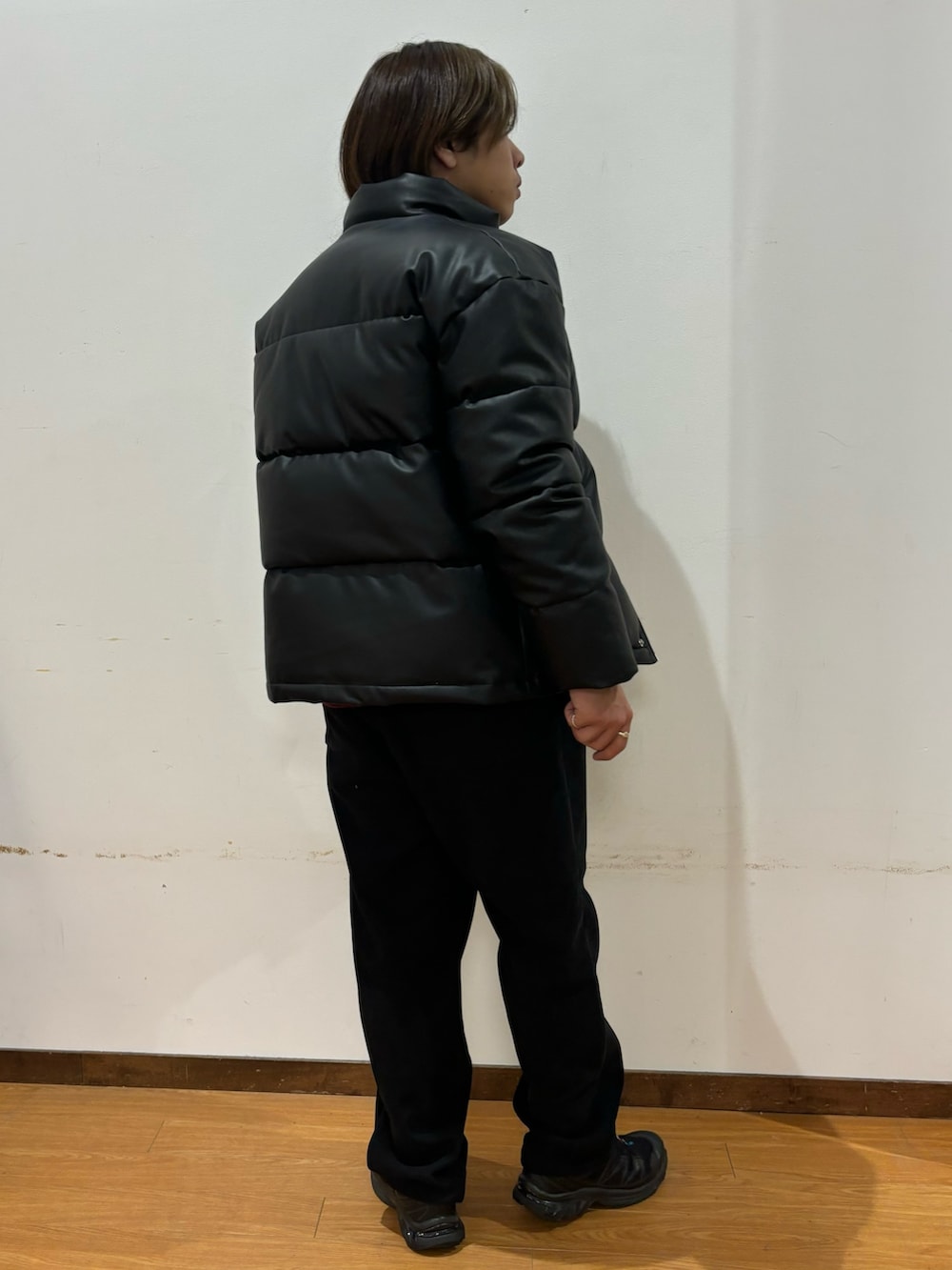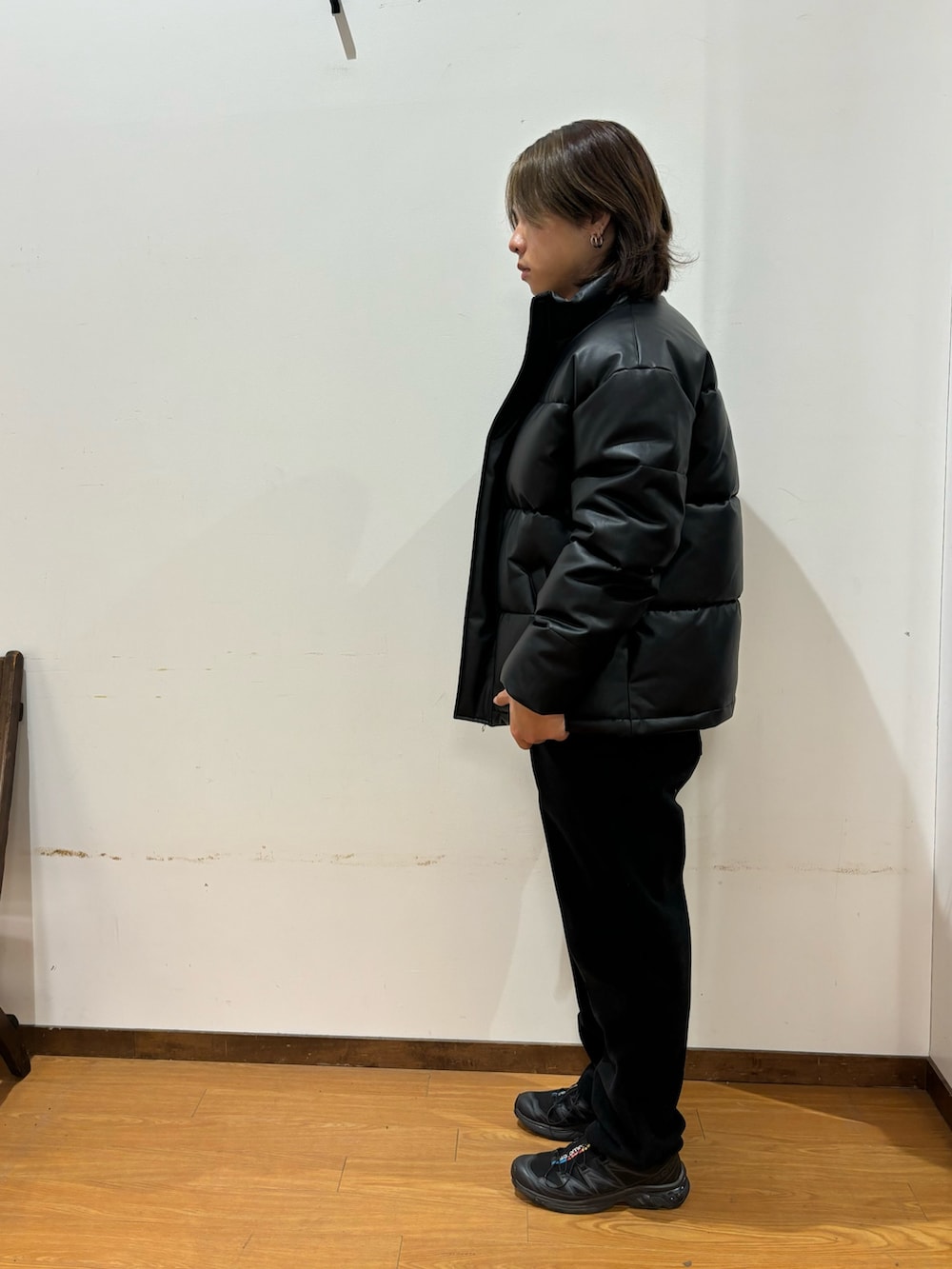 トップスのプルゾンは中綿が入っており、厚みがありとても暖かいです!合成皮革なので風を通さないのもポイントです!
