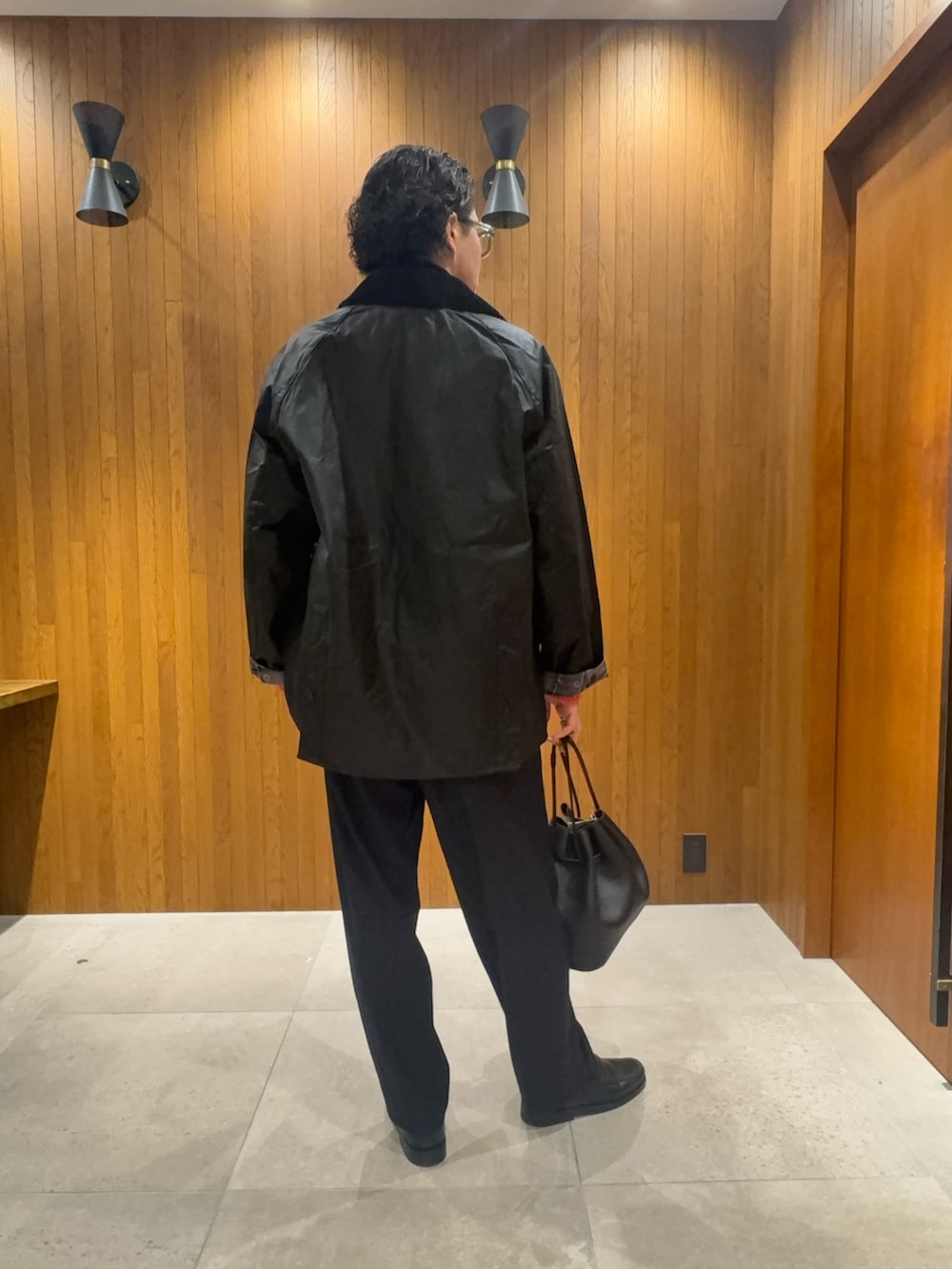 ・シャギーカーディガンを主役に、Barbourは前を開けてラフに