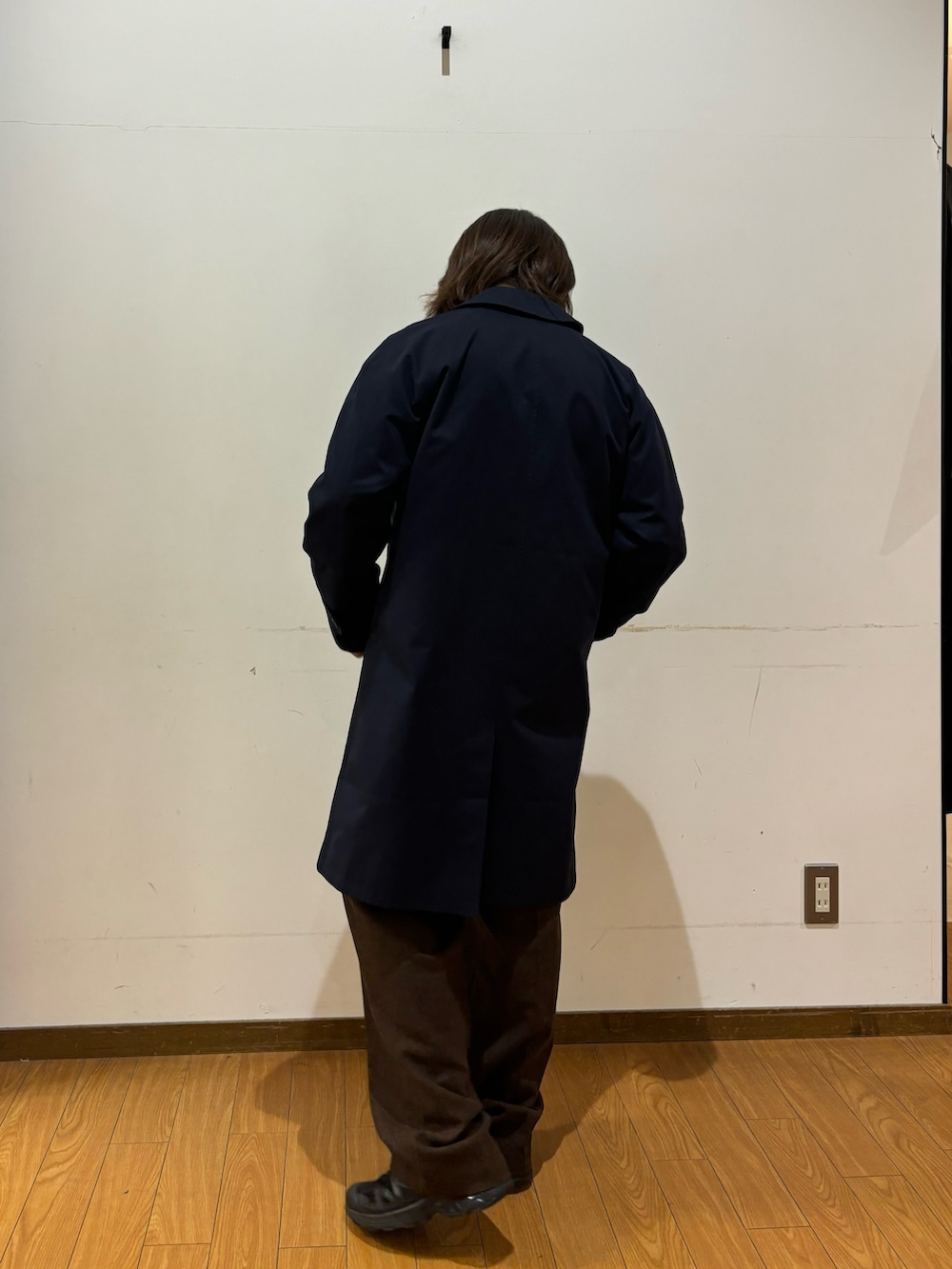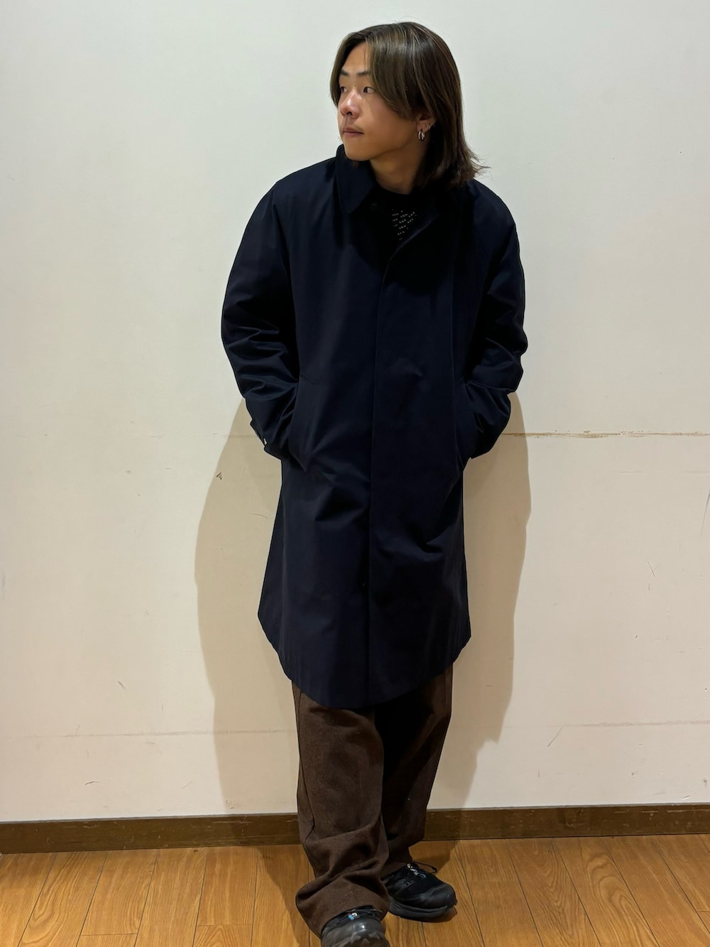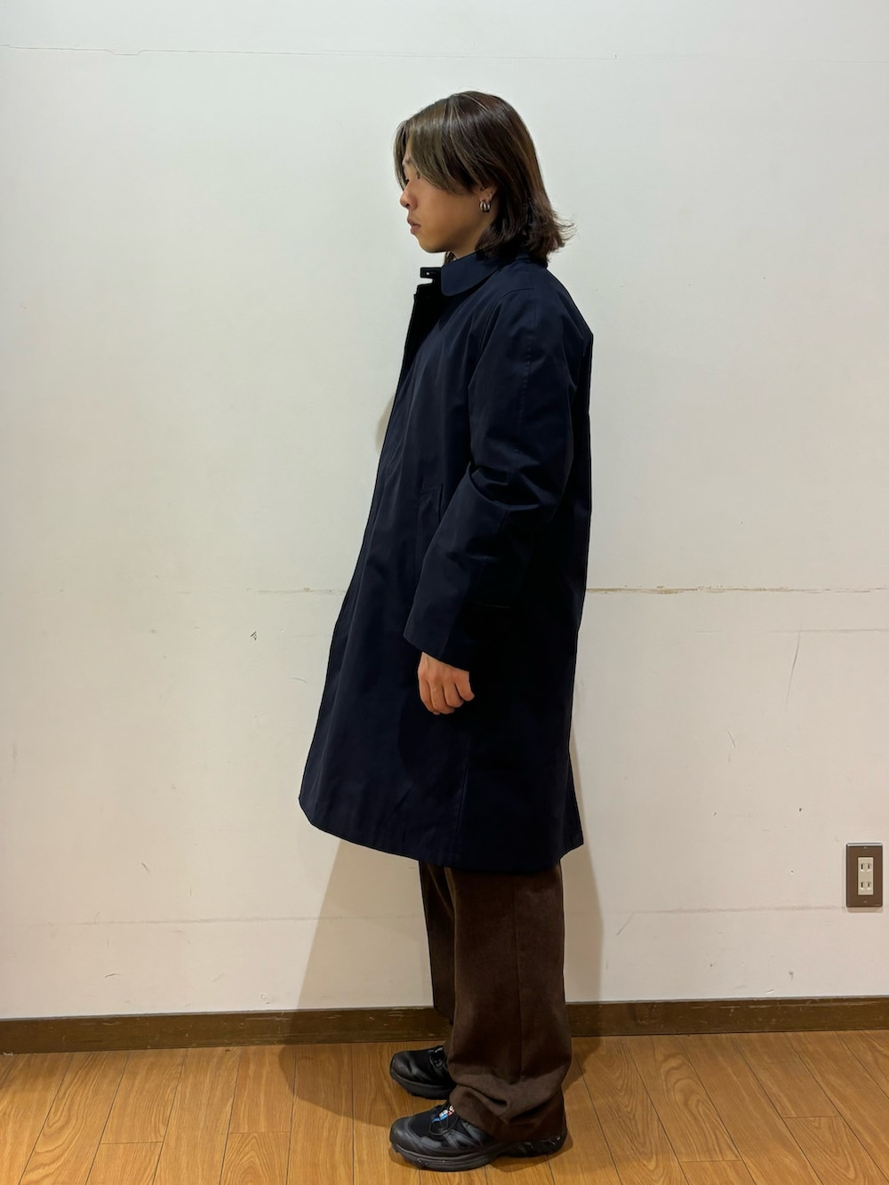 トップスのコートは生地に高級感があります!フォーマルなコーデでもカジュアルでもサマになります!撥水加工がされており、雨の中でも着ることができるのもポイントです!