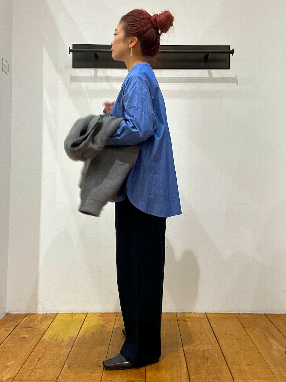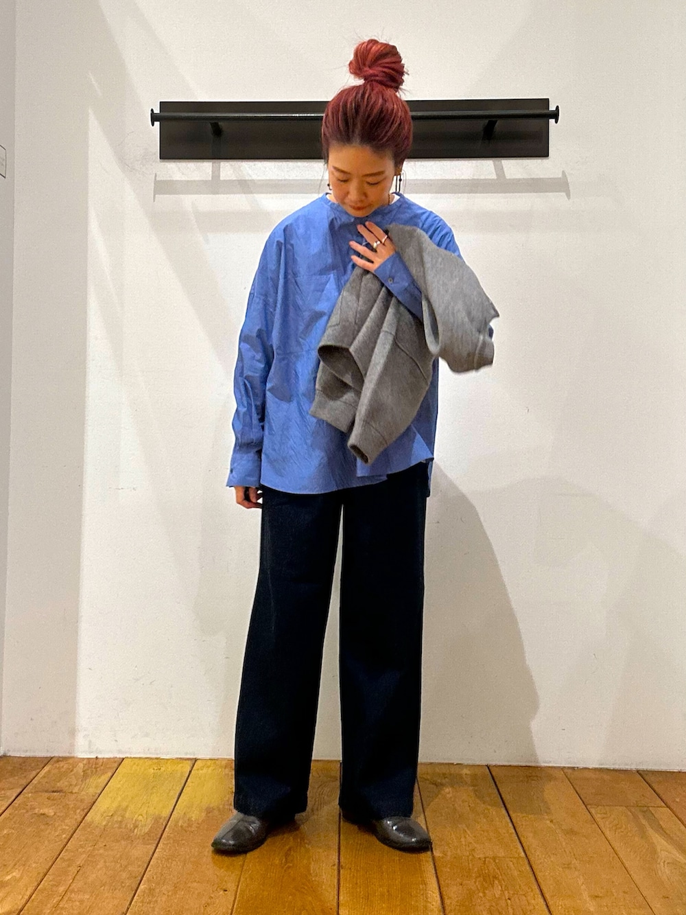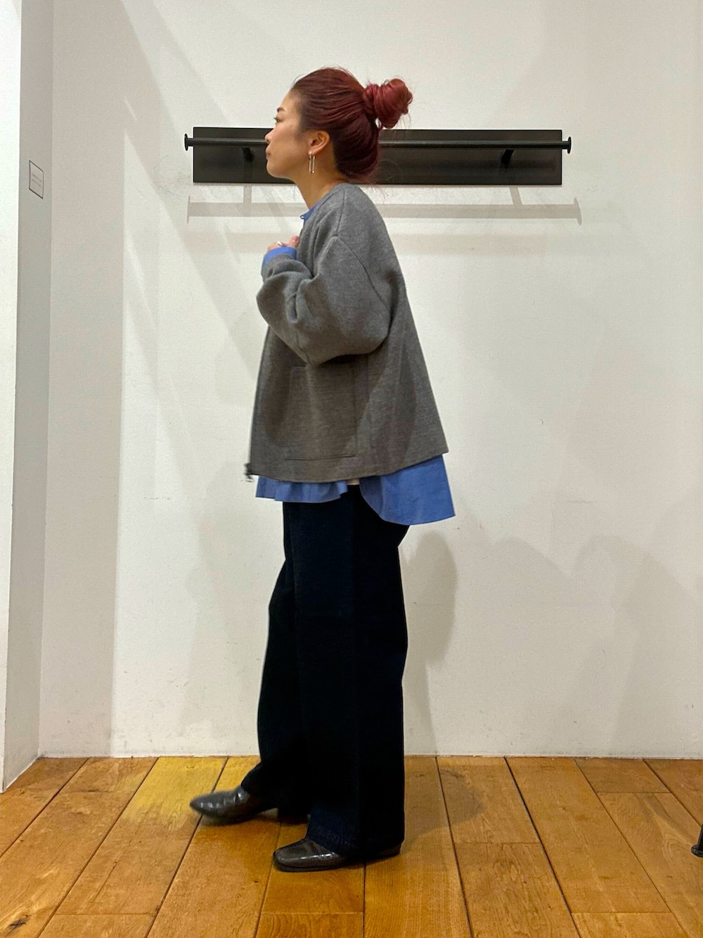 しっかり厚めのニットカーディガンに、鮮やかなブルーのシャツを仕込みました🫐