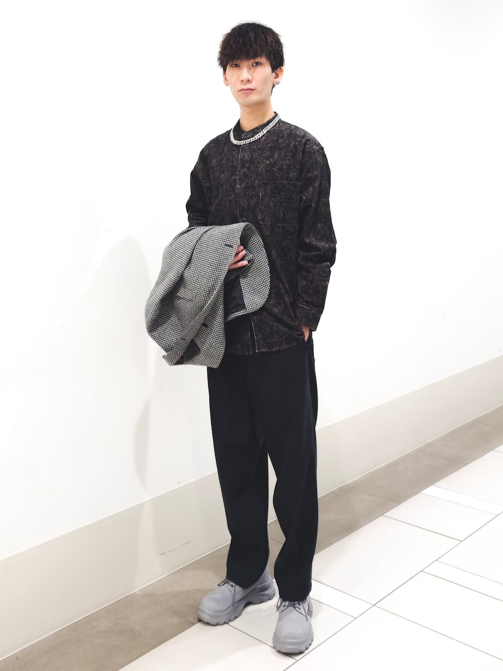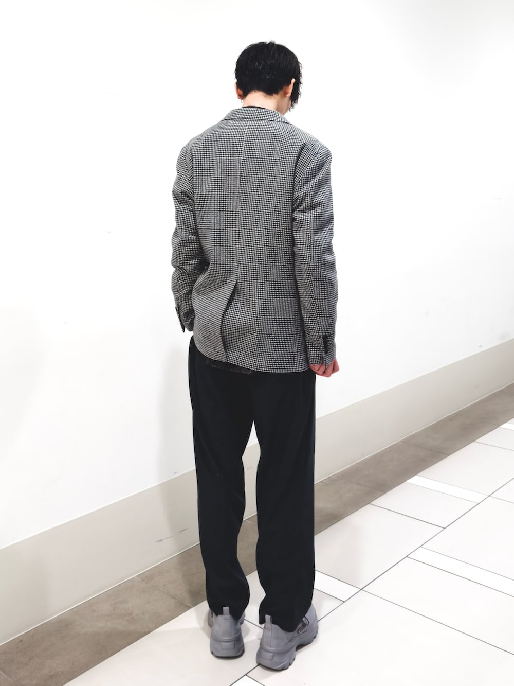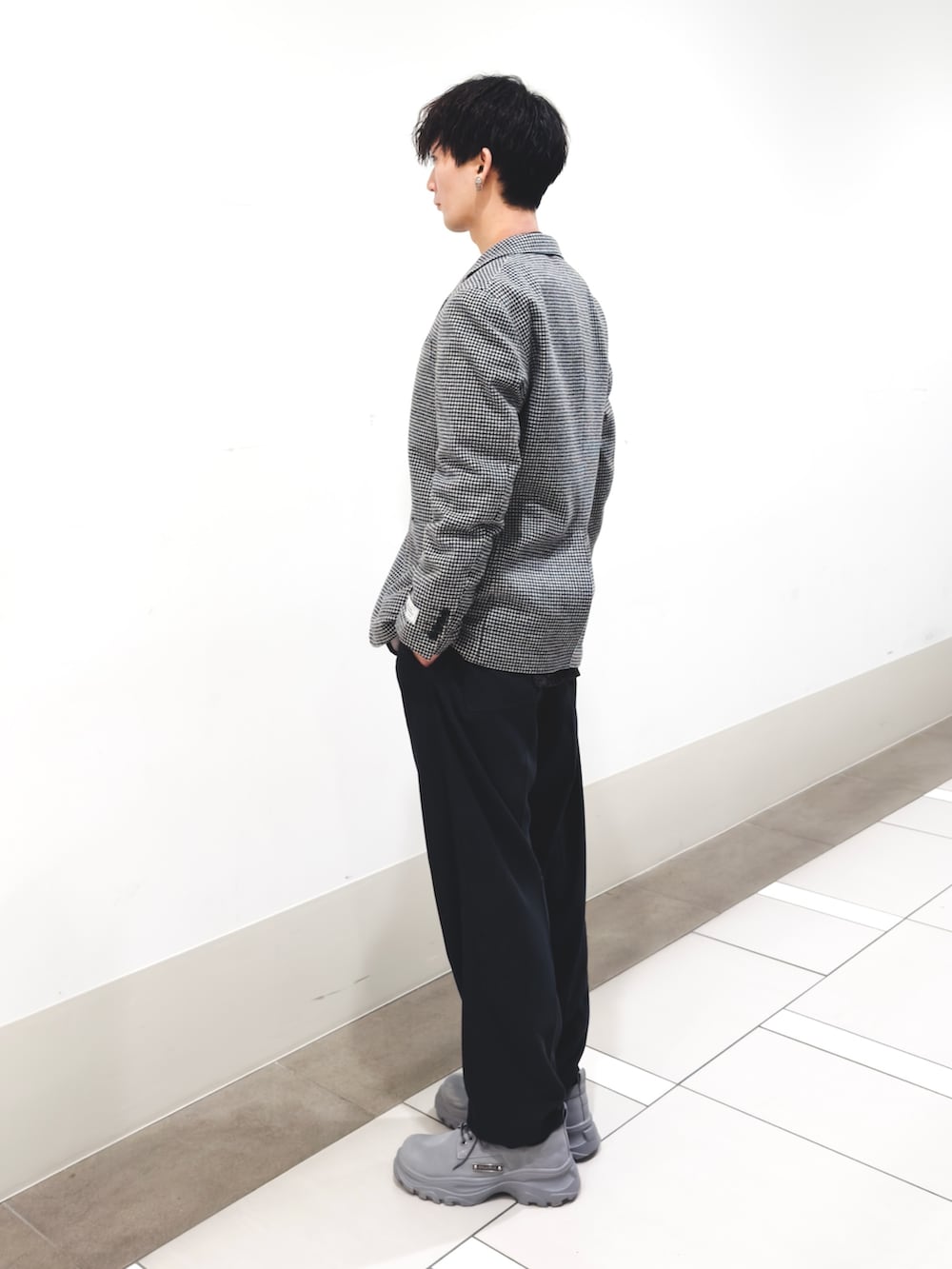 表情のあるコーデュロイ素材と、クラシカルな千鳥柄を掛け合わせることで、程よく存在感のある着こなしに仕上げています。