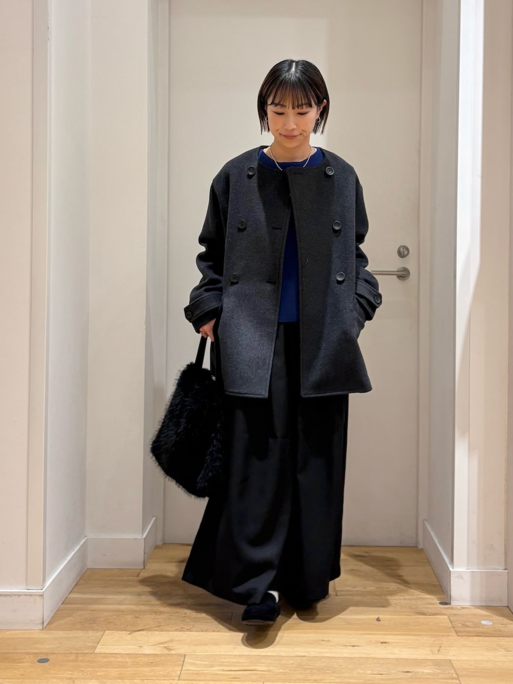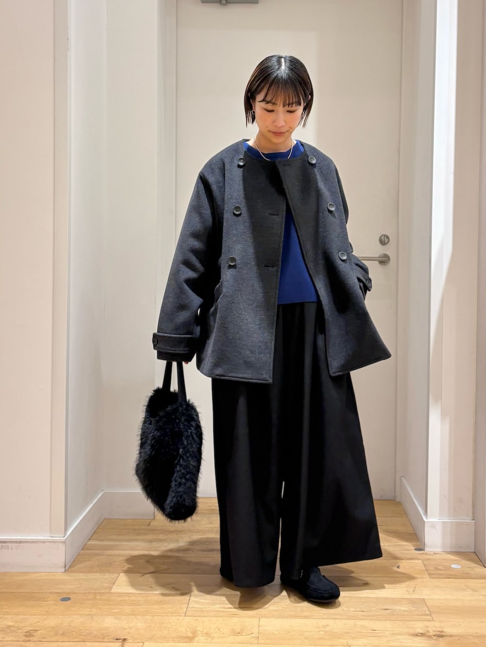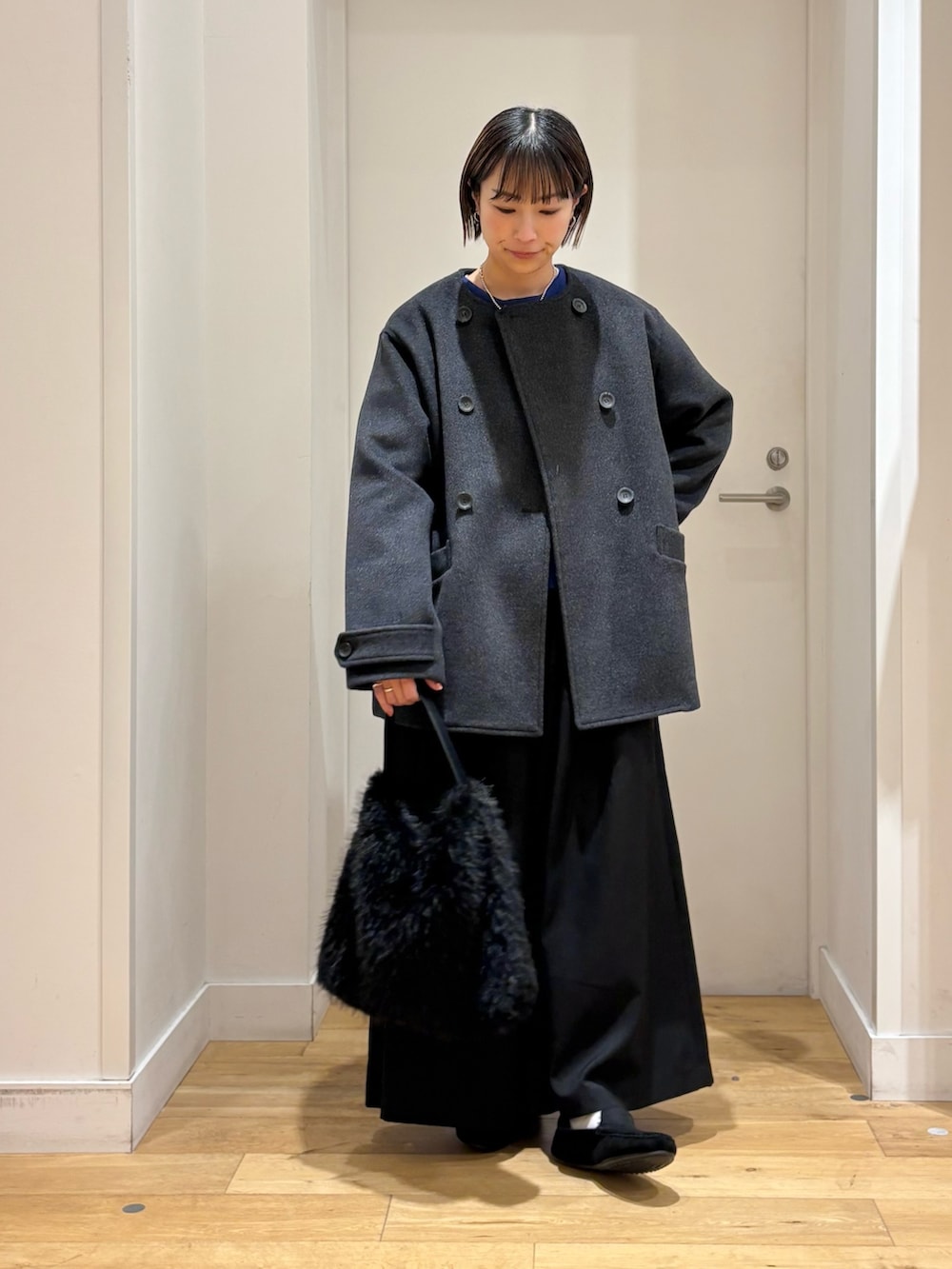 コートは、ノーカラーなので首元をスッキリと見せてくれて、タートルネックやストール合わせもしやすいですよ!