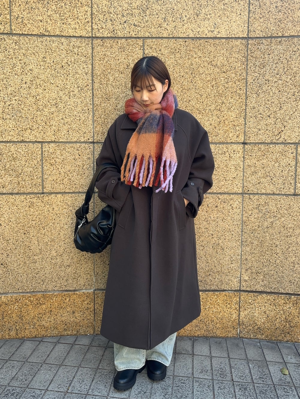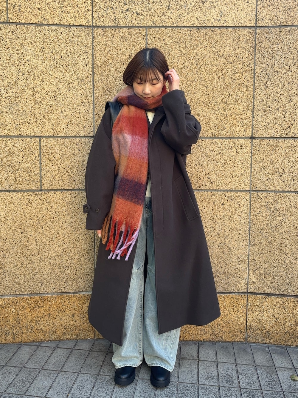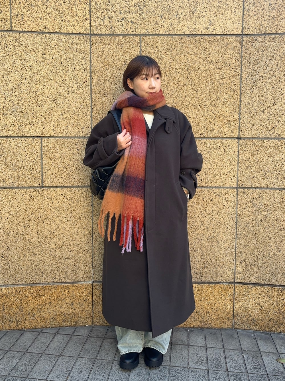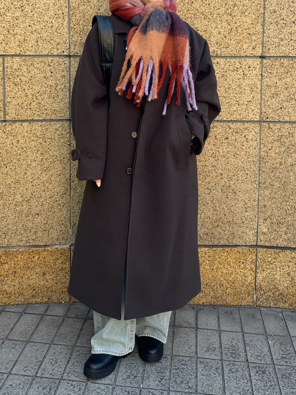 暗いカラーのロングコートで色味が重たくなりがちですが色物のマフラーを巻いて差し色にするとコーデの雰囲気が変わるのでオススメです!デニムで明るめの色を持ってくるのも◎