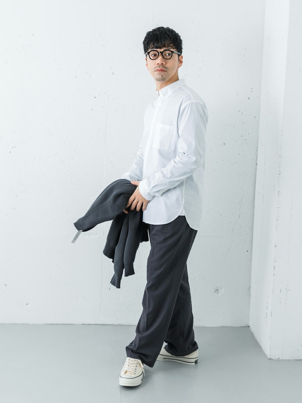 カラーは暗めなカラーを上下で統一してシャツとスニーカーは白で差し色に爽やかな印象もプラス!
