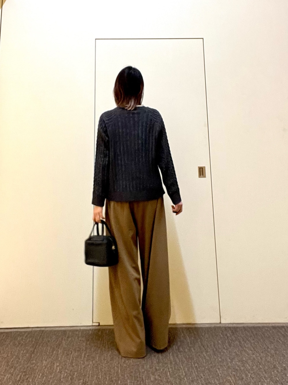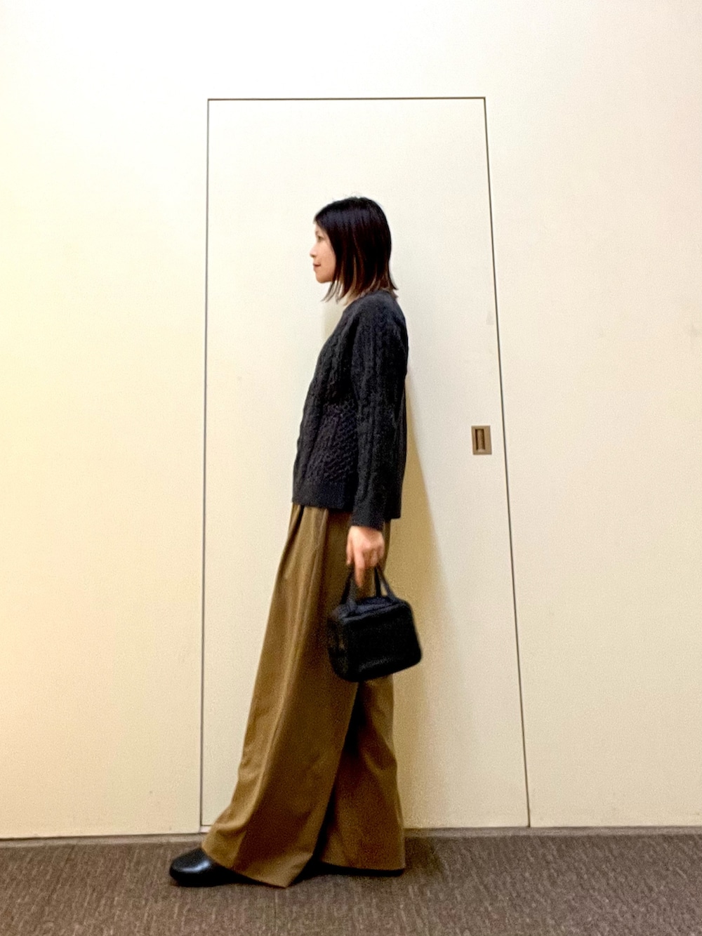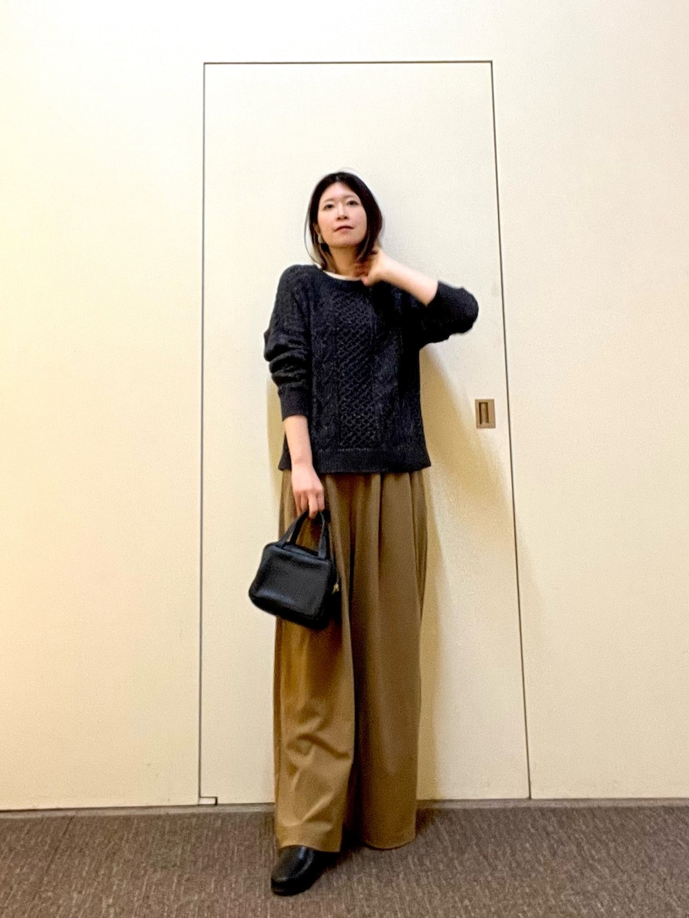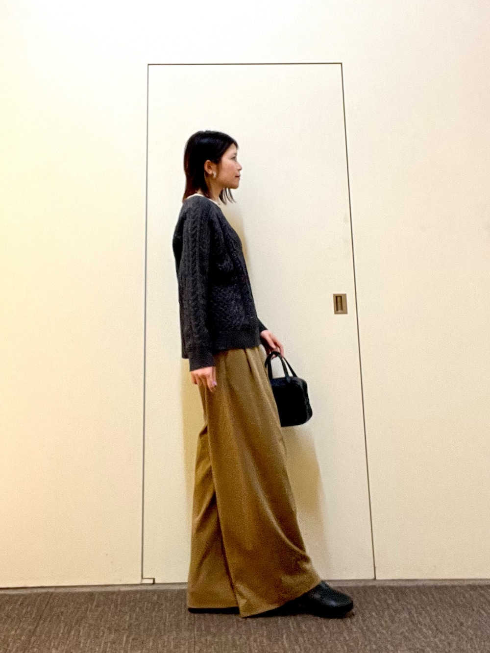 ニットはもちっとした柔らかい肌触りでとても着心地が良いです!首周りの配色が明るいのでチャコールでも重たくならないです👌🏻